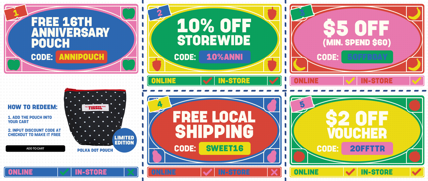 Voucher 1 — Free Limited Edition 16th Anniversary Pouch: Redemption valid with any online purchase (no min spend). Limited to the first 100 customers - while stocks lasts.
