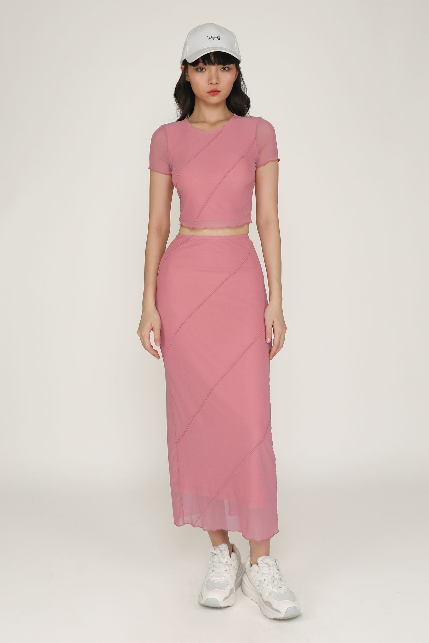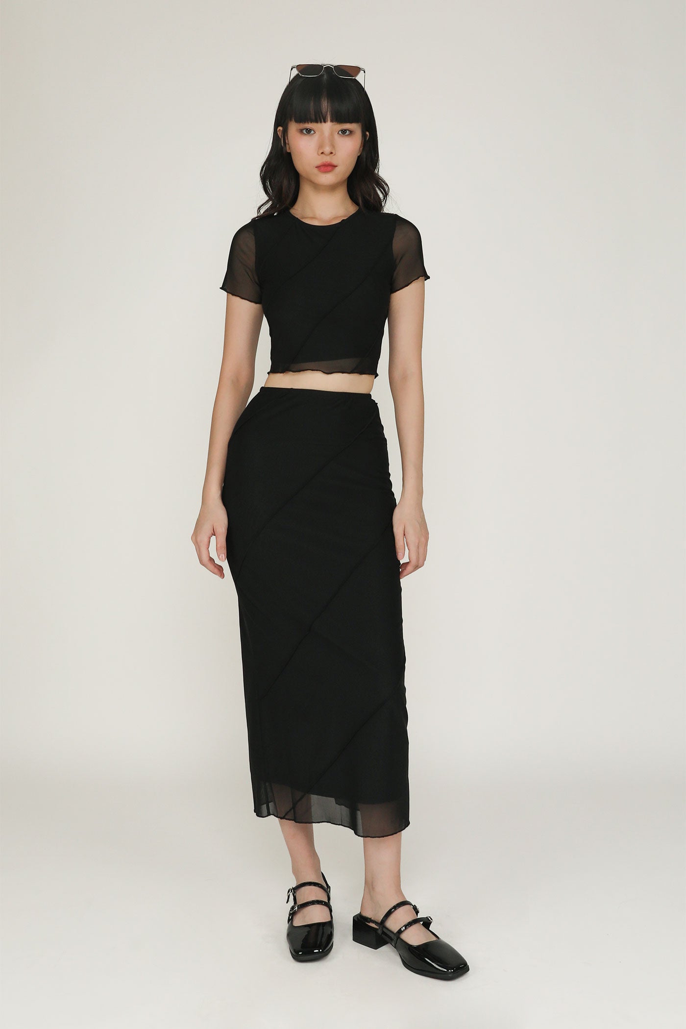 Change up your basic skirts with Clarice. Clarice Mesh Midi Skirt incorporates mesh textures in a timeless fashion to create a feminine and versatile piece. It also flaunts sleek diagonal panelling details for an elegant touch. For special occasions, pair it with our Kylin Mesh Sleeve Top for the ultimate mesh co-ord look.