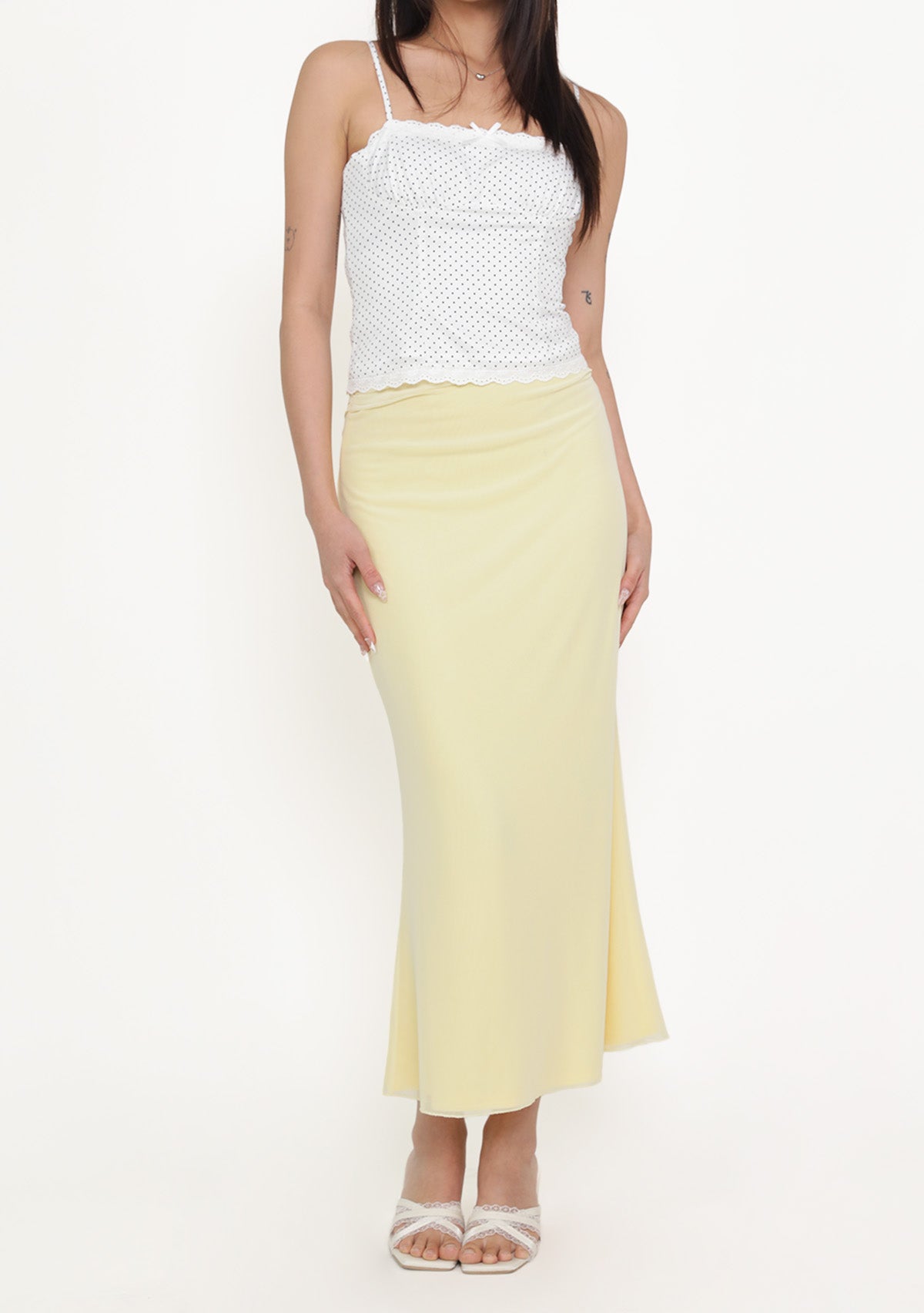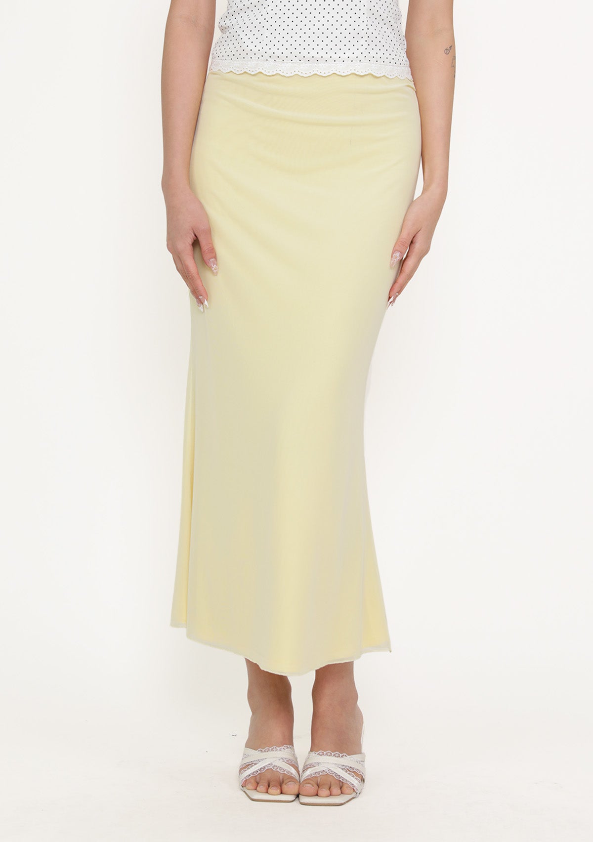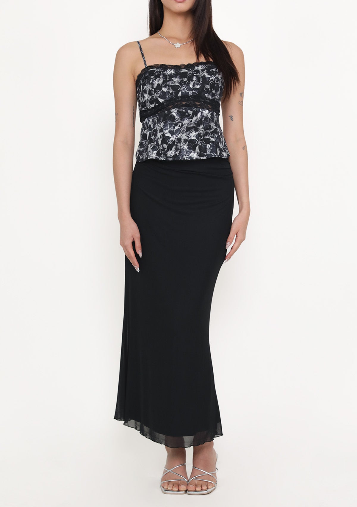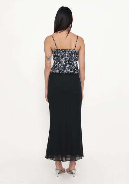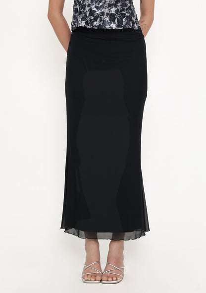 Elara Mesh Fishtail Maxi Skirt is a layered maxi skirt with a mesh outer layer and cotton spandex lining, featuring a fishtail silhouette and concealed side zip.