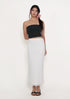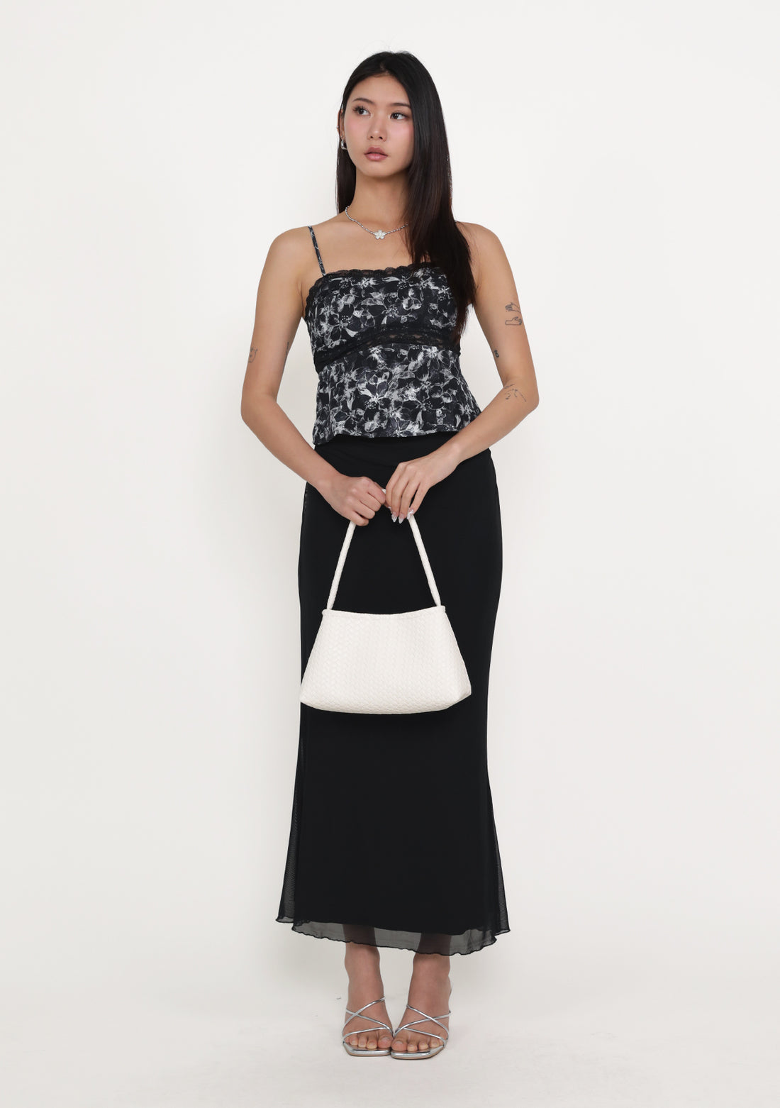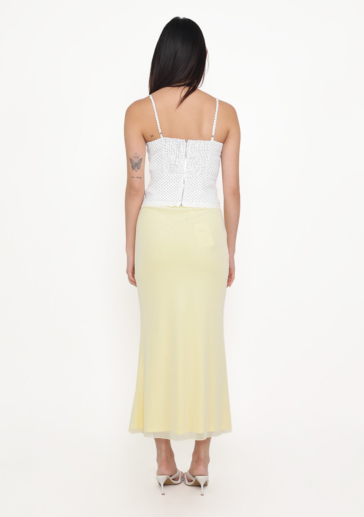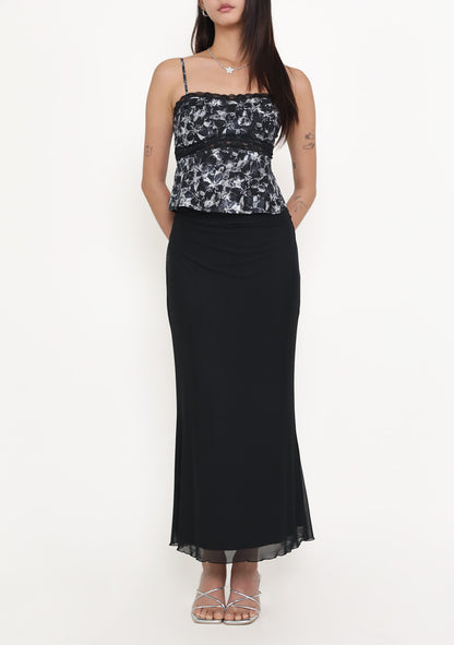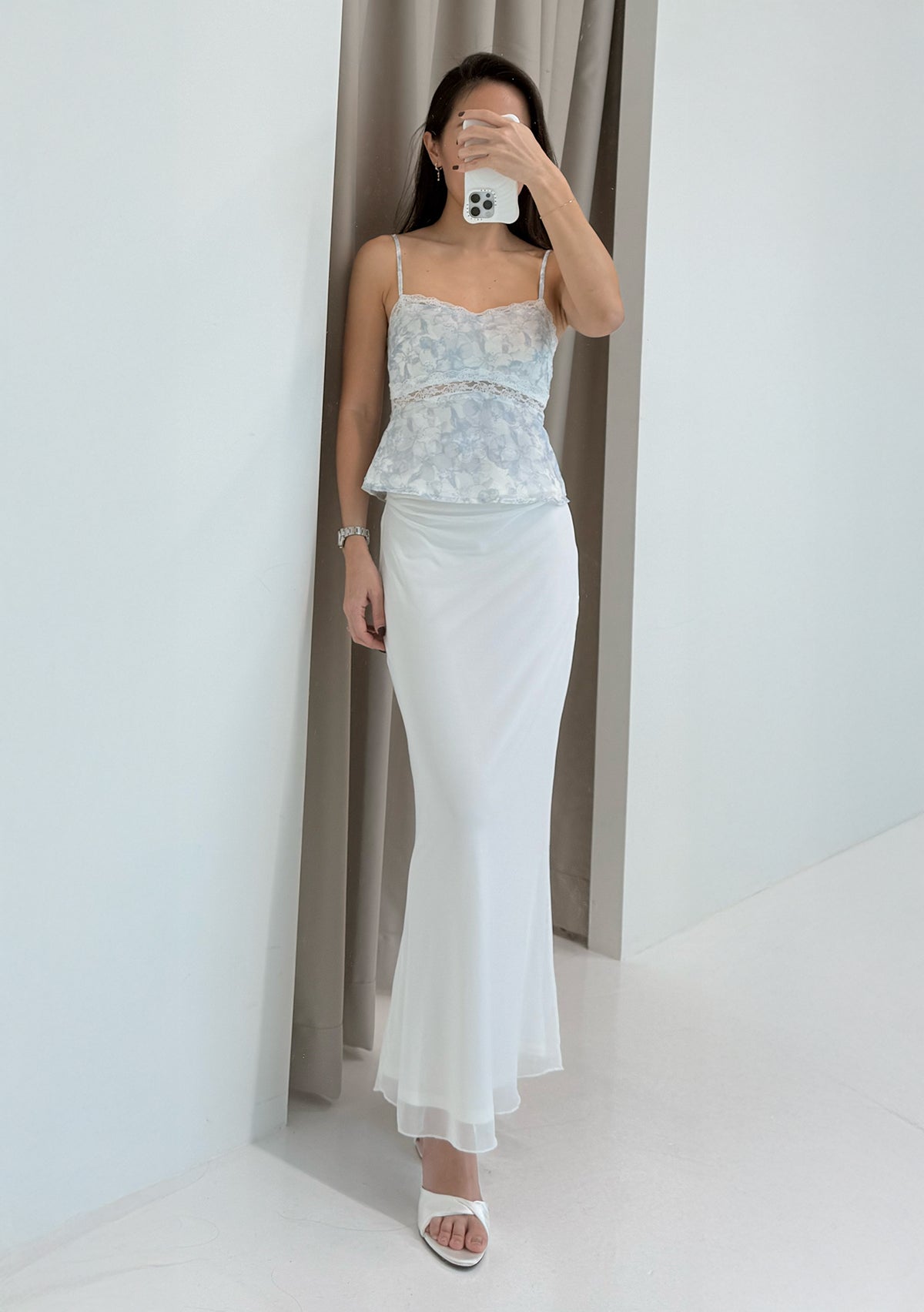 Elara Mesh Fishtail Maxi Skirt is a layered maxi skirt with a mesh outer layer and cotton spandex lining, featuring a fishtail silhouette and concealed side zip.