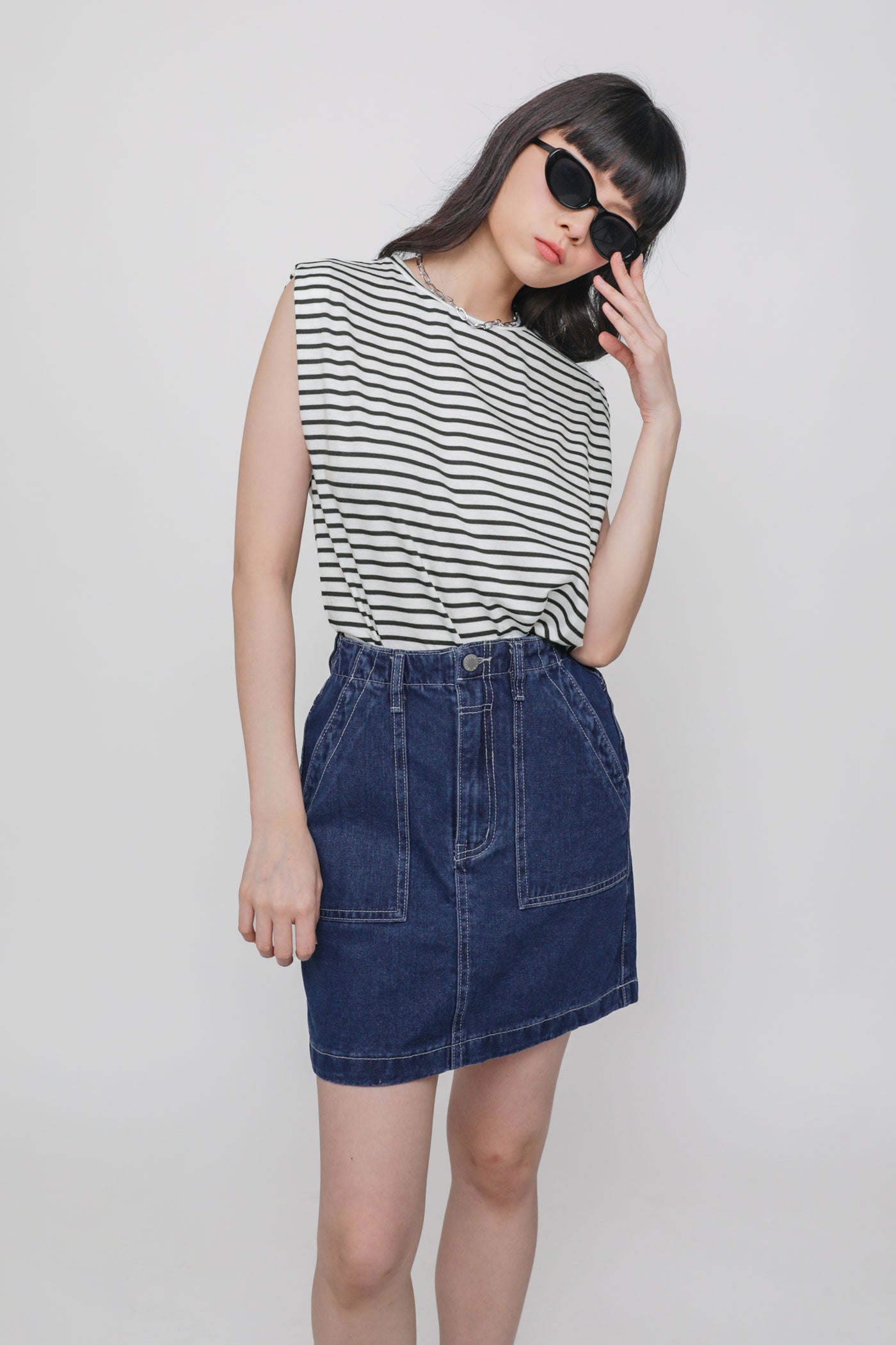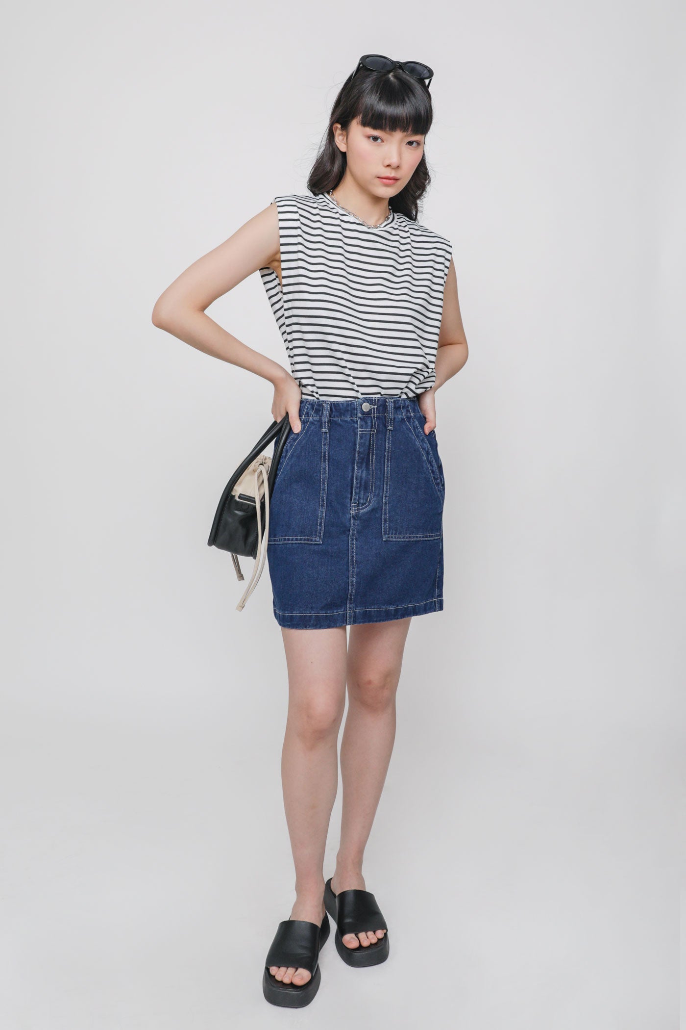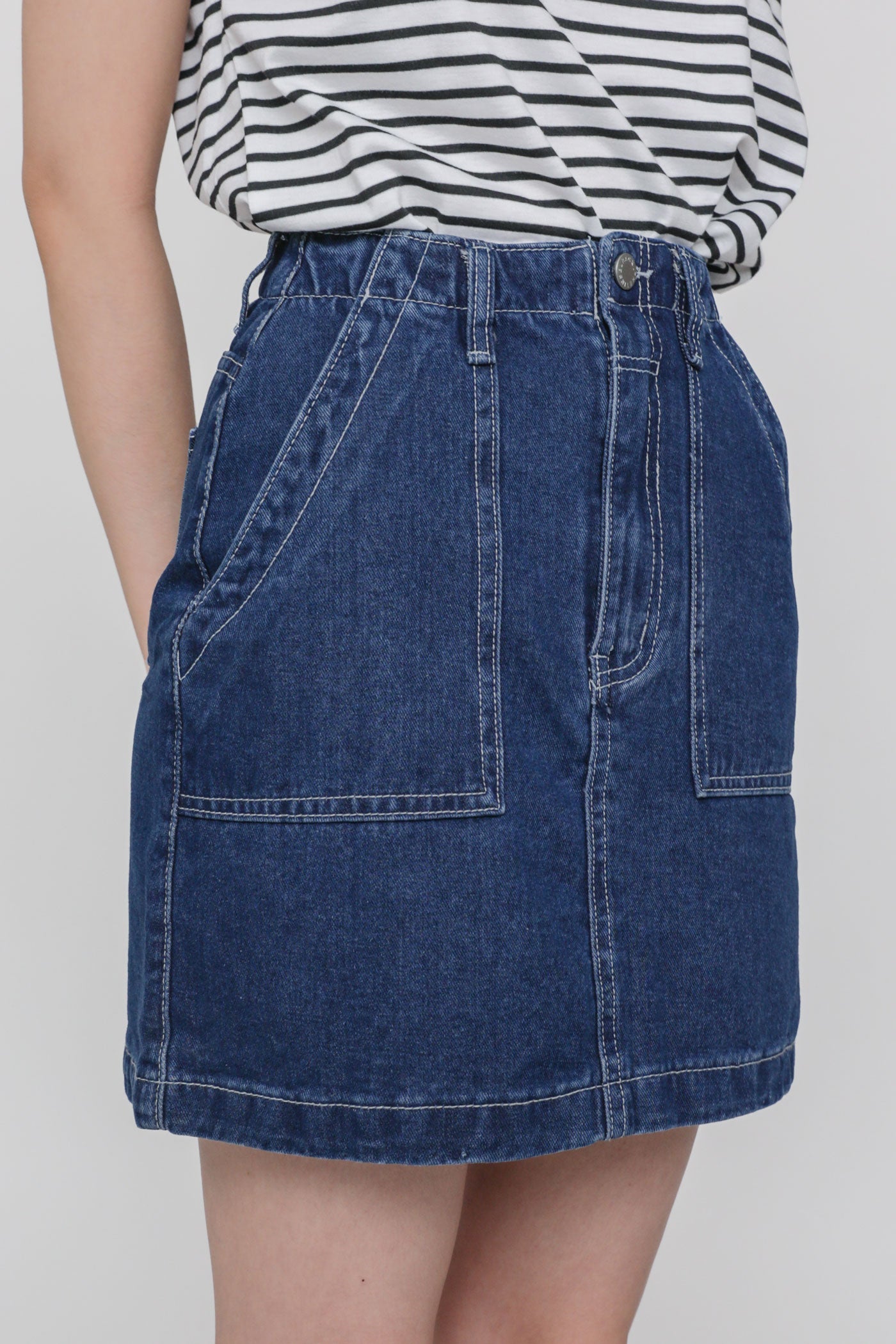 This skirt is made of non-lined cotton denim material for a structured and comfortable fit. It is complete with functional side pockets, a front button and zip.