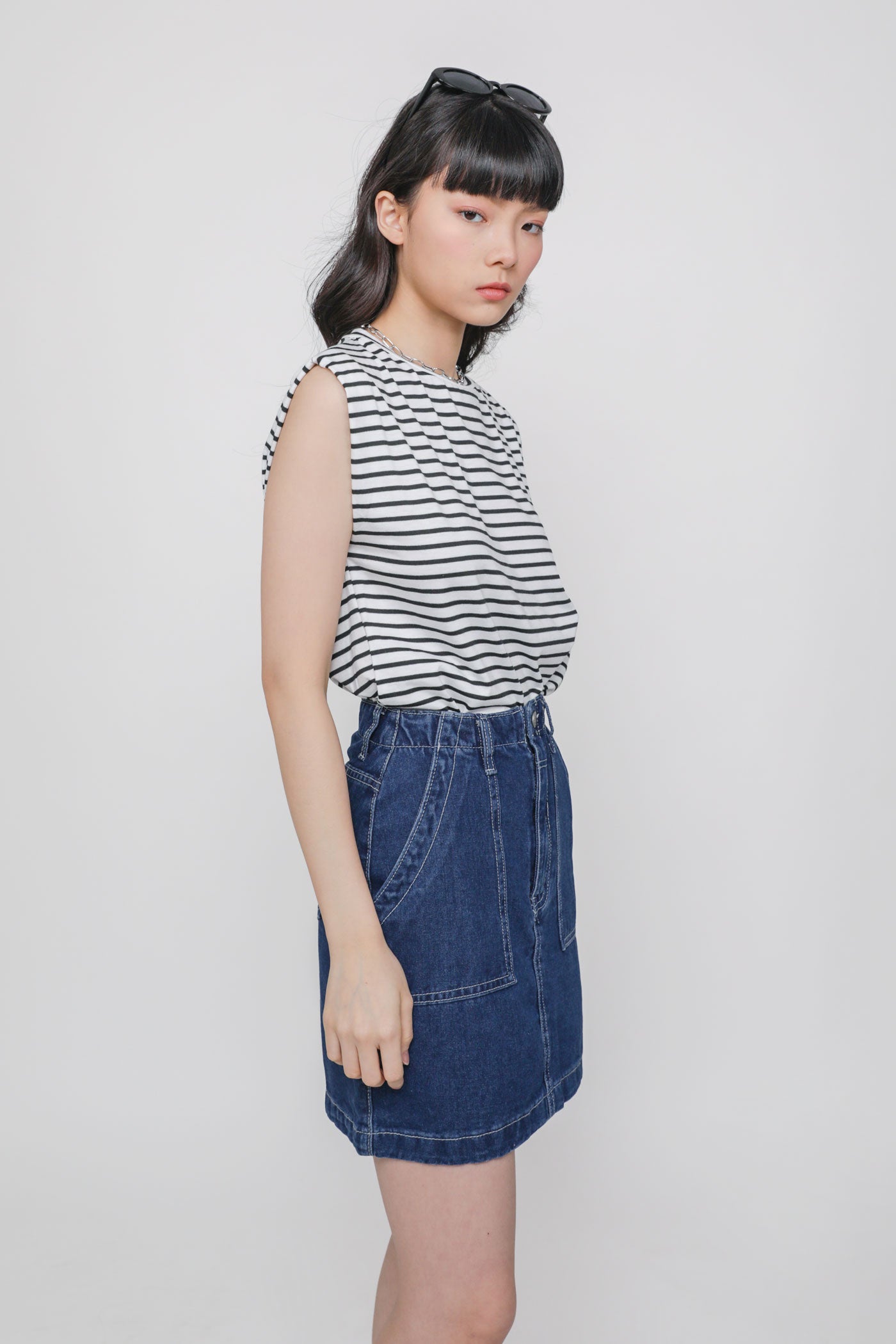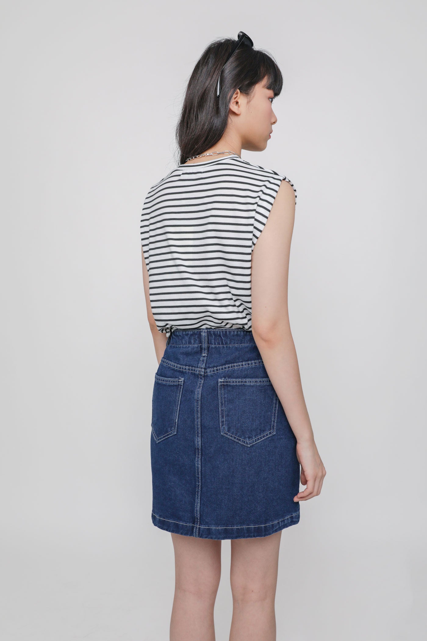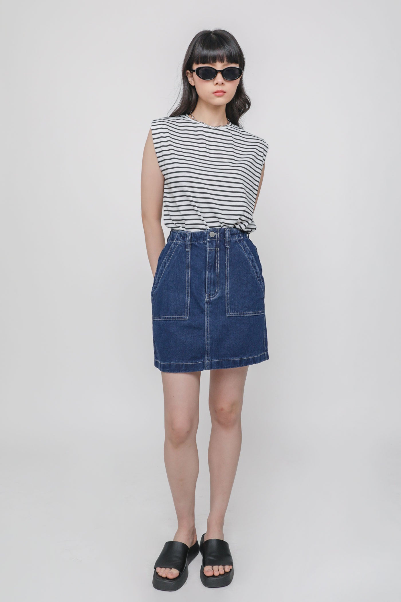 This skirt is made of non-lined cotton denim material for a structured and comfortable fit. It is complete with functional side pockets, a front button and zip.