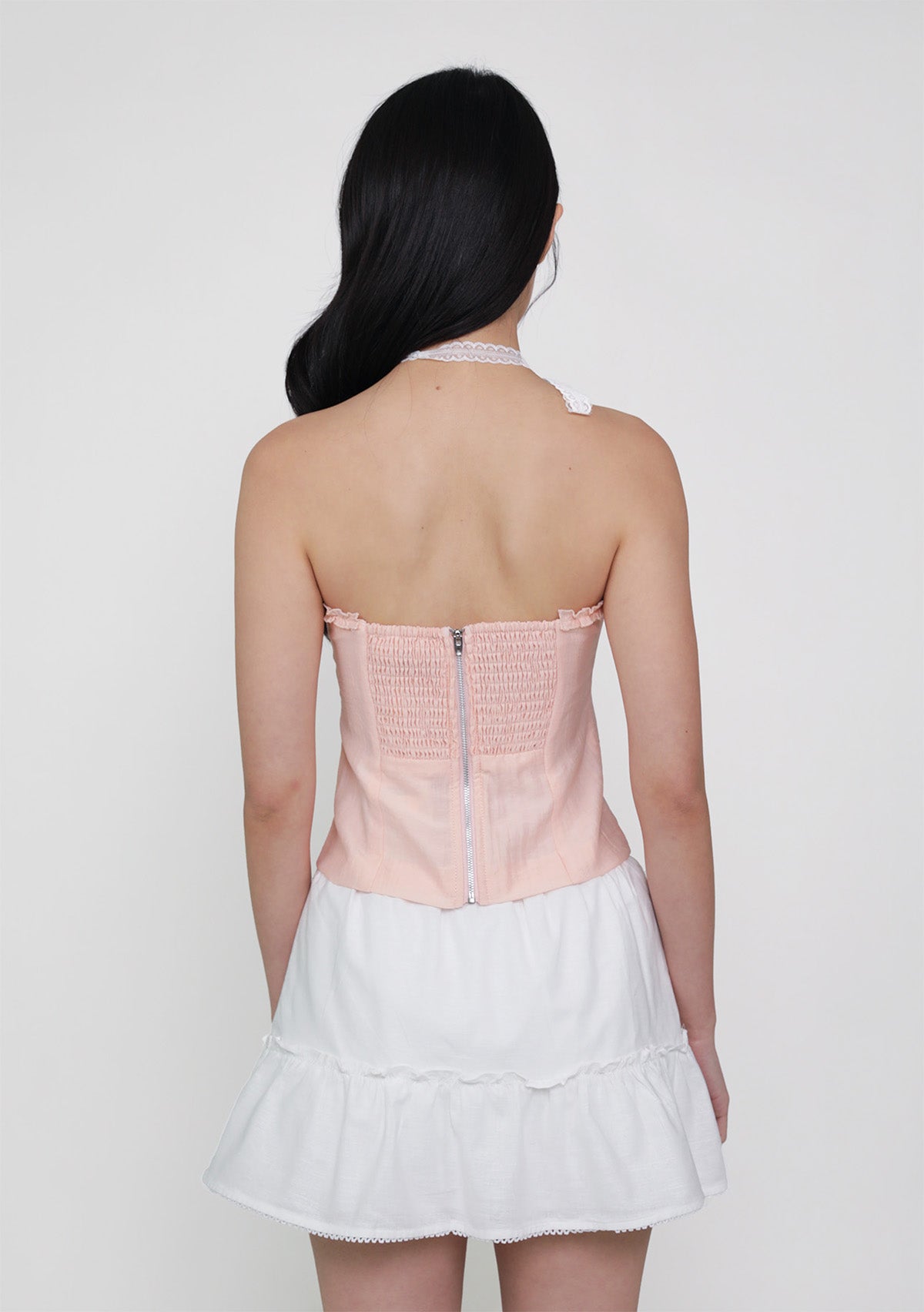 This top is made of rayon nylon (solid colours) or polyester (floral, polka dot), inner lined, with self-tie front details, anti-slip band, smocked back, and functional exposed back zip.