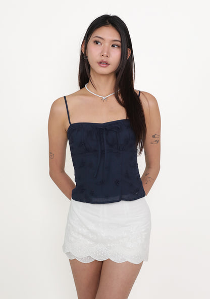 Fion Padded Bustier Top is an eyelet cotton top with removable paddings, self-tie front, smocked back, and adjustable straps for a flattering fit.