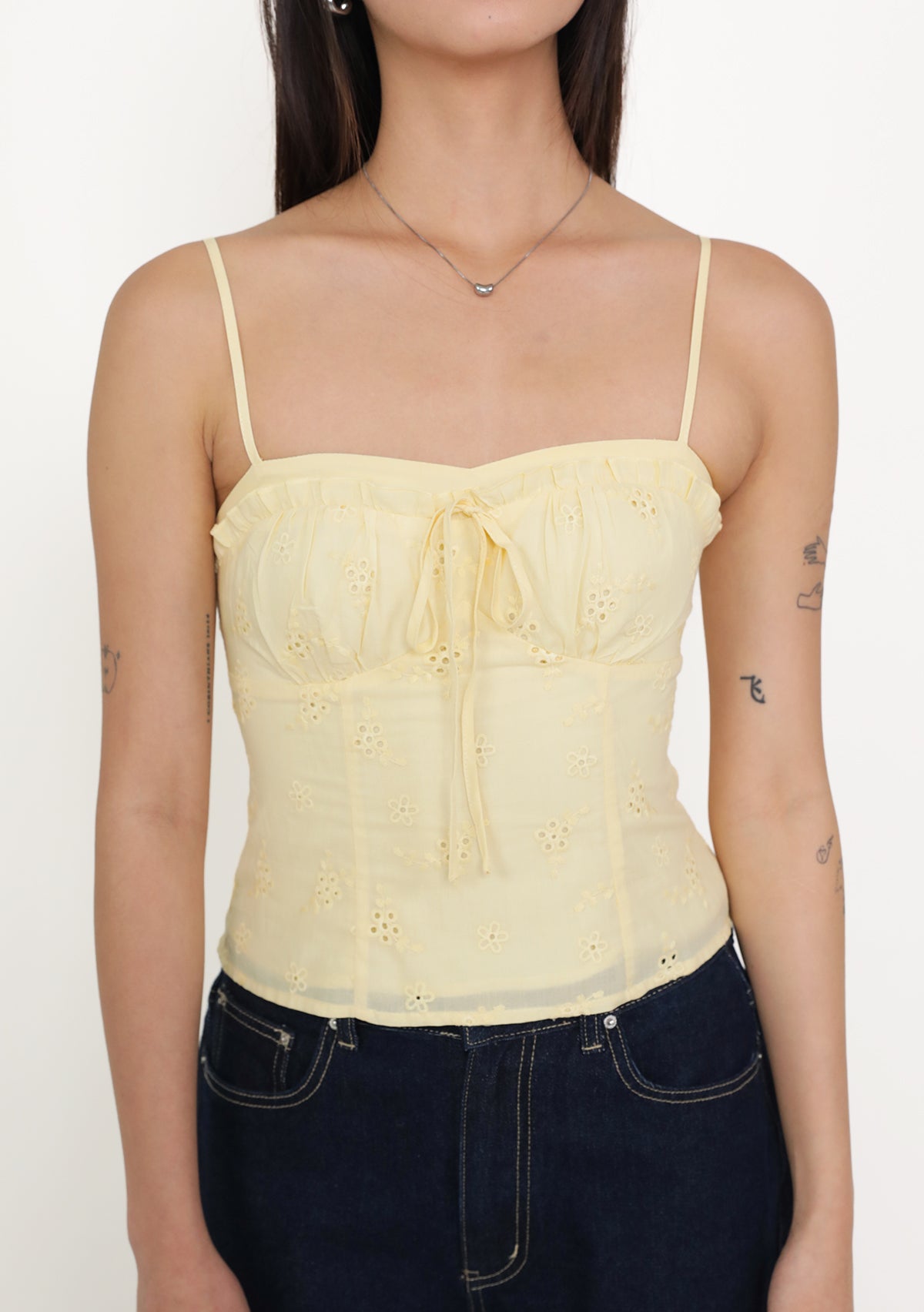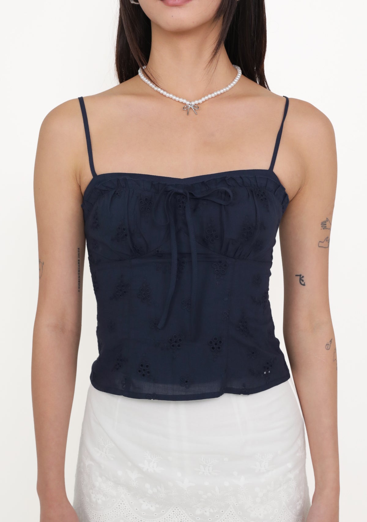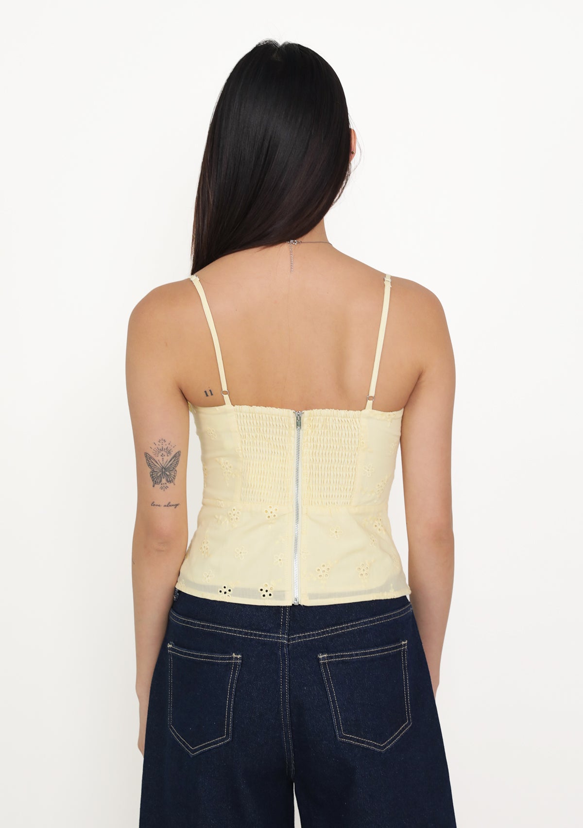 Fion is playful, feminine, and effortlessly flattering. Featuring delicate eyelet fabric, a self-tie front, and a smocked back, this bustier top shapes the silhouette beautifully while ensuring a comfortable, flexible fit. Removable paddings add support and versatility, while adjustable straps and a functional exposed back zip make styling easy. Perfect for pairing with high-waisted skirts or pants, Fion adds a charming, airy touch to your everyday wardrobe.