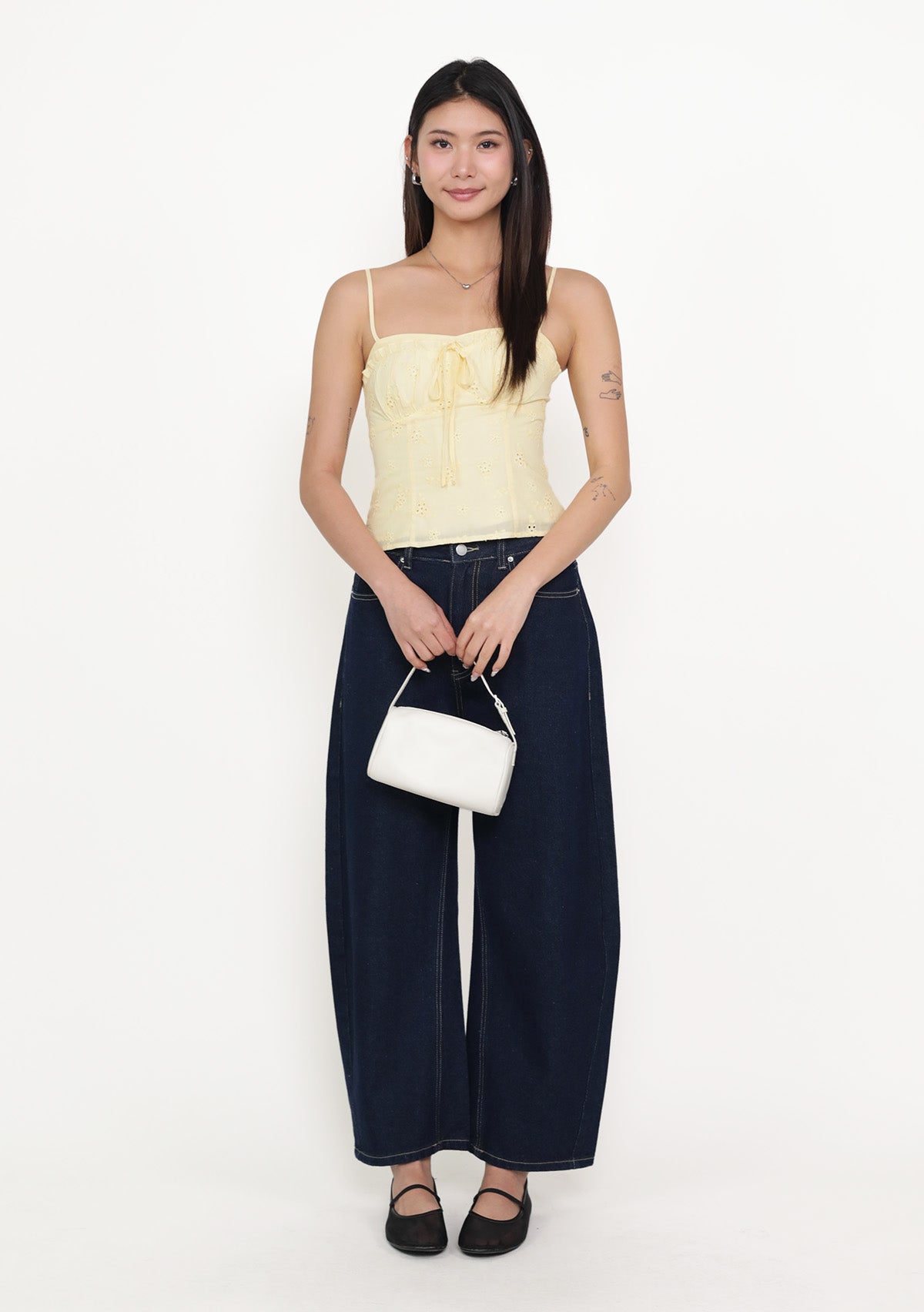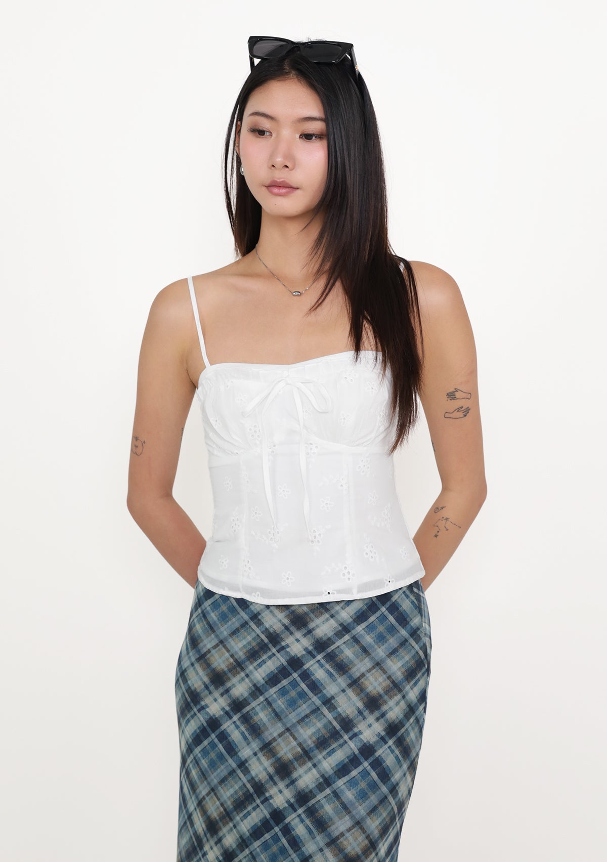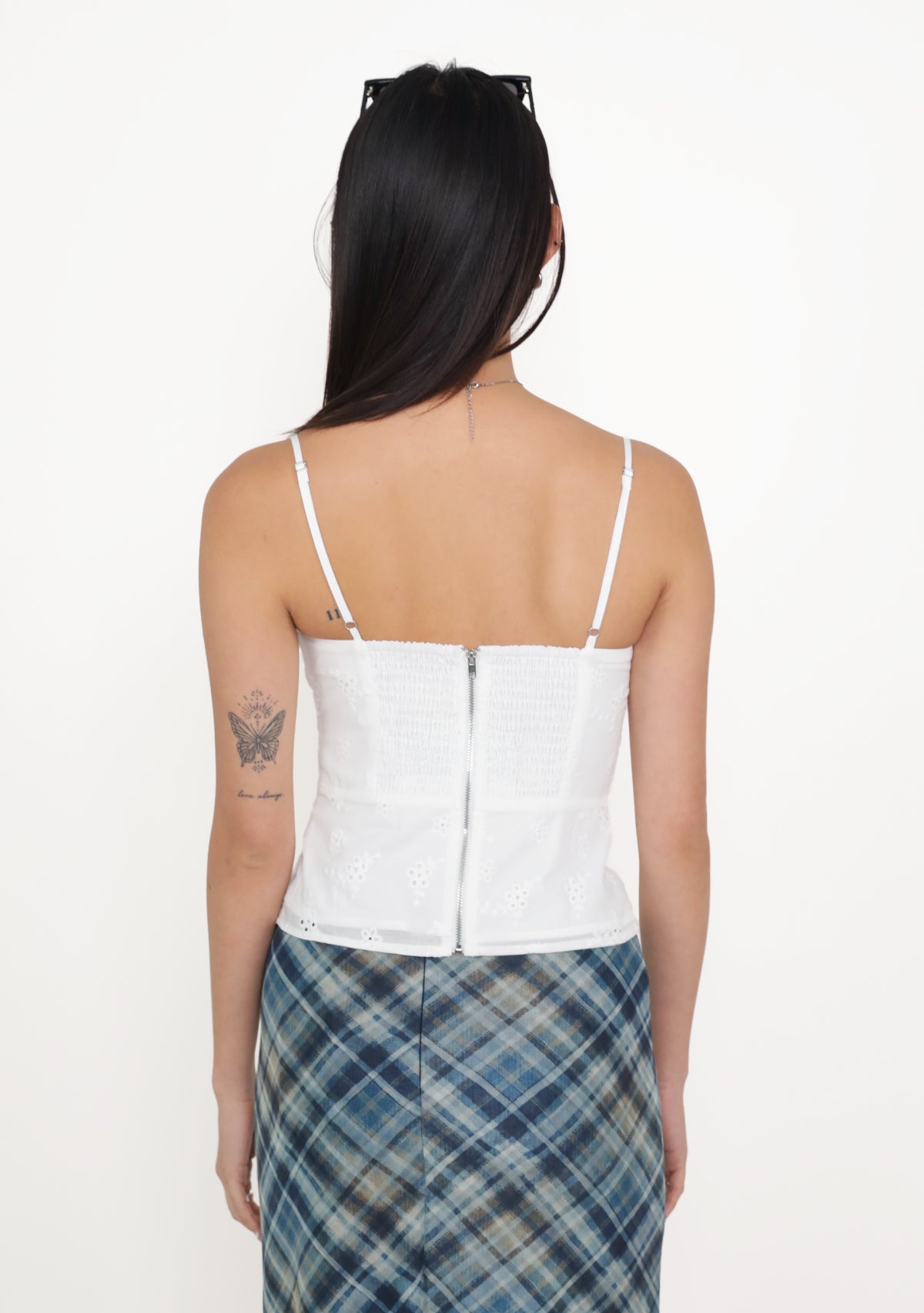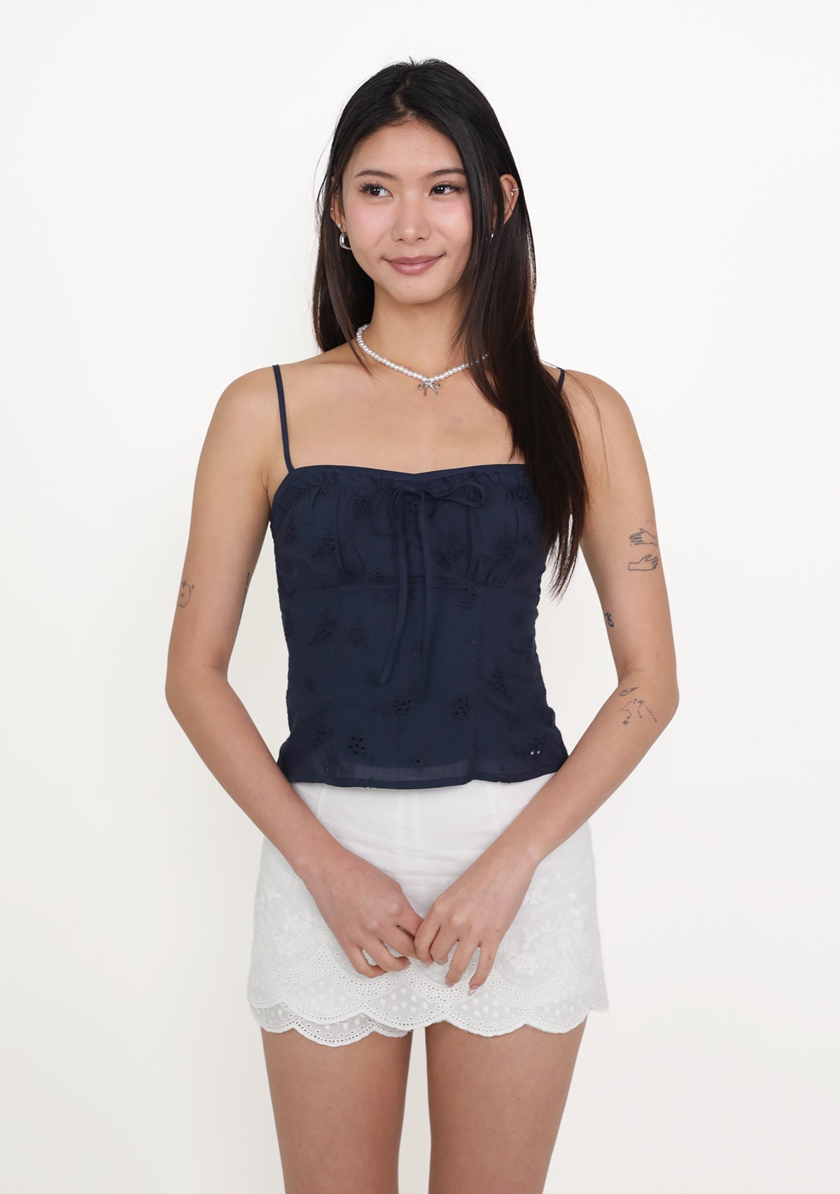 Fion is playful, feminine, and effortlessly flattering. Featuring delicate eyelet fabric, a self-tie front, and a smocked back, this bustier top shapes the silhouette beautifully while ensuring a comfortable, flexible fit. Removable paddings add support and versatility, while adjustable straps and a functional exposed back zip make styling easy. Perfect for pairing with high-waisted skirts or pants, Fion adds a charming, airy touch to your everyday wardrobe.