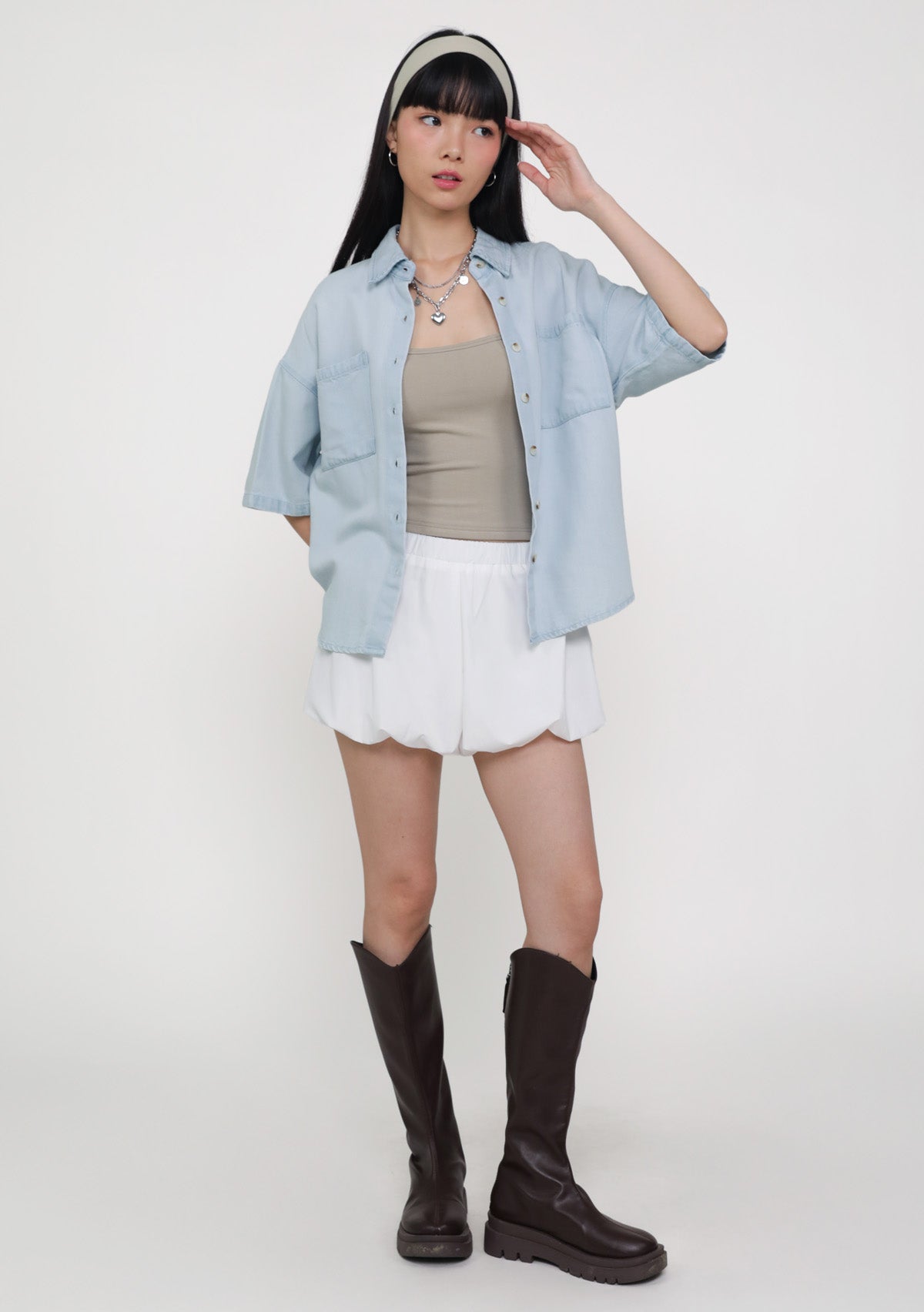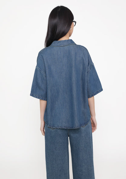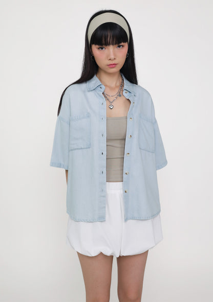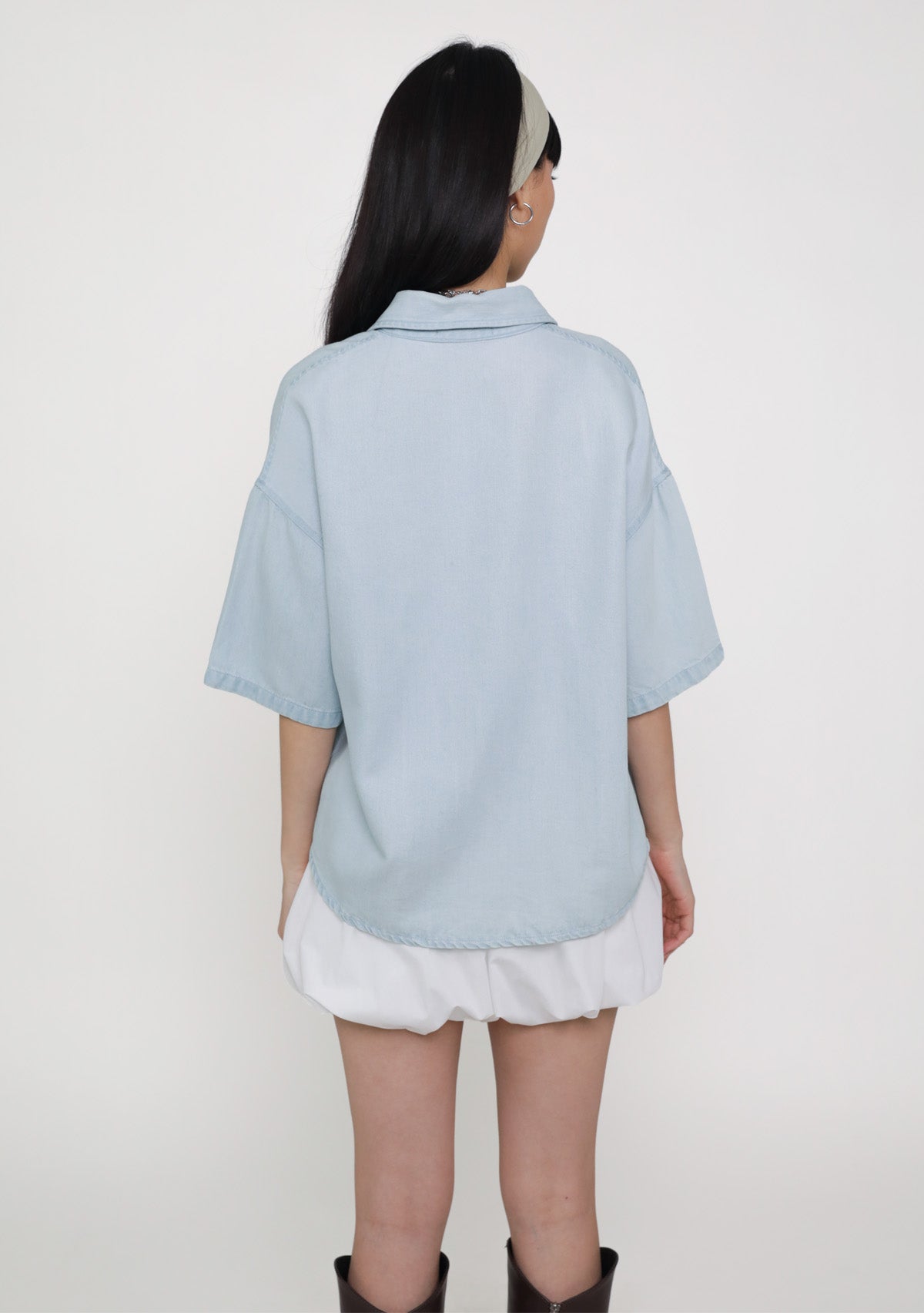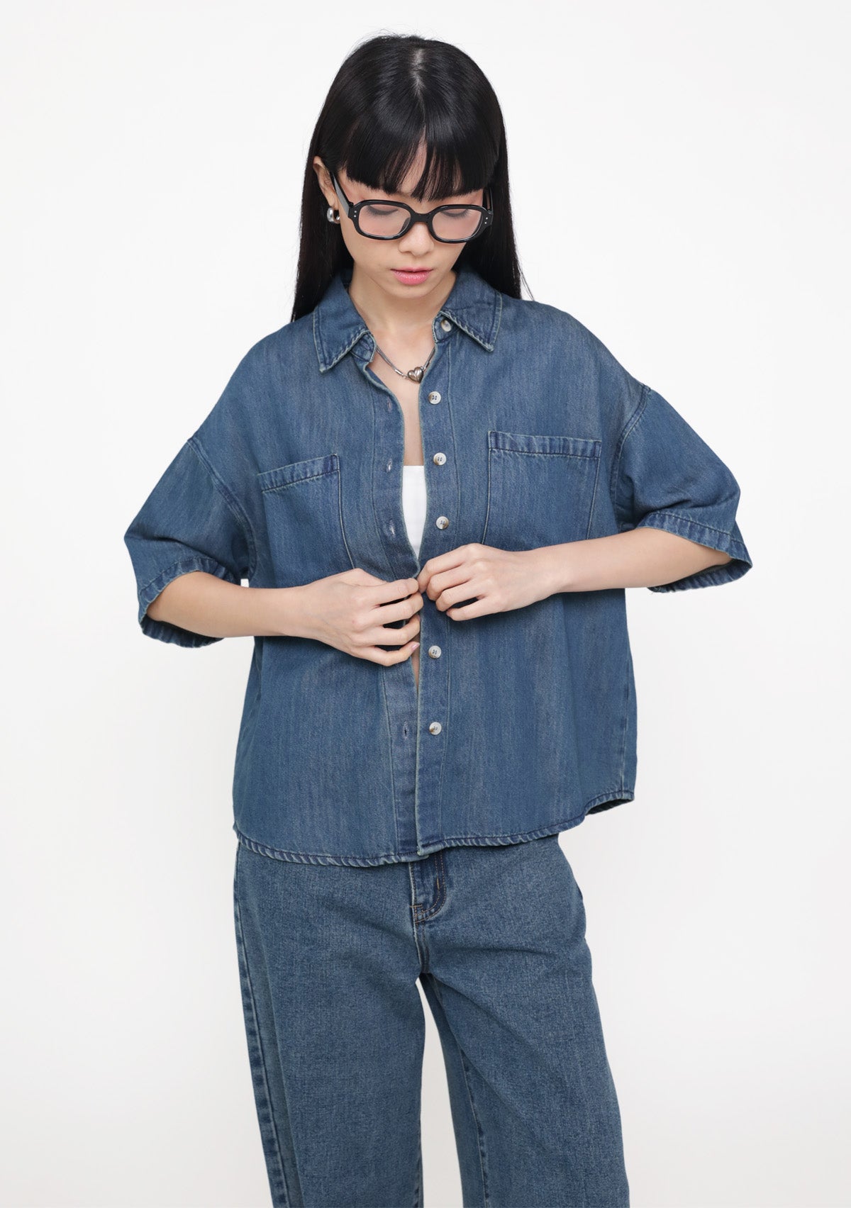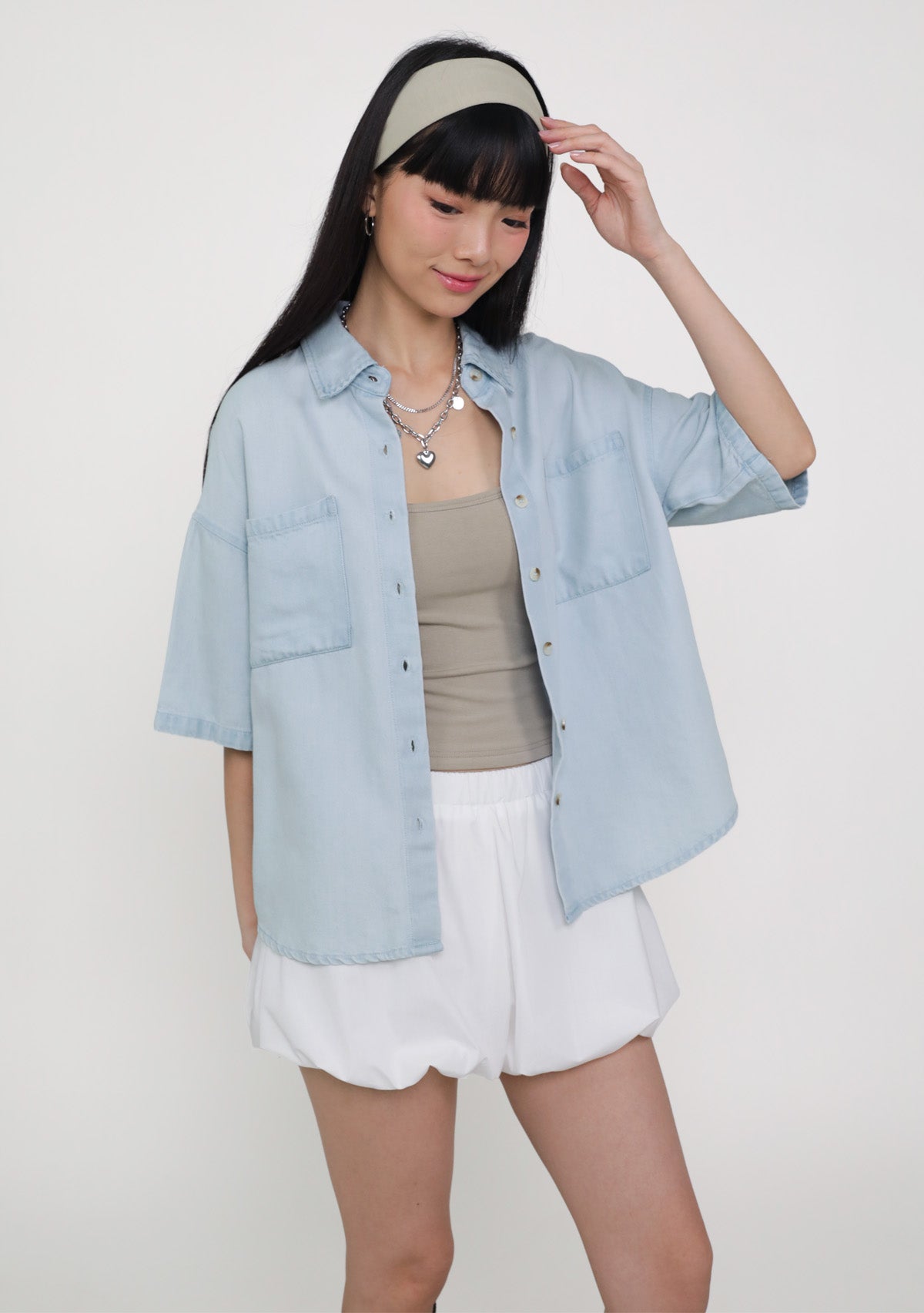Haena Button Denim Shirt is a soft cotton denim piece designed with front pockets and buttons for a casual yet put-together look.