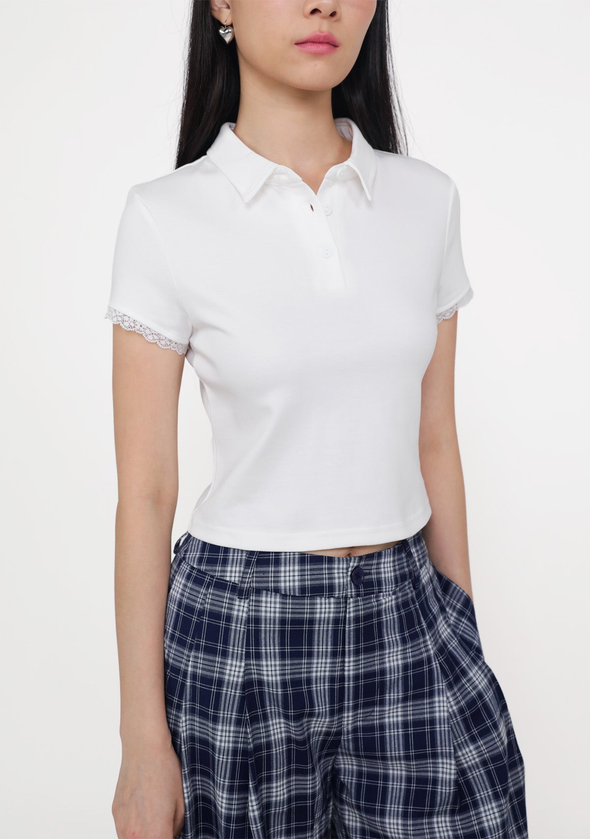 Liana Lace Trim Polo Tee is a cotton spandex top featuring lace-trimmed sleeves and a classic collar for a feminine twist on timeless style.