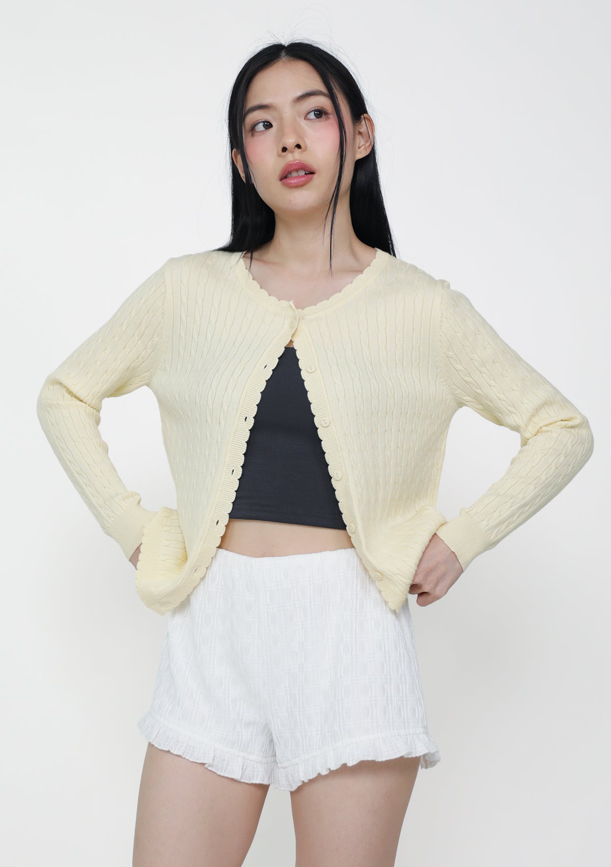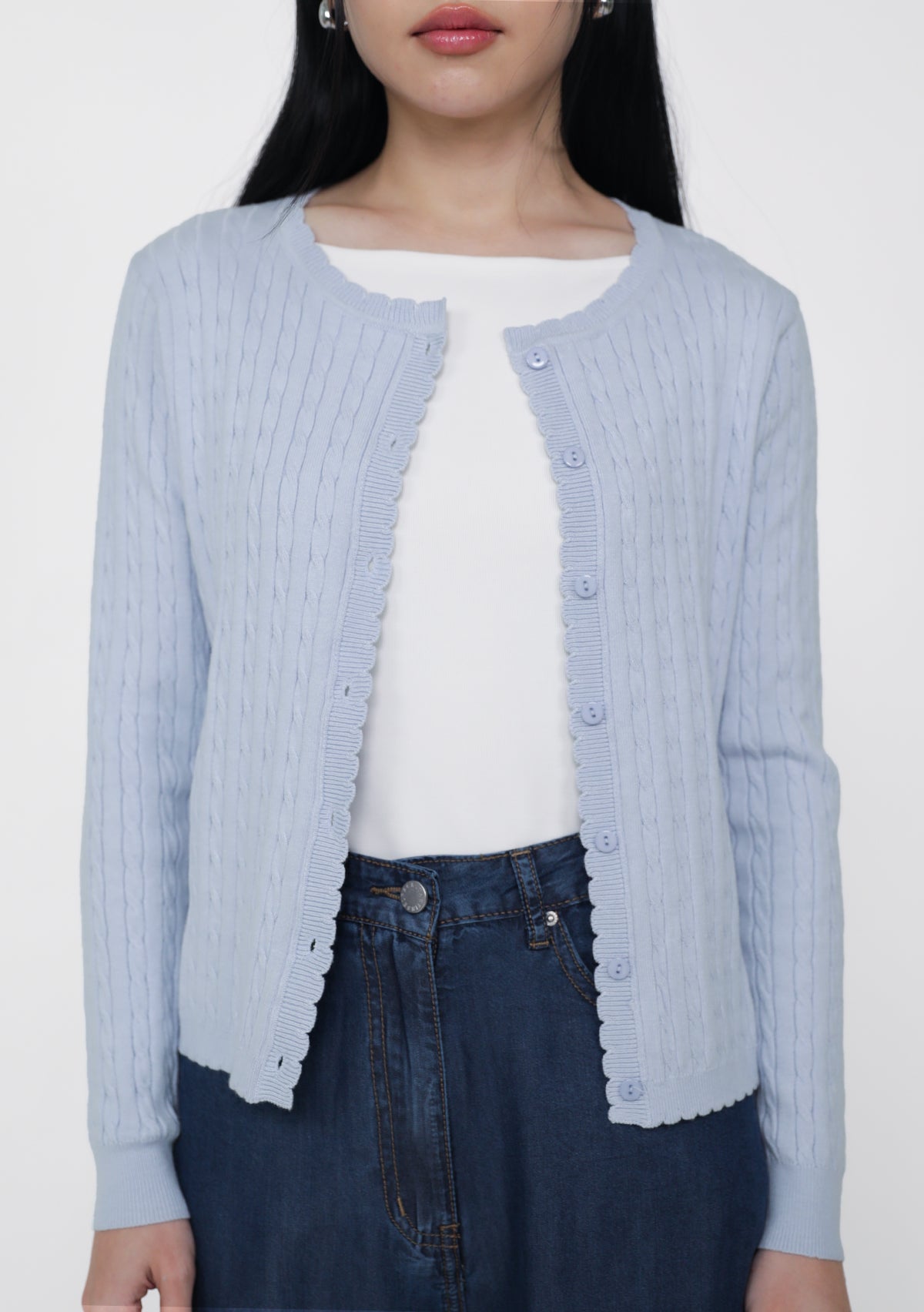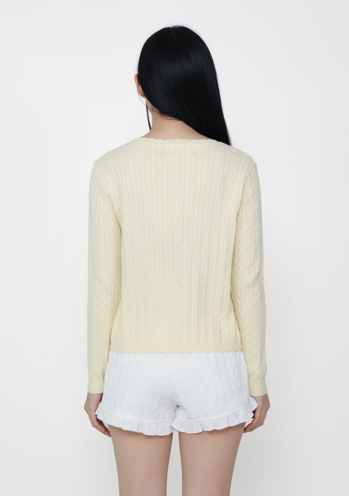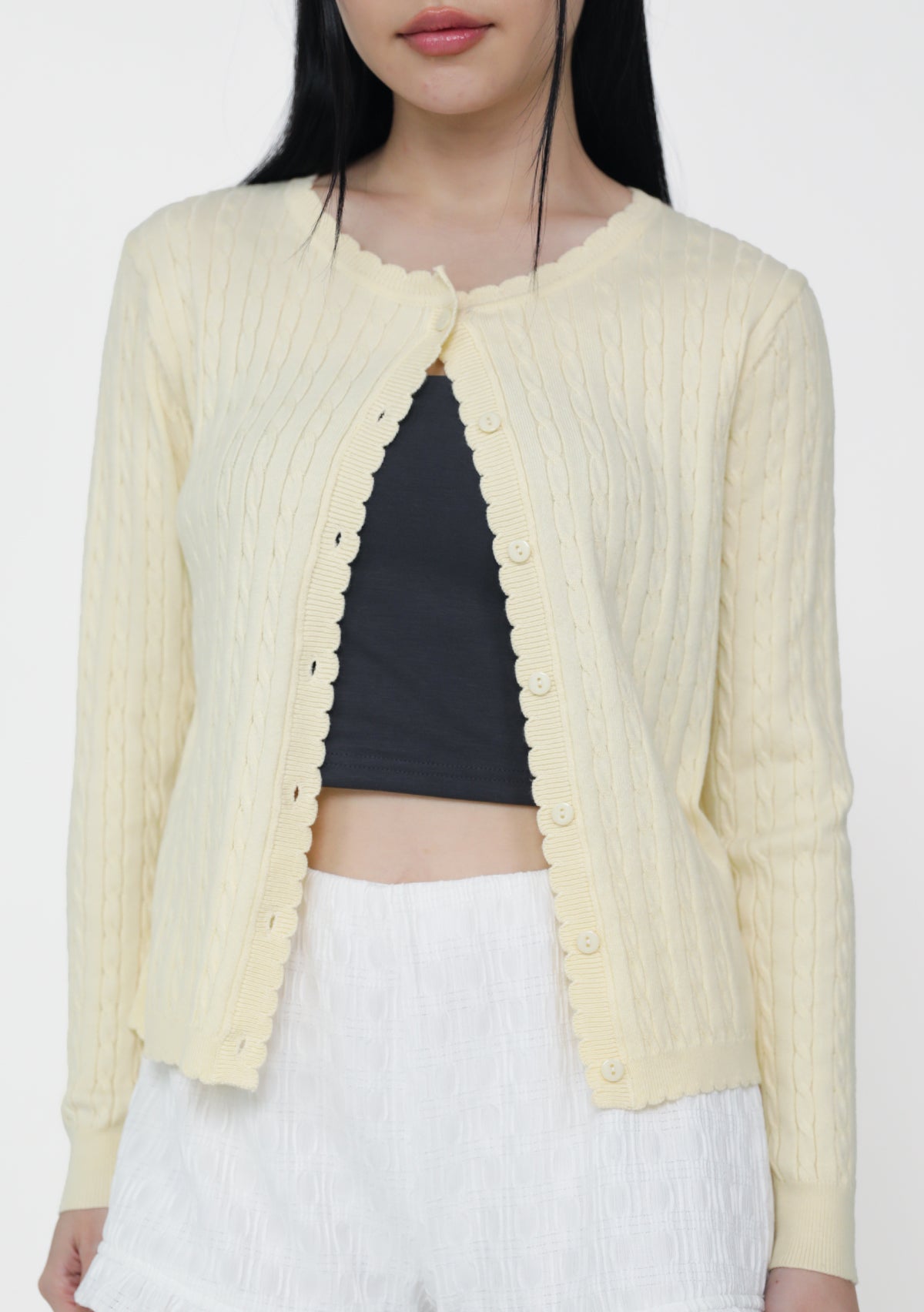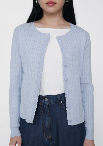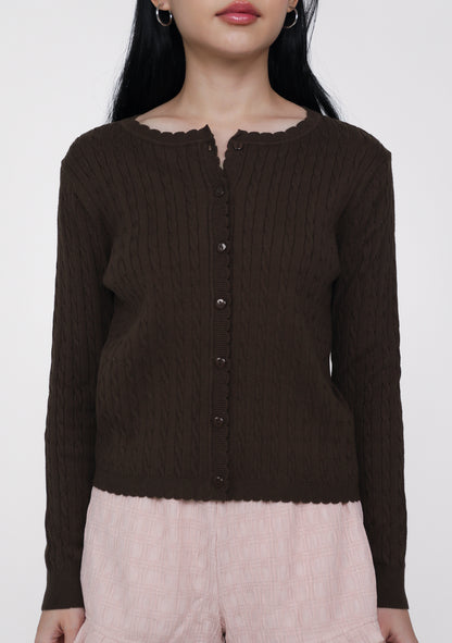 Lilo Scallop Trim Cardigan is a cable knit cardigan made from a cozy cotton-acrylic blend with soft scalloped edges.