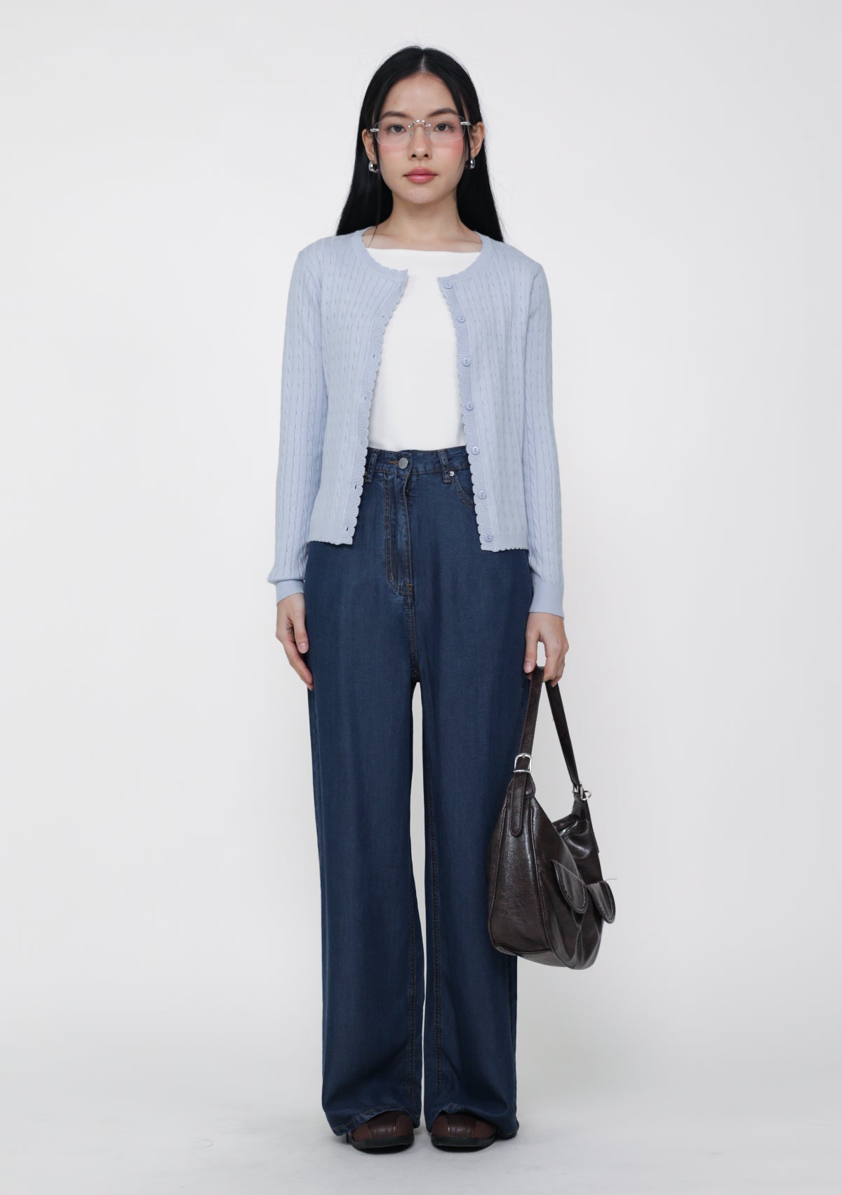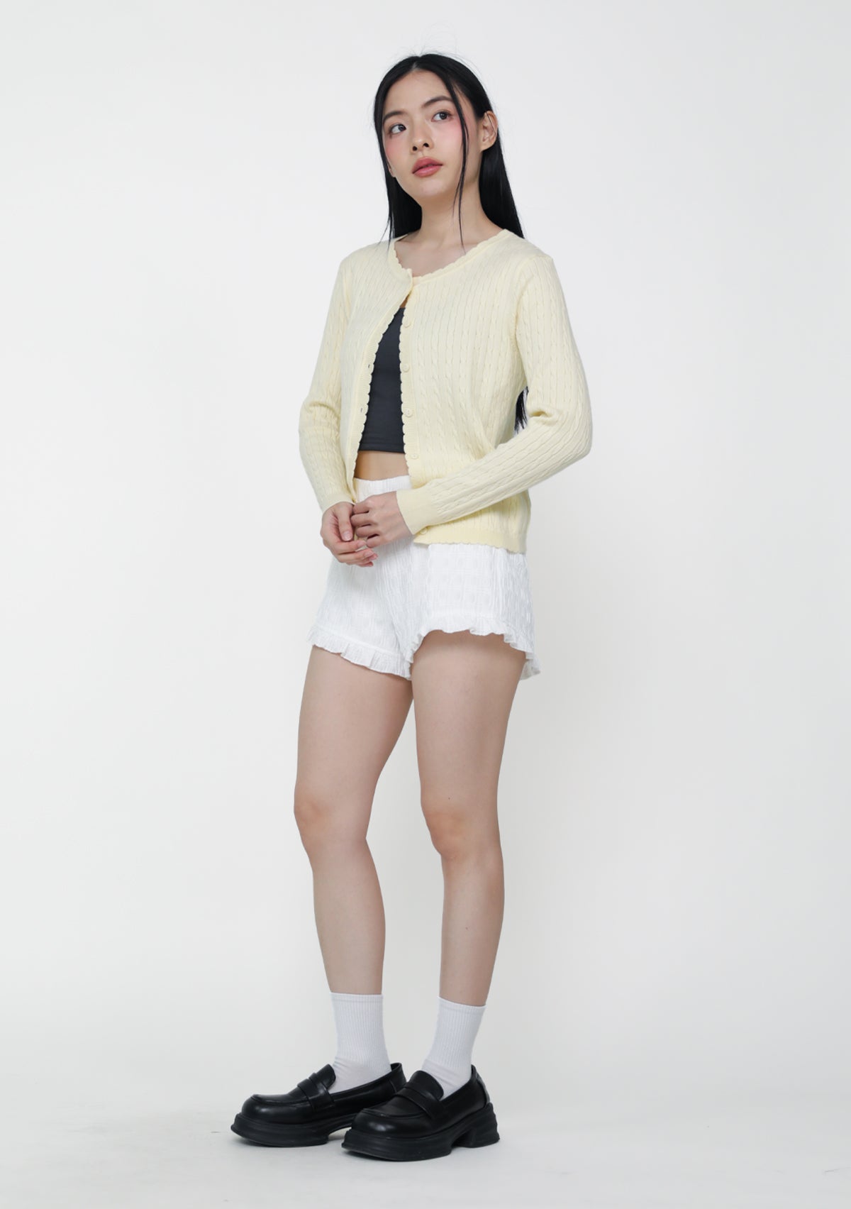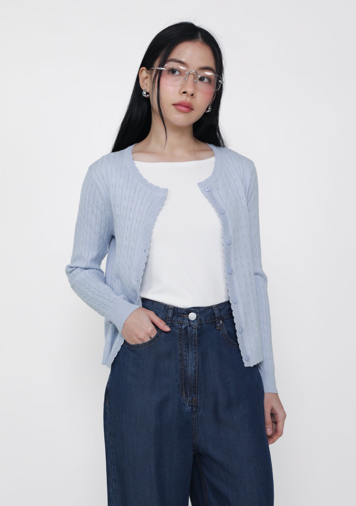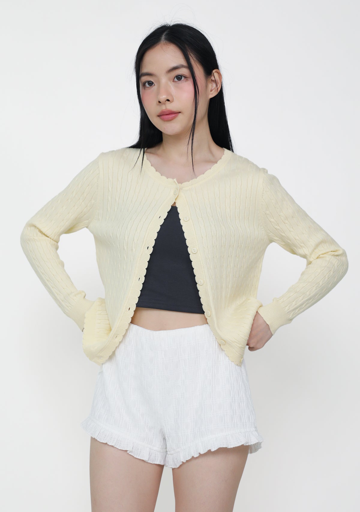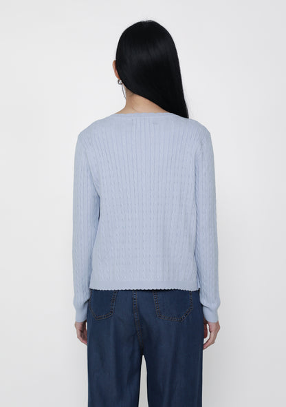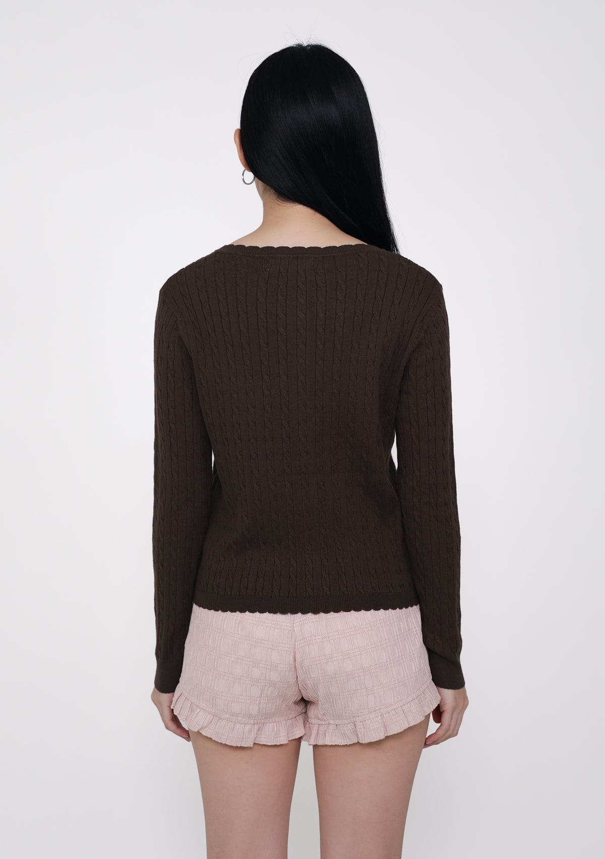 Lilo Scallop Trim Cardigan is a cable knit cardigan made from a cozy cotton-acrylic blend with soft scalloped edges.