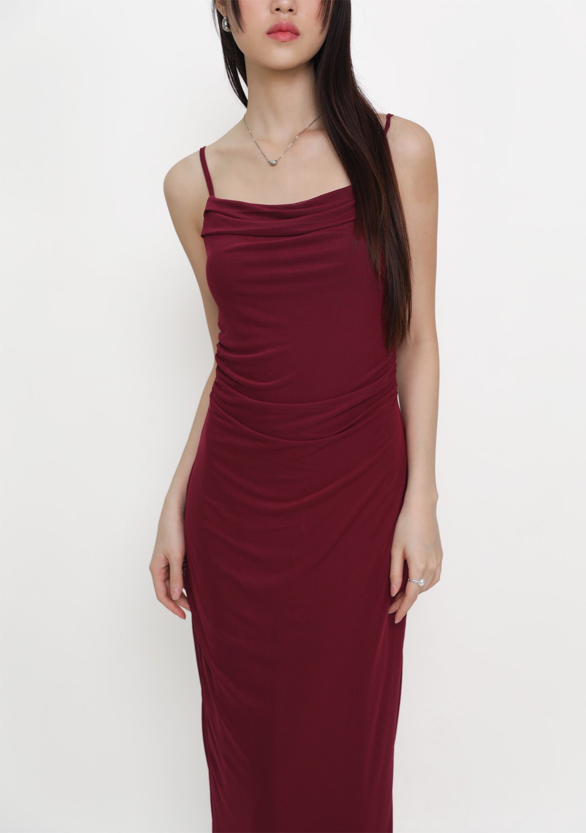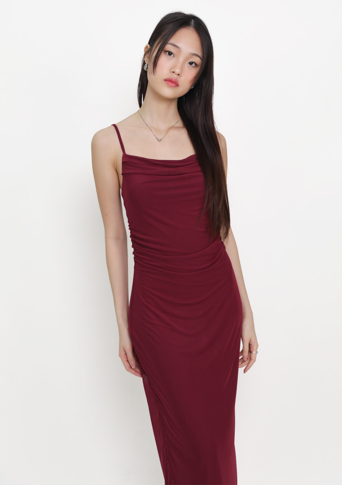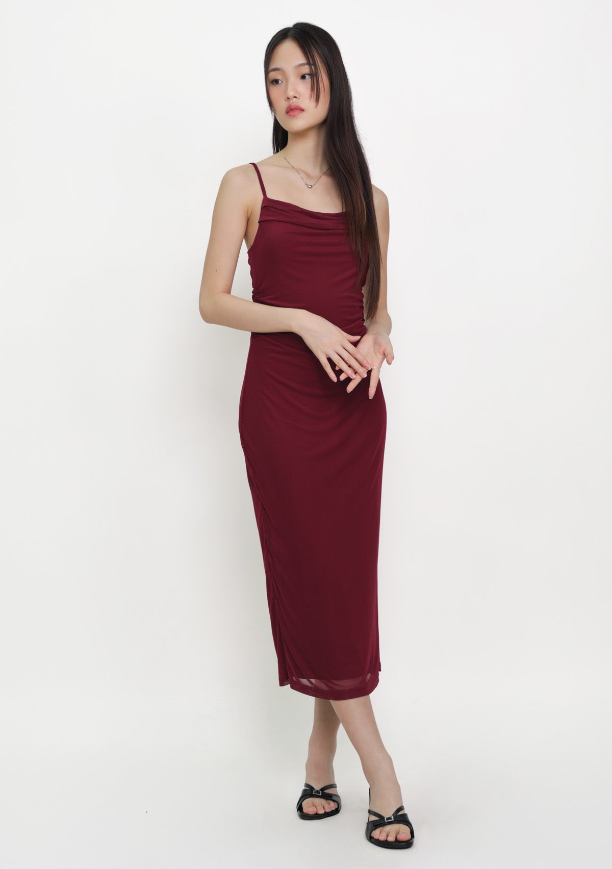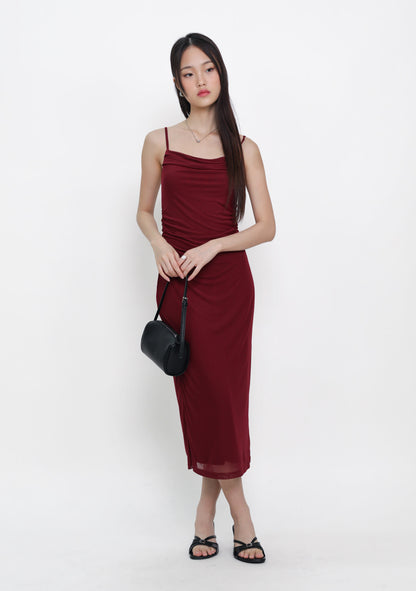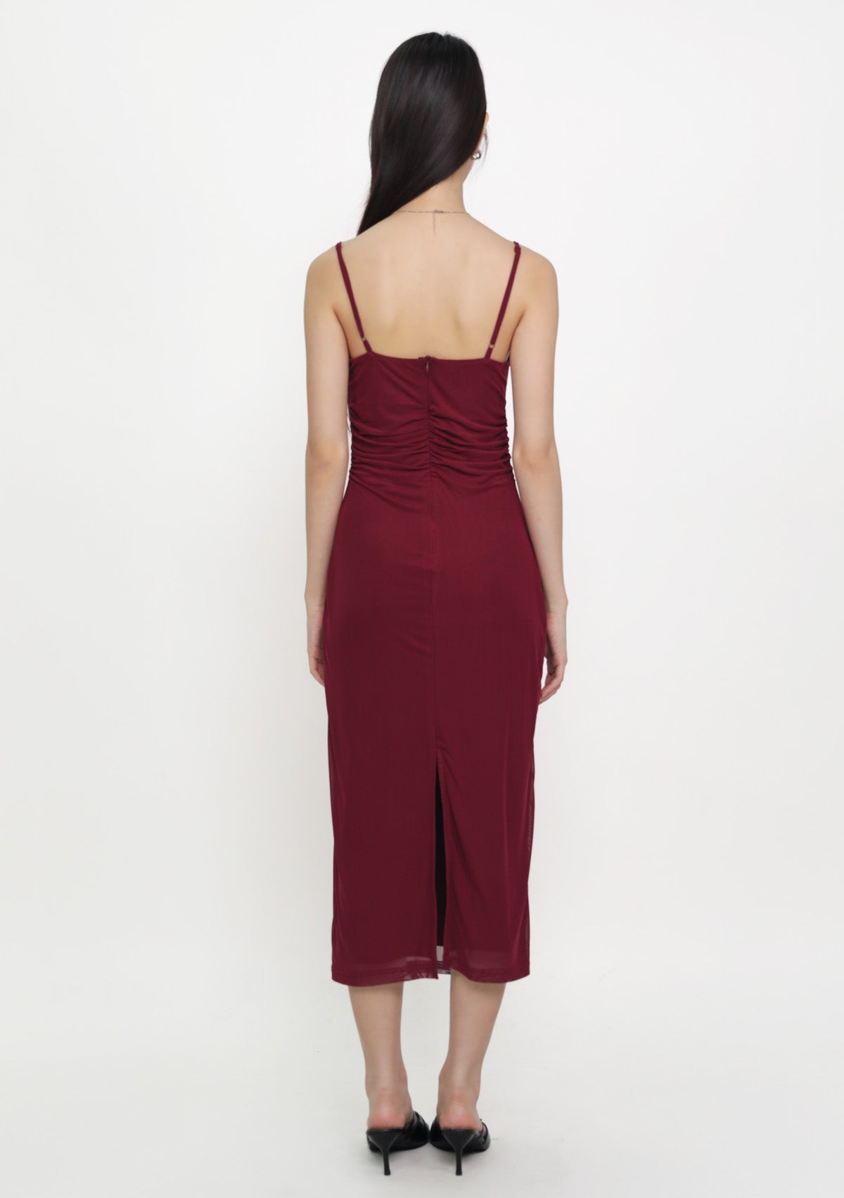 Lyanna Ruched Mesh Padded Dress is a layered mesh midi with soft ruching and built-in padding, designed for a flattering and elegant fit.