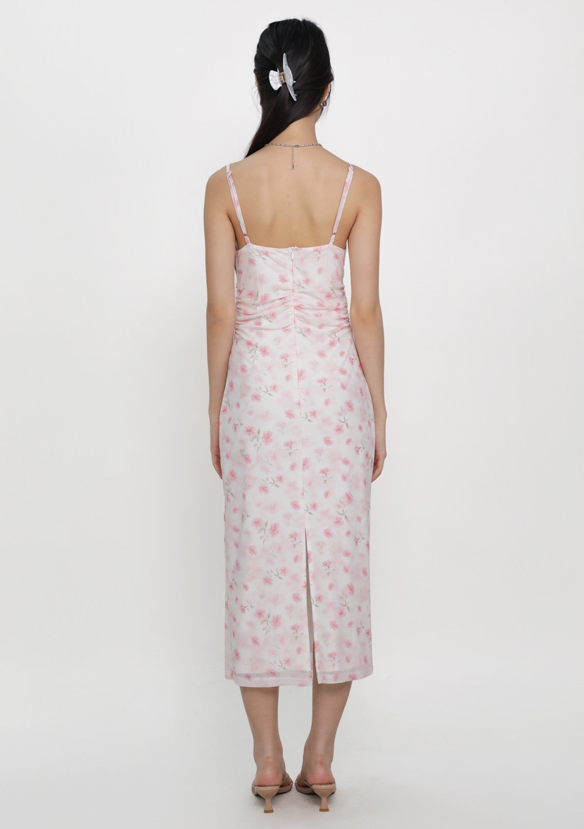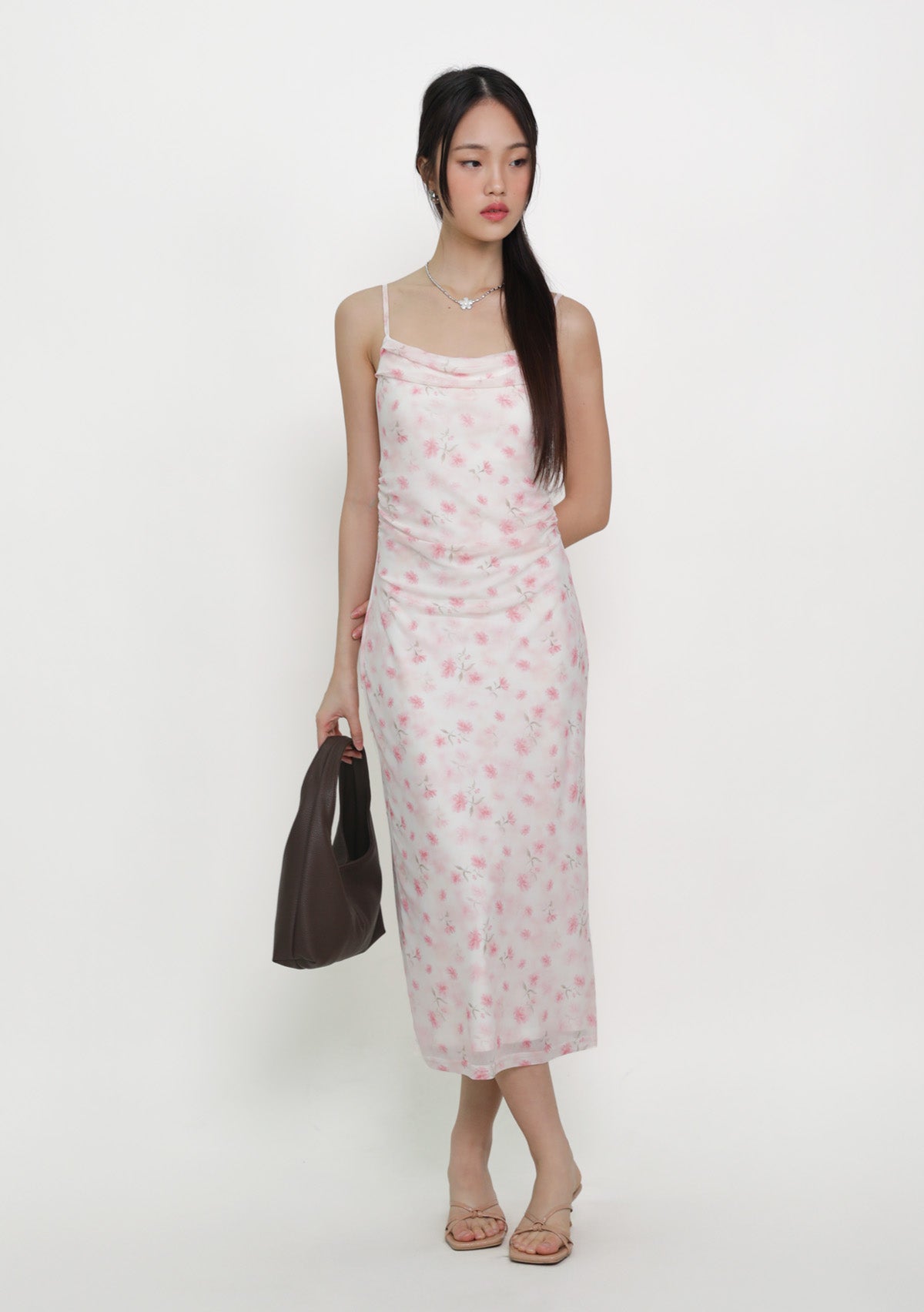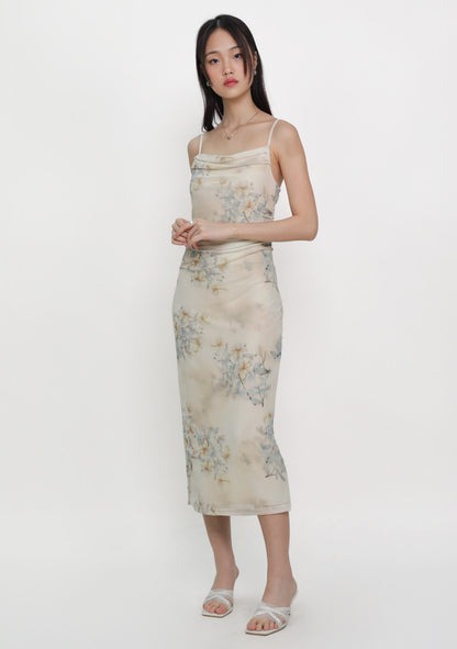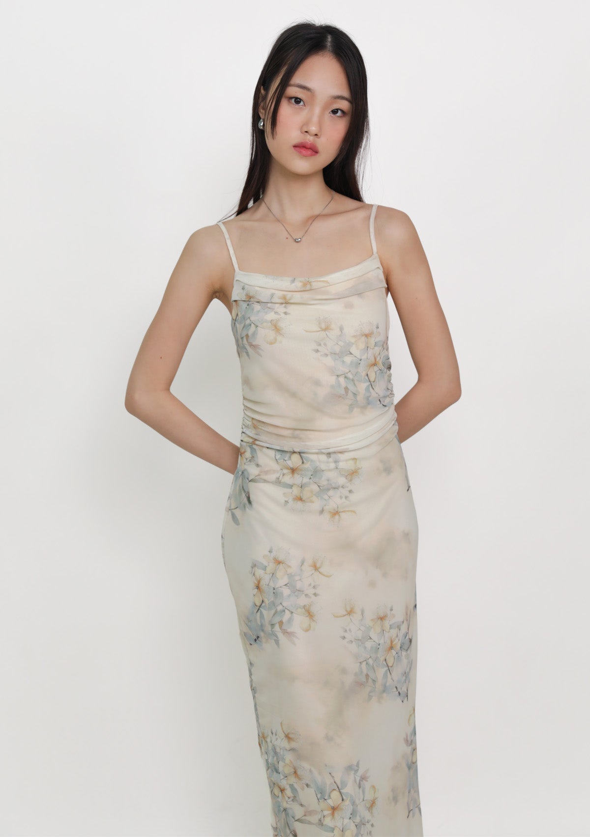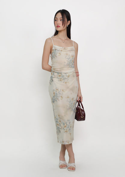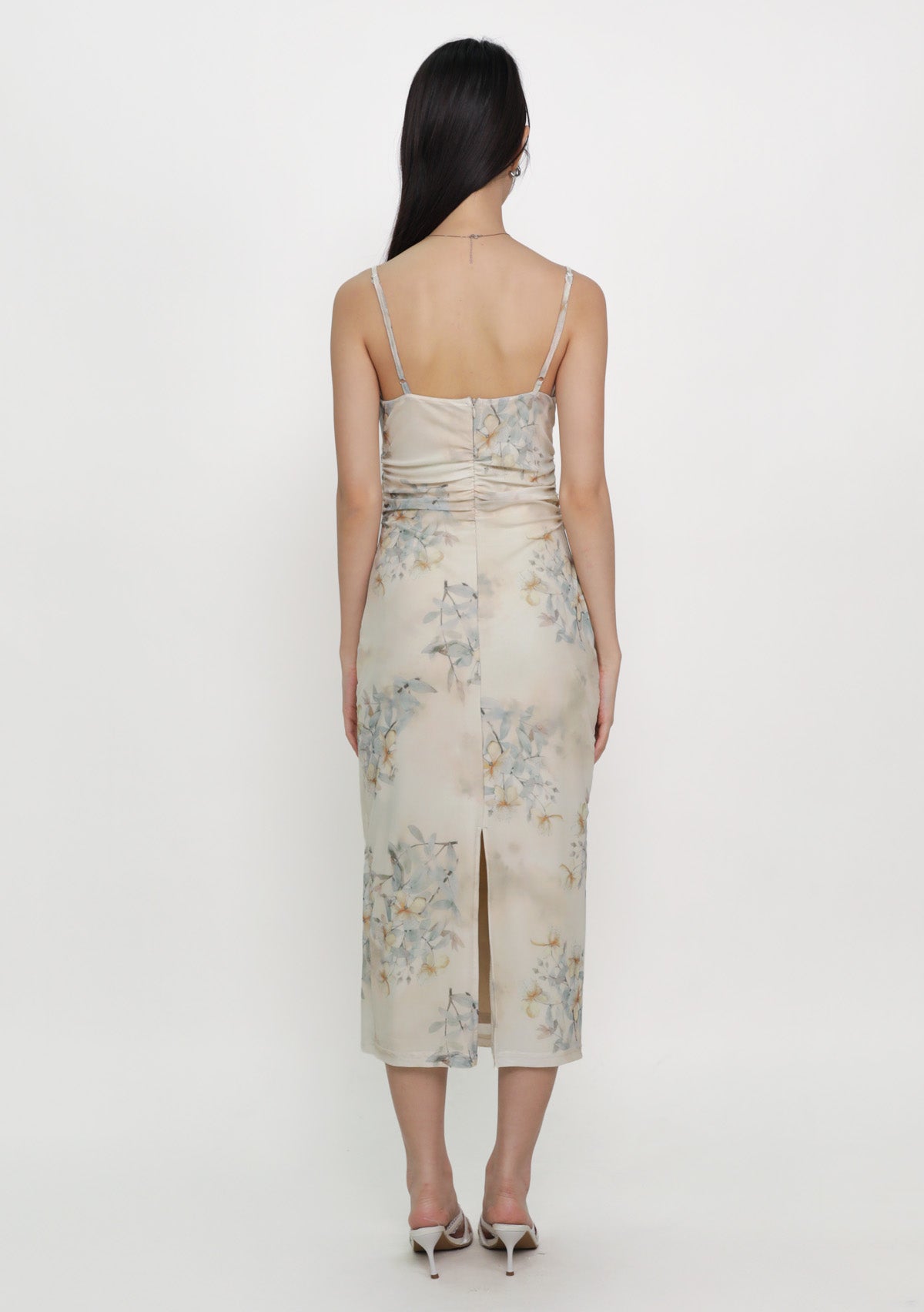 Lyanna Ruched Mesh Padded Dress is a floral mesh midi with soft ruching and built-in padding, designed for a flattering, feminine silhouette.