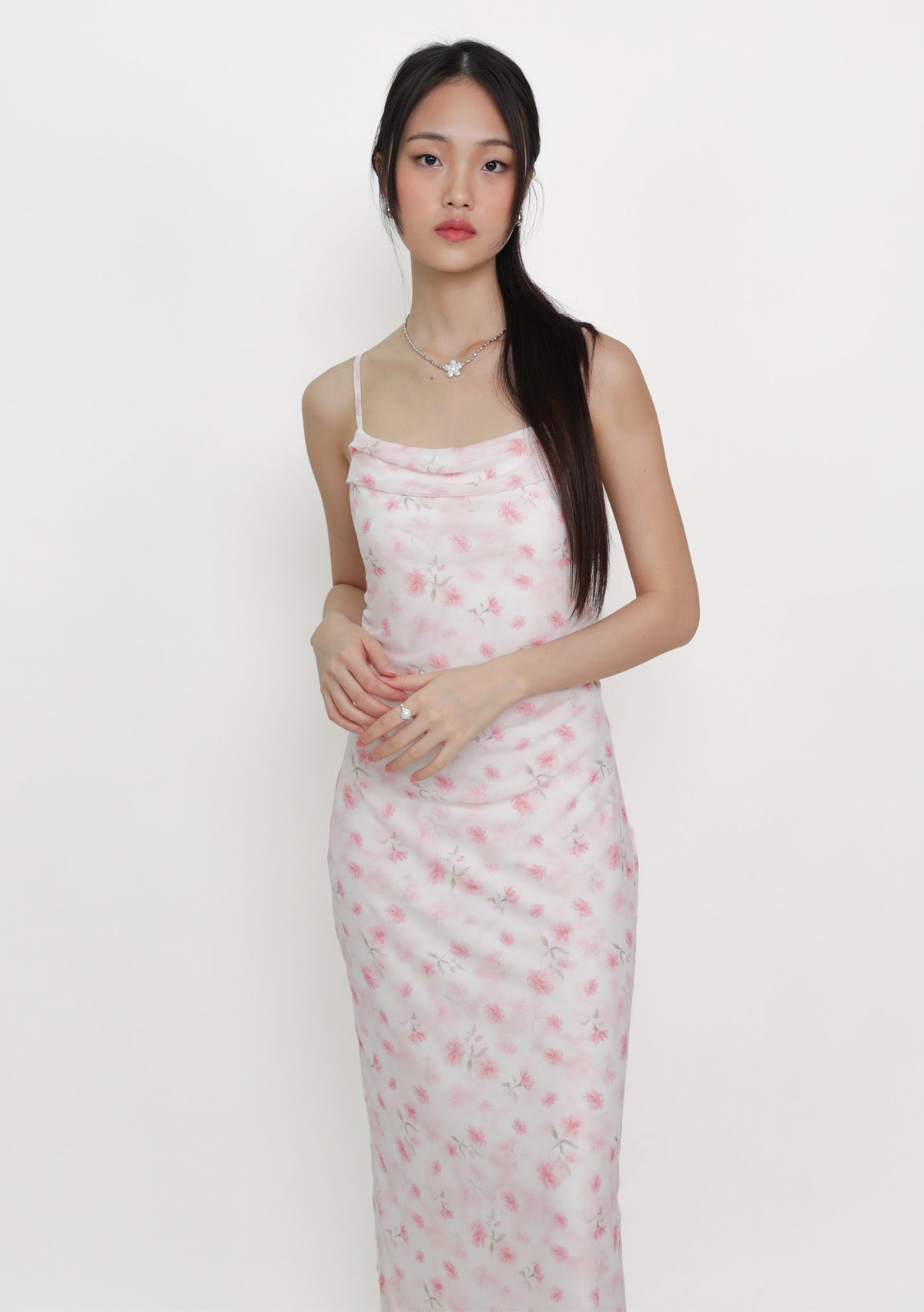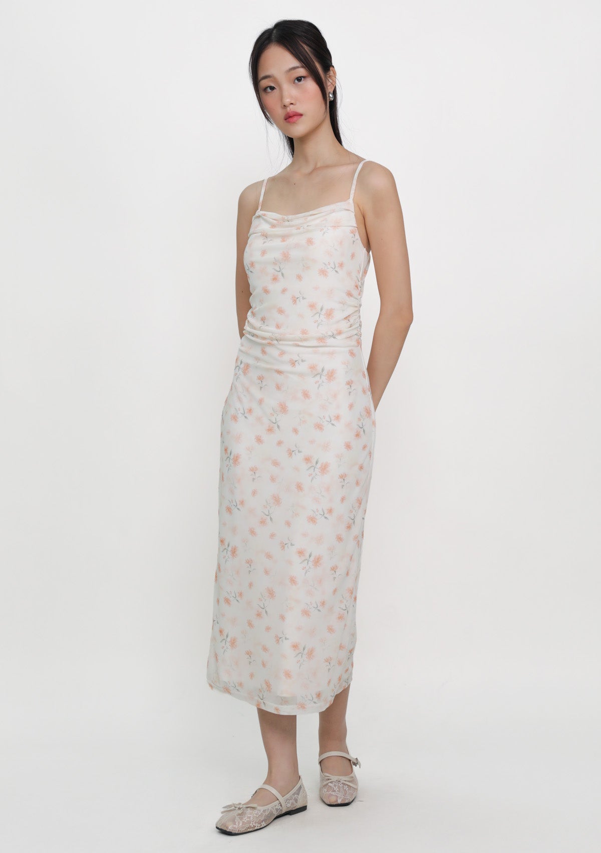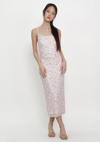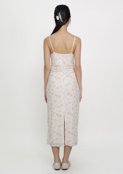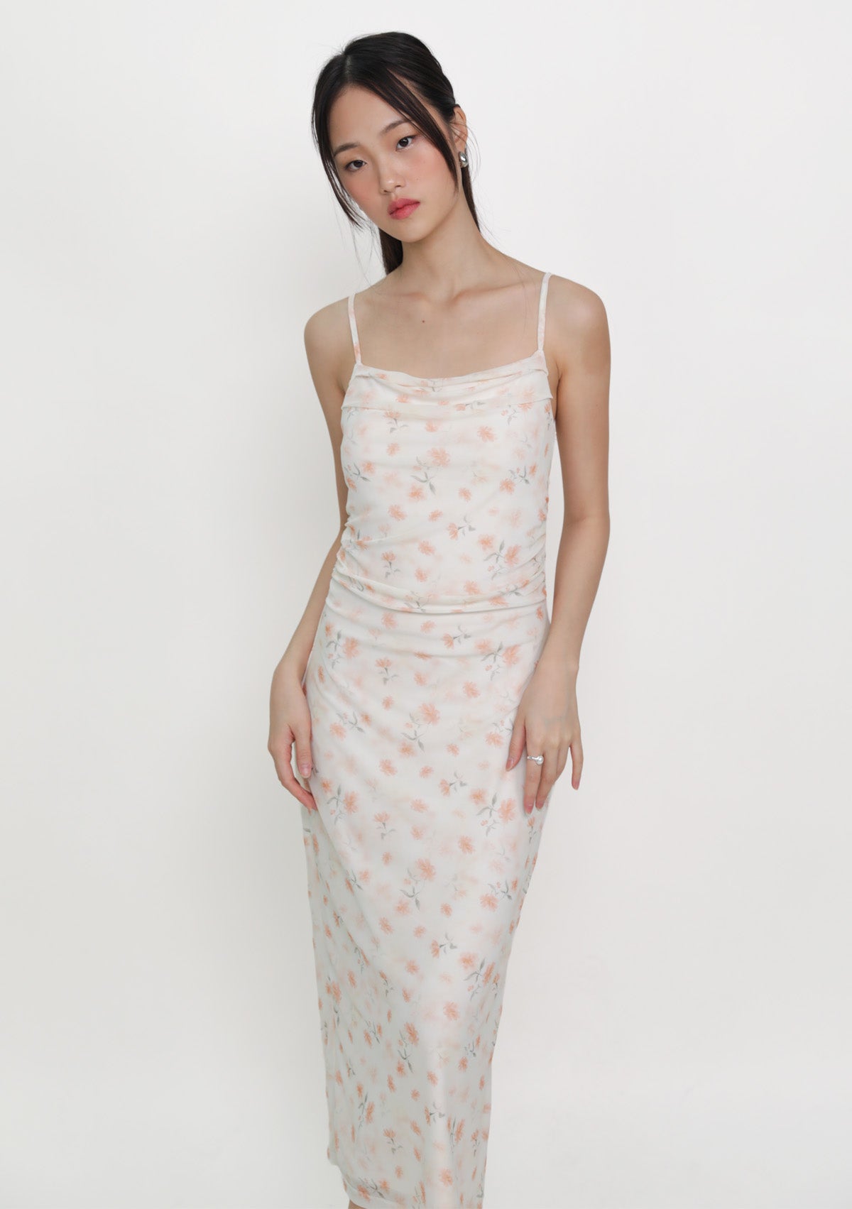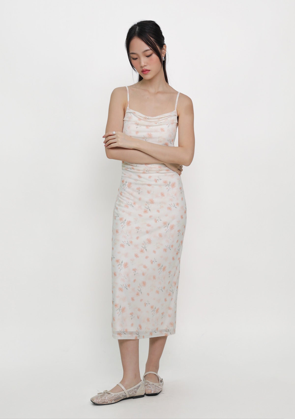 Lyanna Ruched Mesh Padded Dress is a floral mesh midi with soft ruching and built-in padding, designed for a flattering, feminine silhouette.