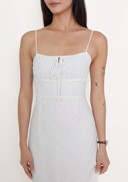 This dress is made of polyester material, inner lined, with smocked back, adjustable straps, functional self-tie front details, and a concealed back zip.