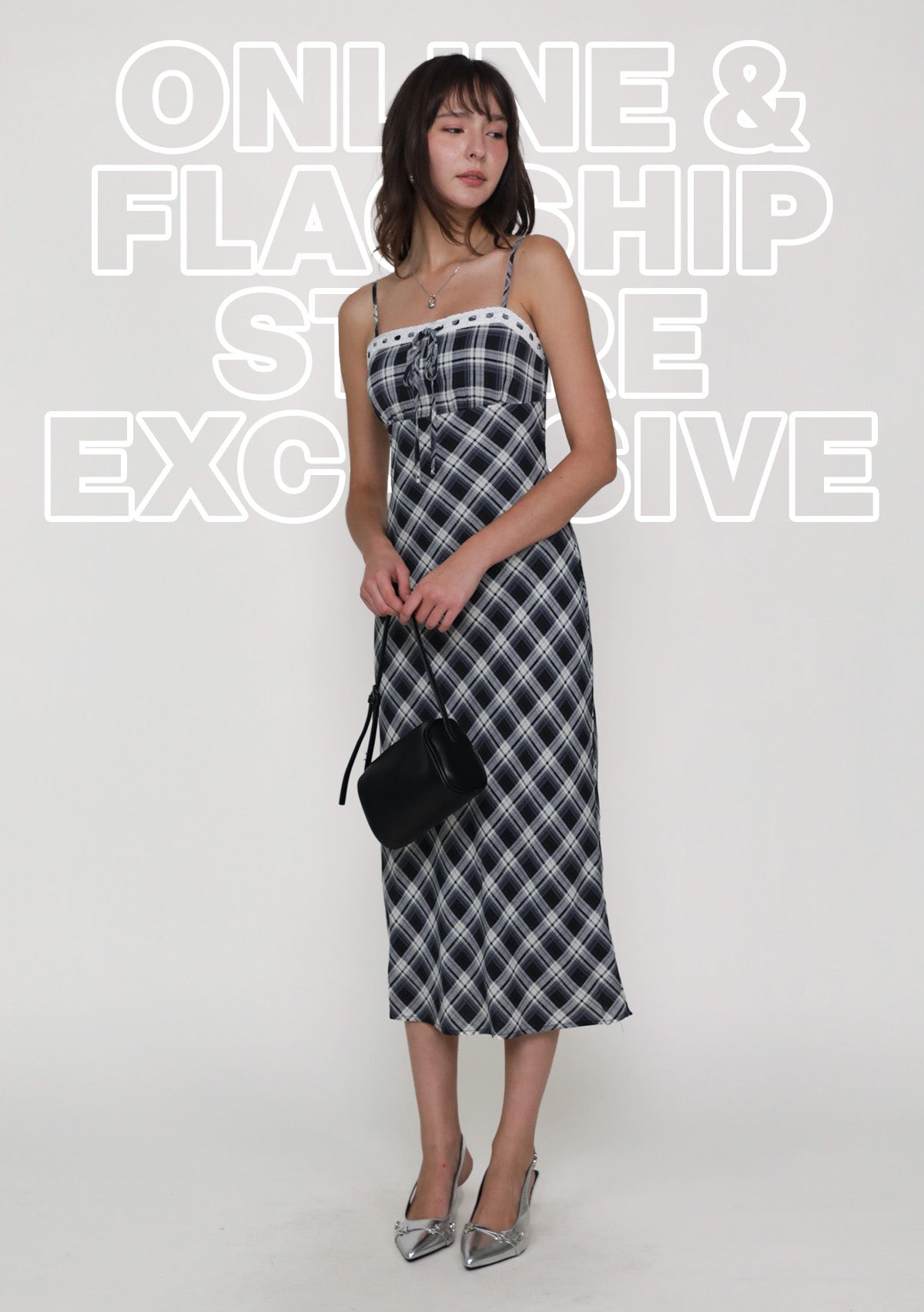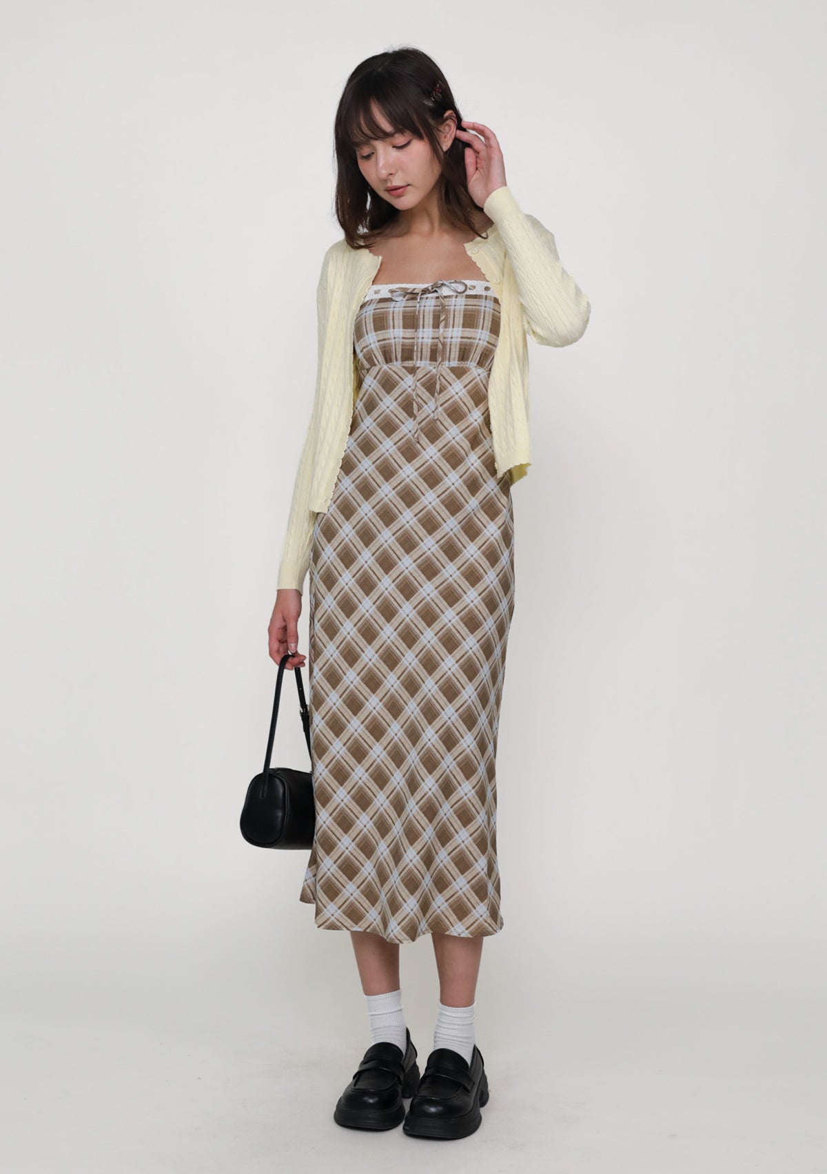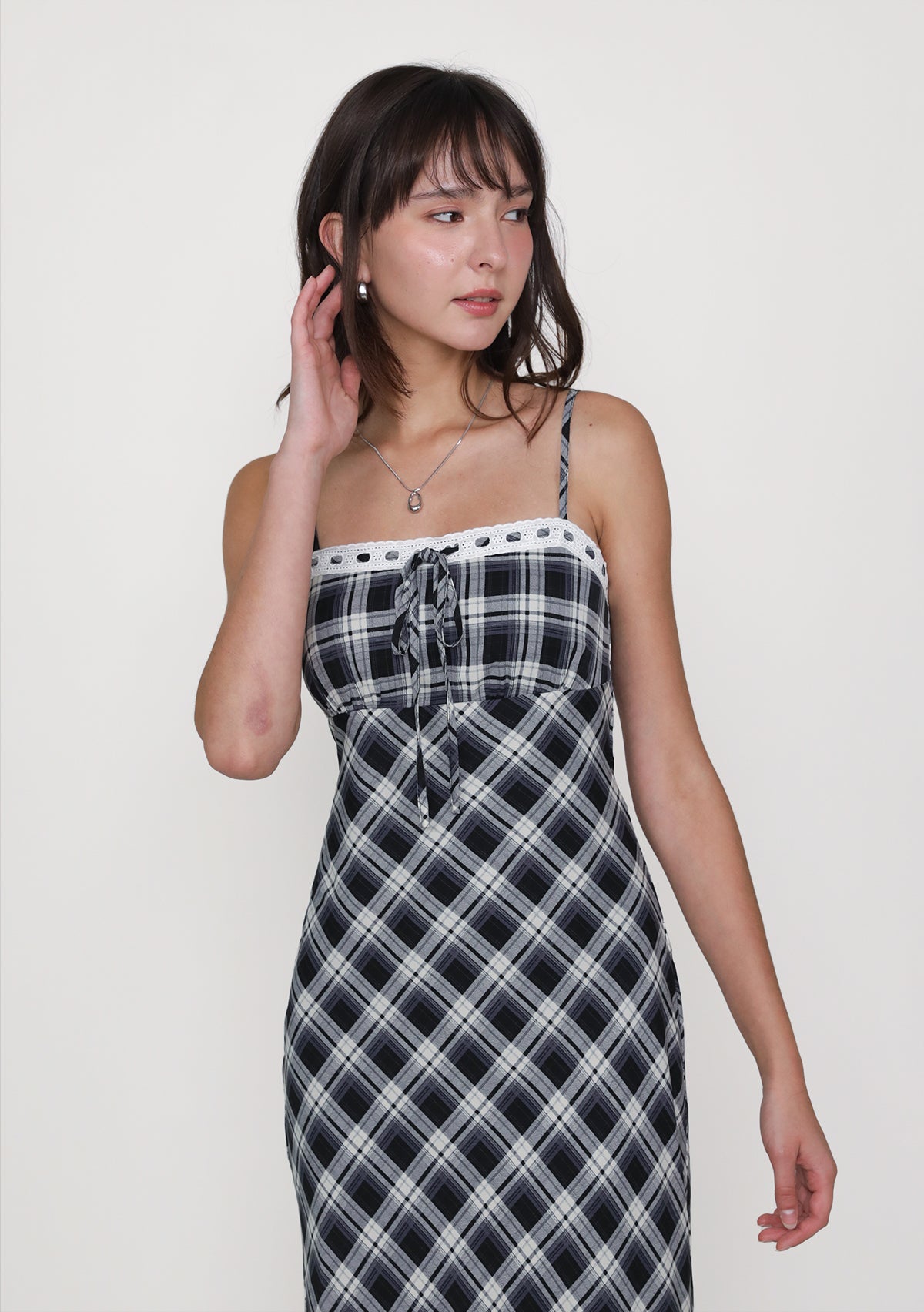 Oleander Plaid Ribbon Padded Dress is a fitted plaid midi dress made from soft polyester and finished with ribbon and lace details.