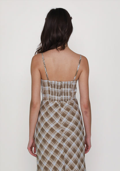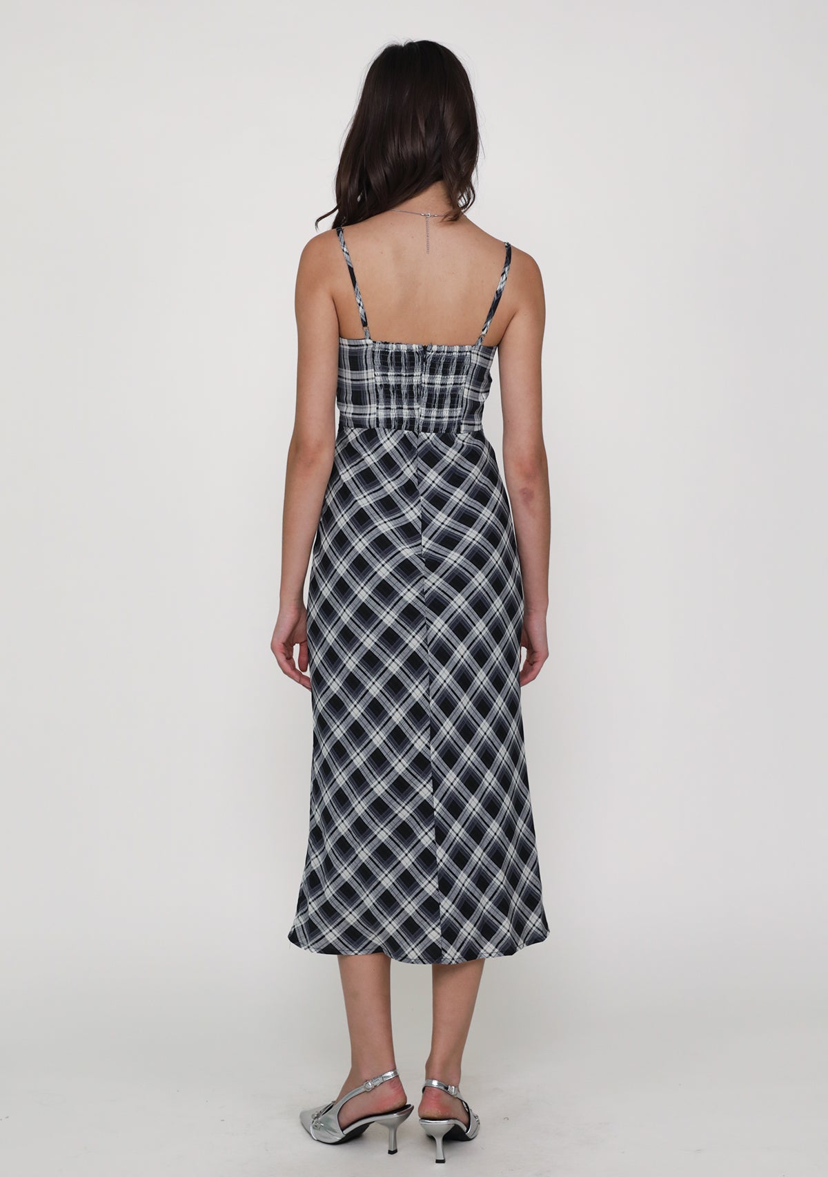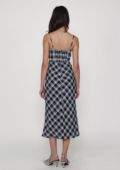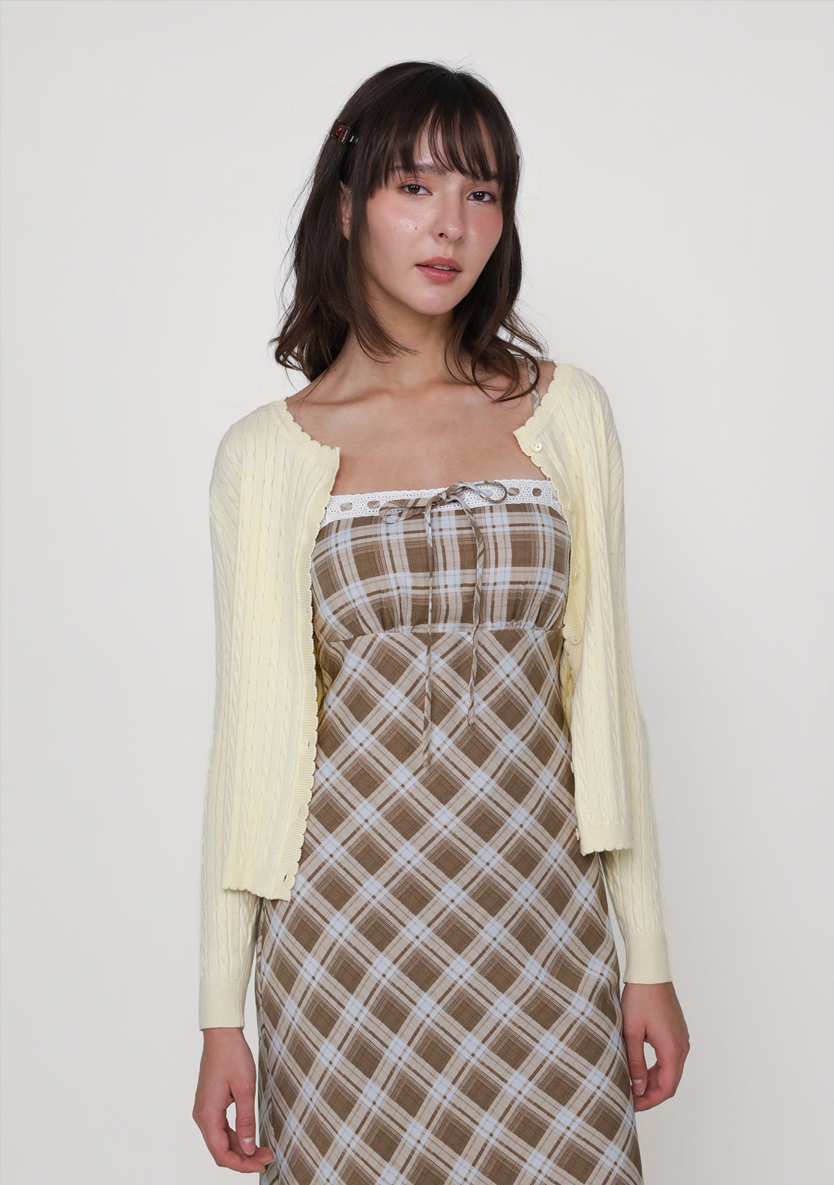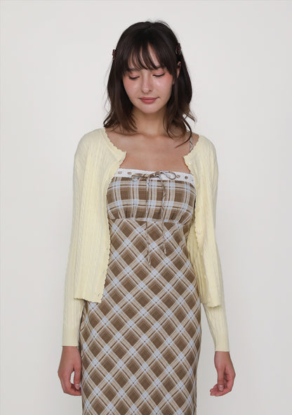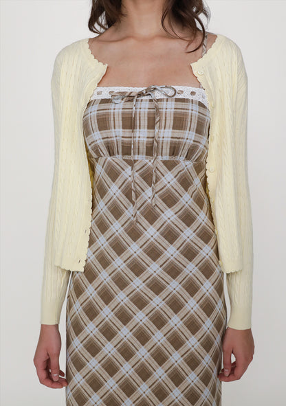 Oleander Plaid Ribbon Padded Dress is a fitted plaid midi dress made from soft polyester and finished with ribbon and lace details.