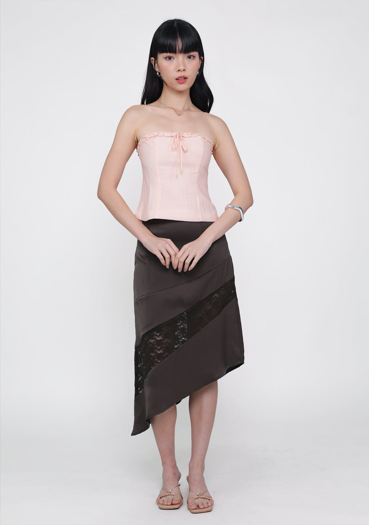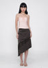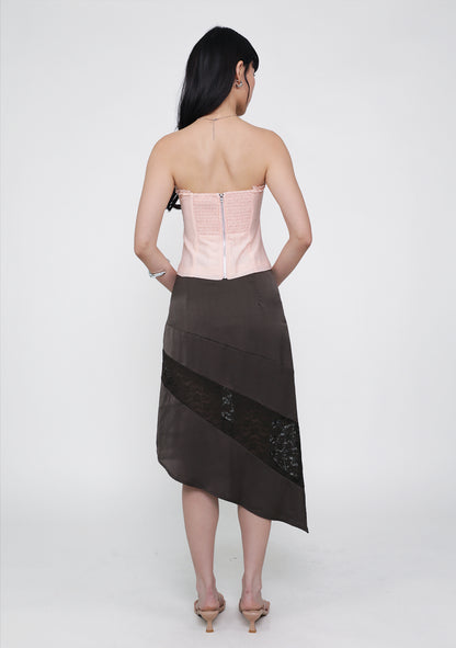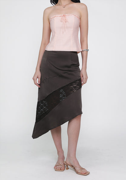 Risa Asymmetrical Lace Skirt in Americano features a layered lace design, flattering asymmetrical hem, and concealed side zip for feminine versatility.