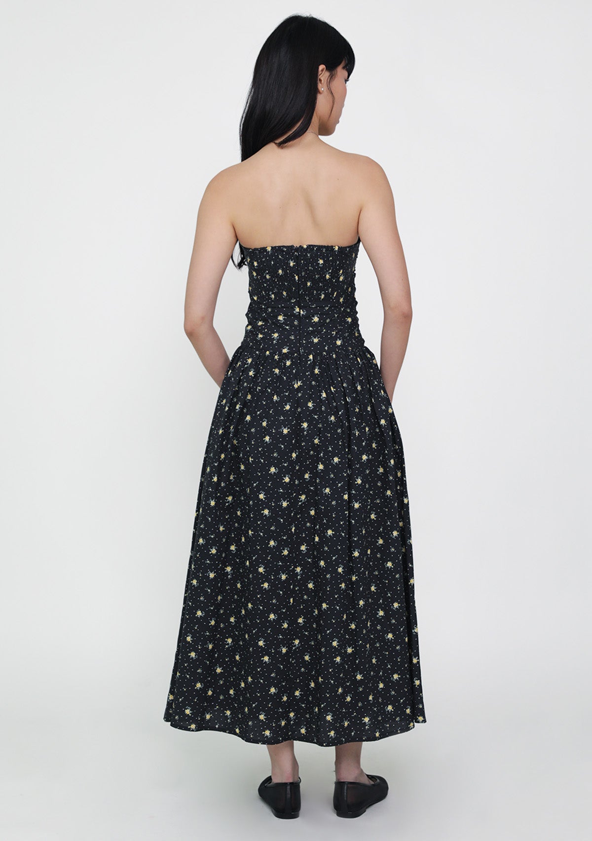This dress is made of cotton material, inner lined, with anti-slip band, removable paddings, smocked back, adjustable & removable straps, functional side pockets, and a concealed back zip.