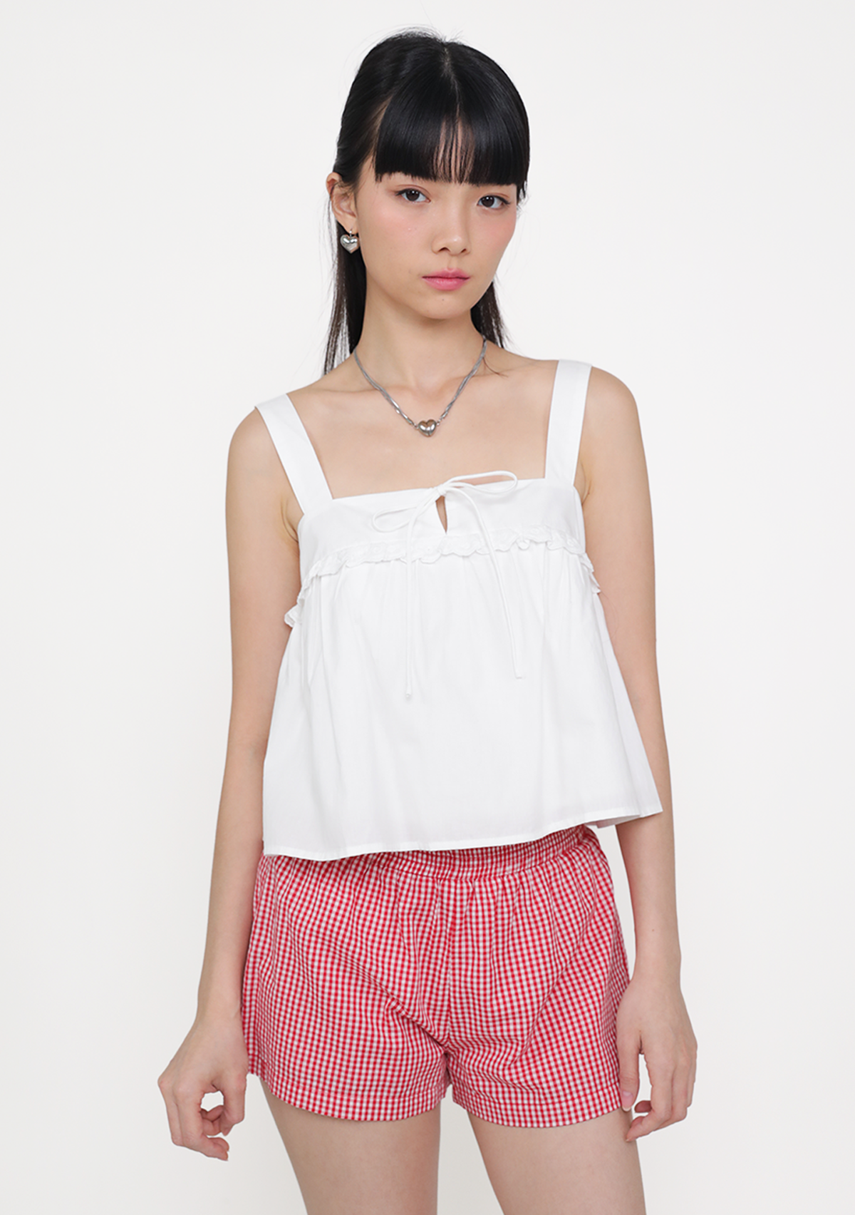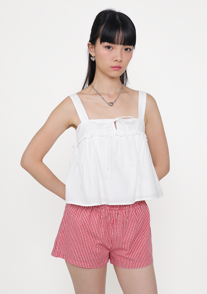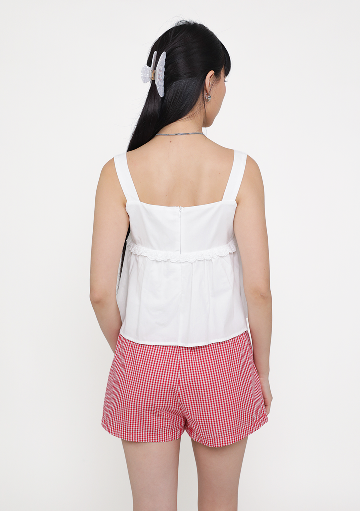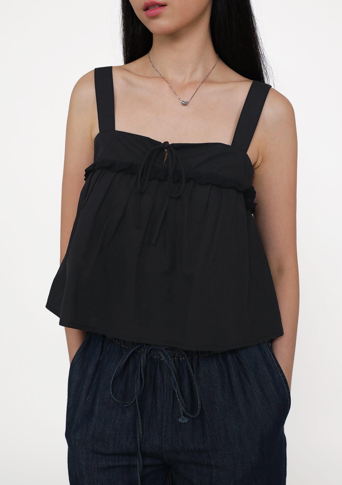 Ruby Lace Trim Babydoll Top is a feminine cotton piece with lace details and a tie-front ribbon for a soft, romantic look.