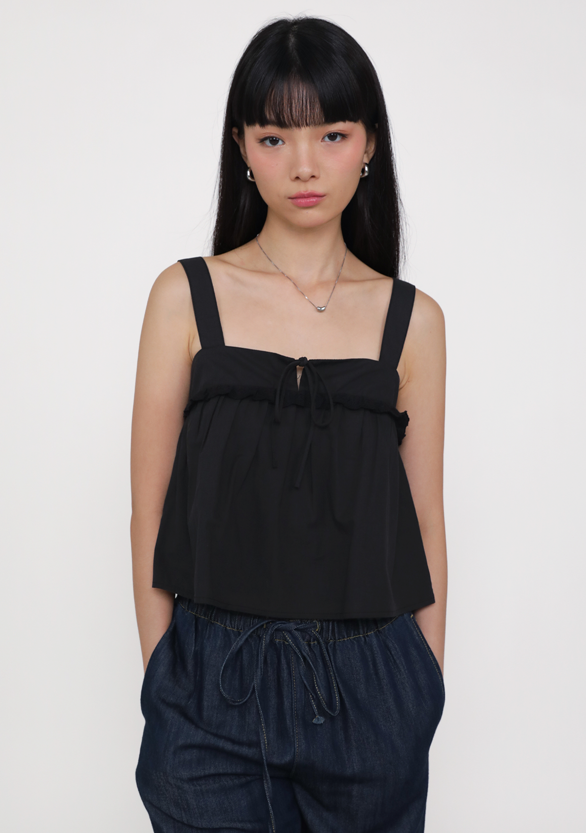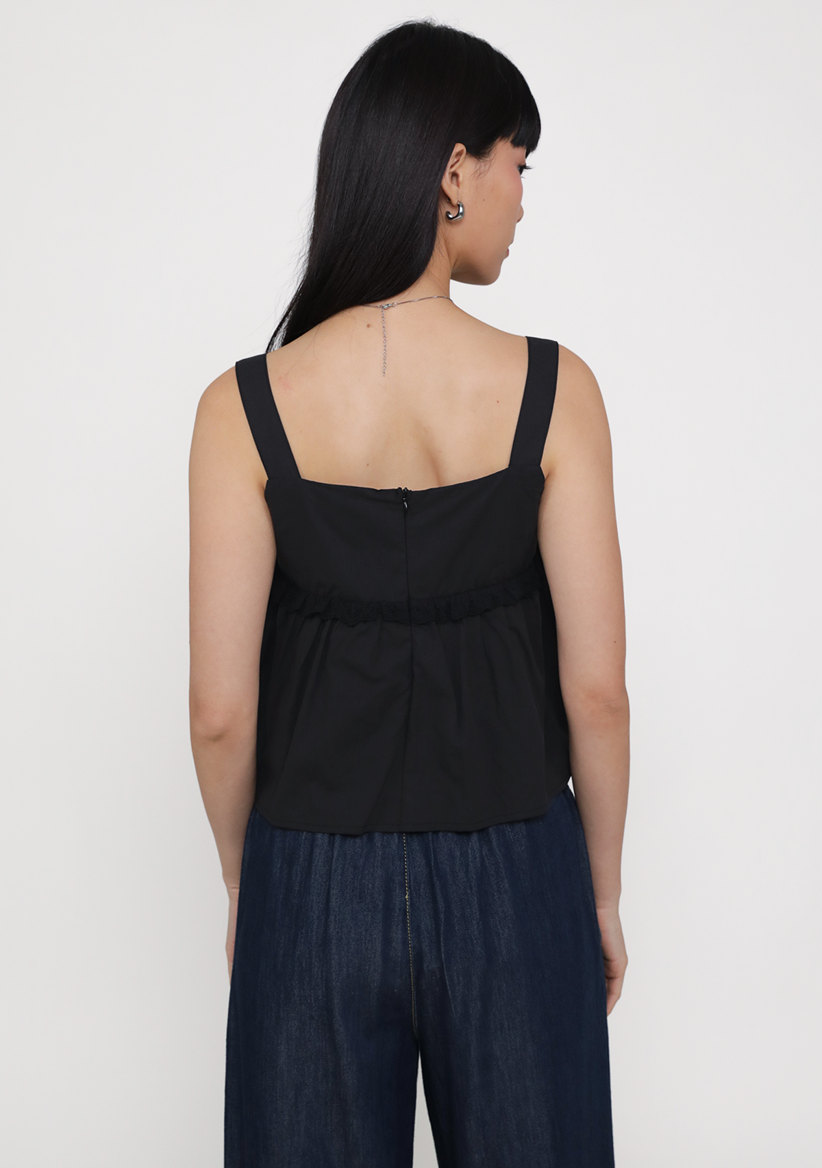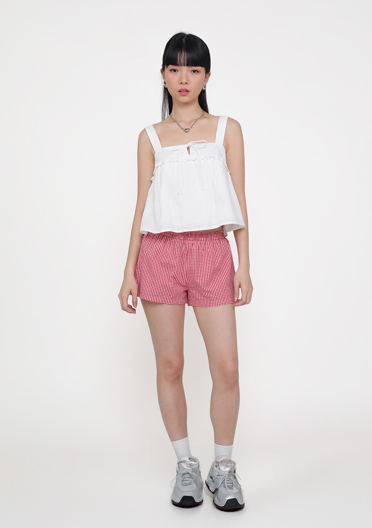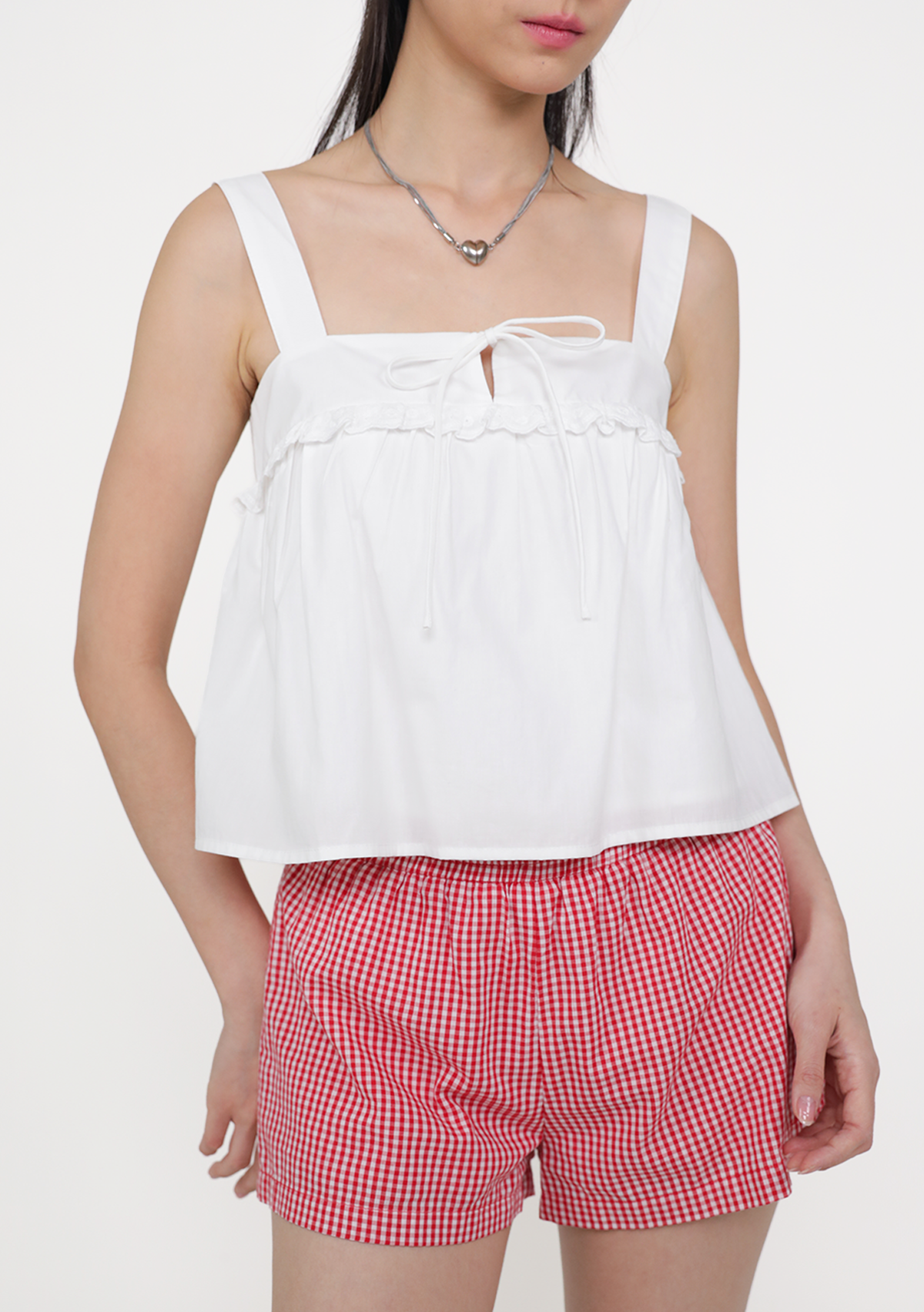 Ruby Lace Trim Babydoll Top is a feminine cotton piece with lace details and a tie-front ribbon for a soft, romantic look.