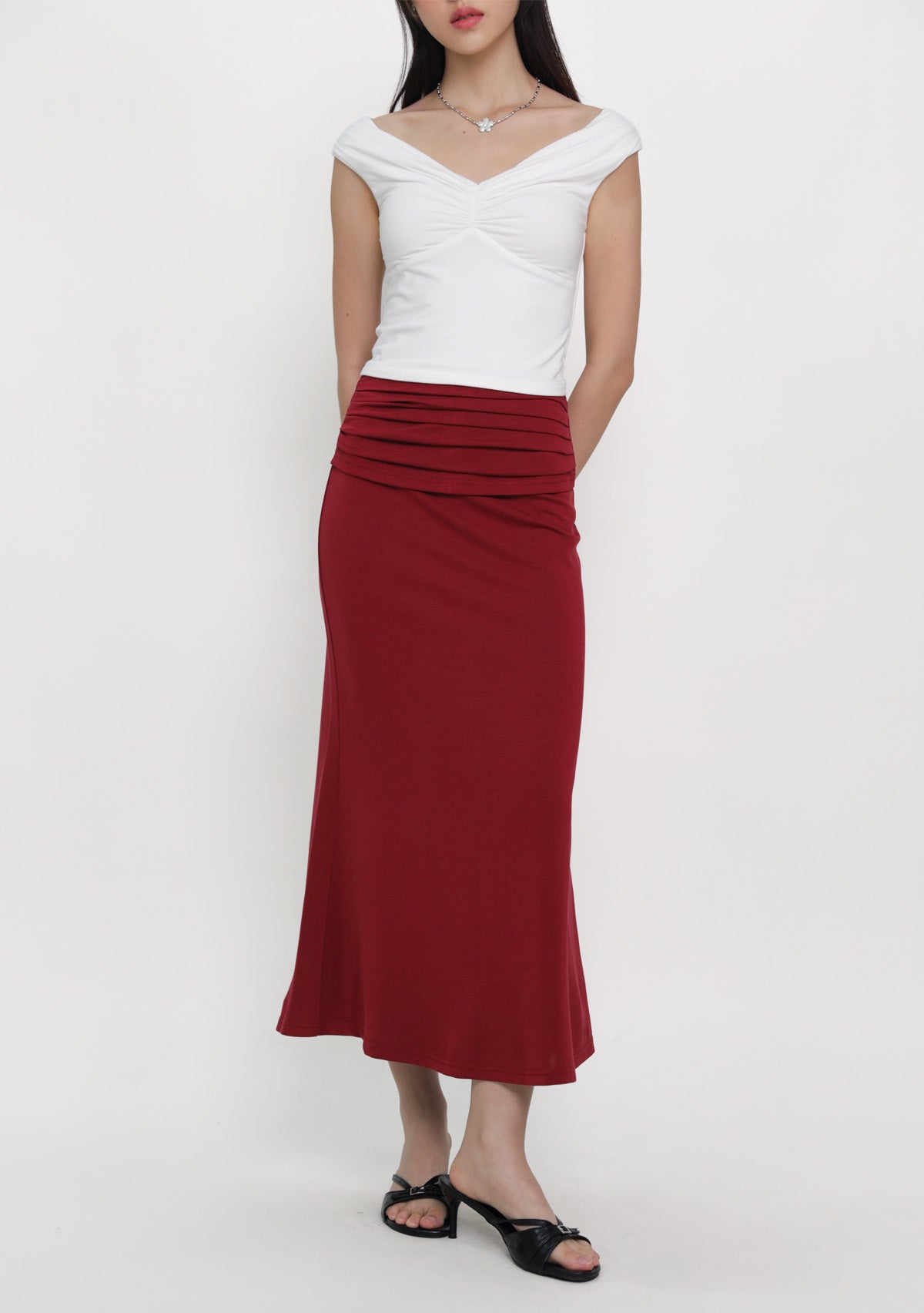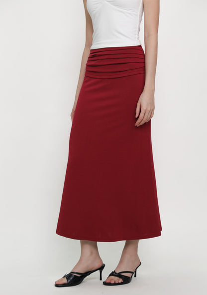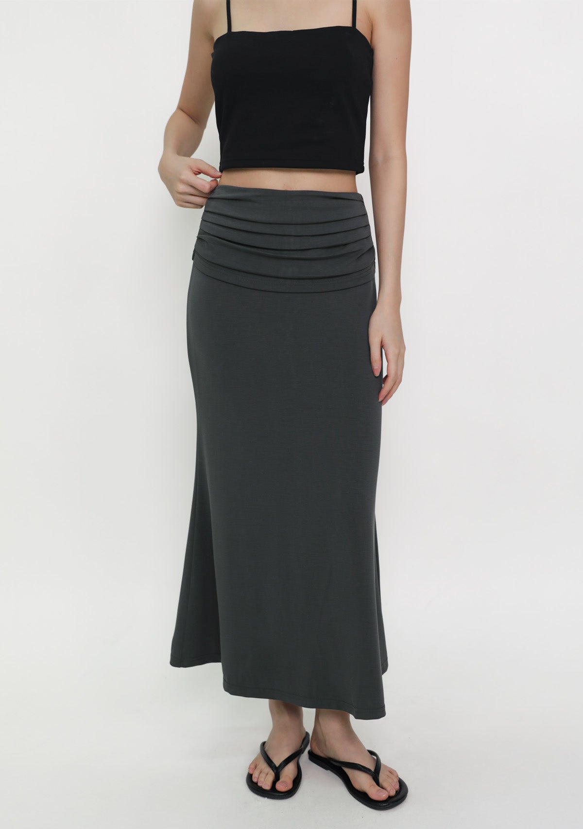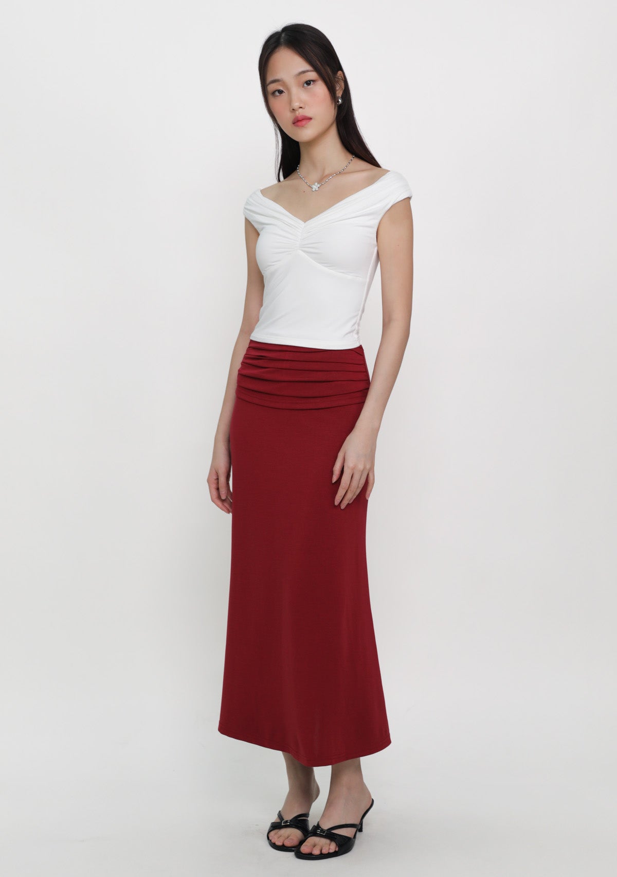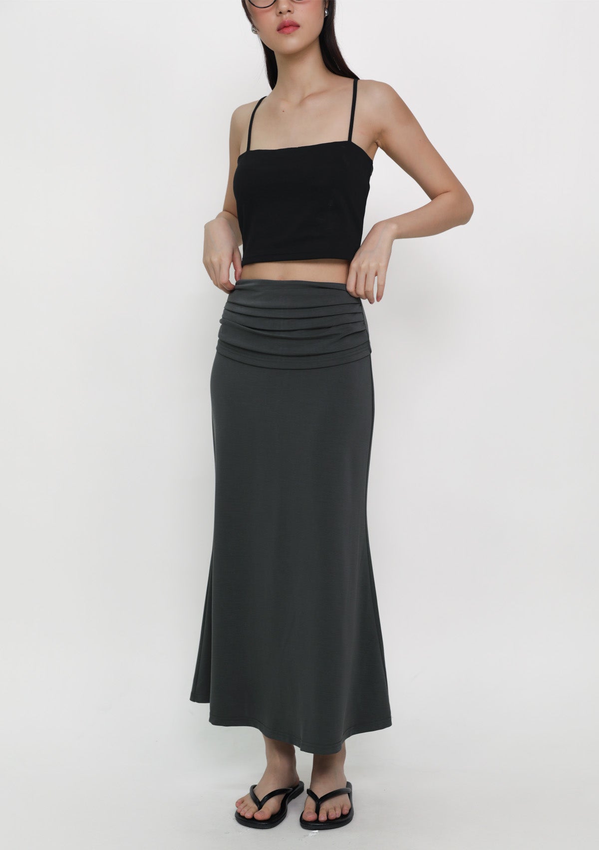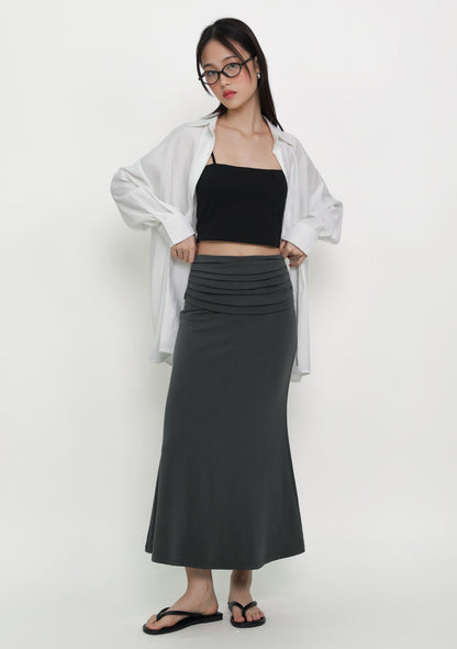 Sevyn Ruched Maxi Skirt is a butter-soft maxi skirt made from a polyester rayon spandex blend, designed with ruching and a concealed back zip.