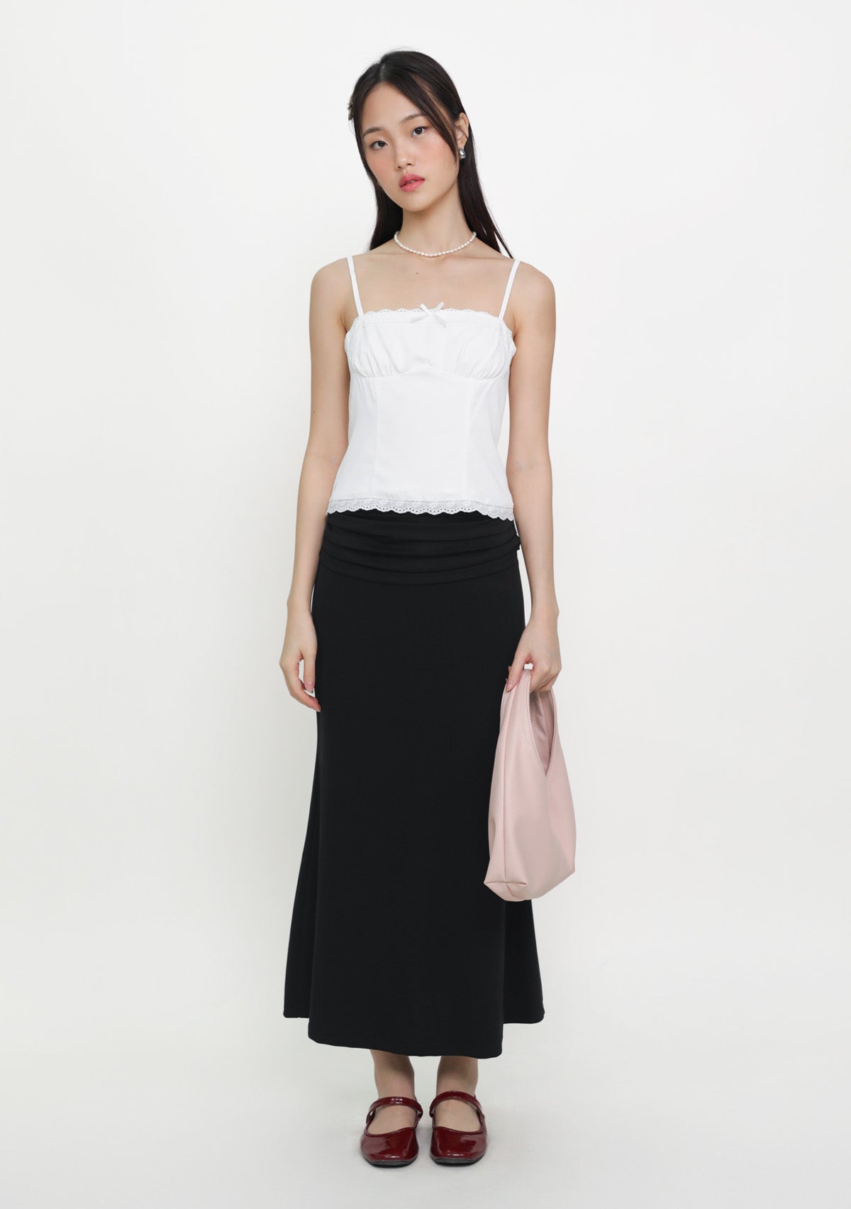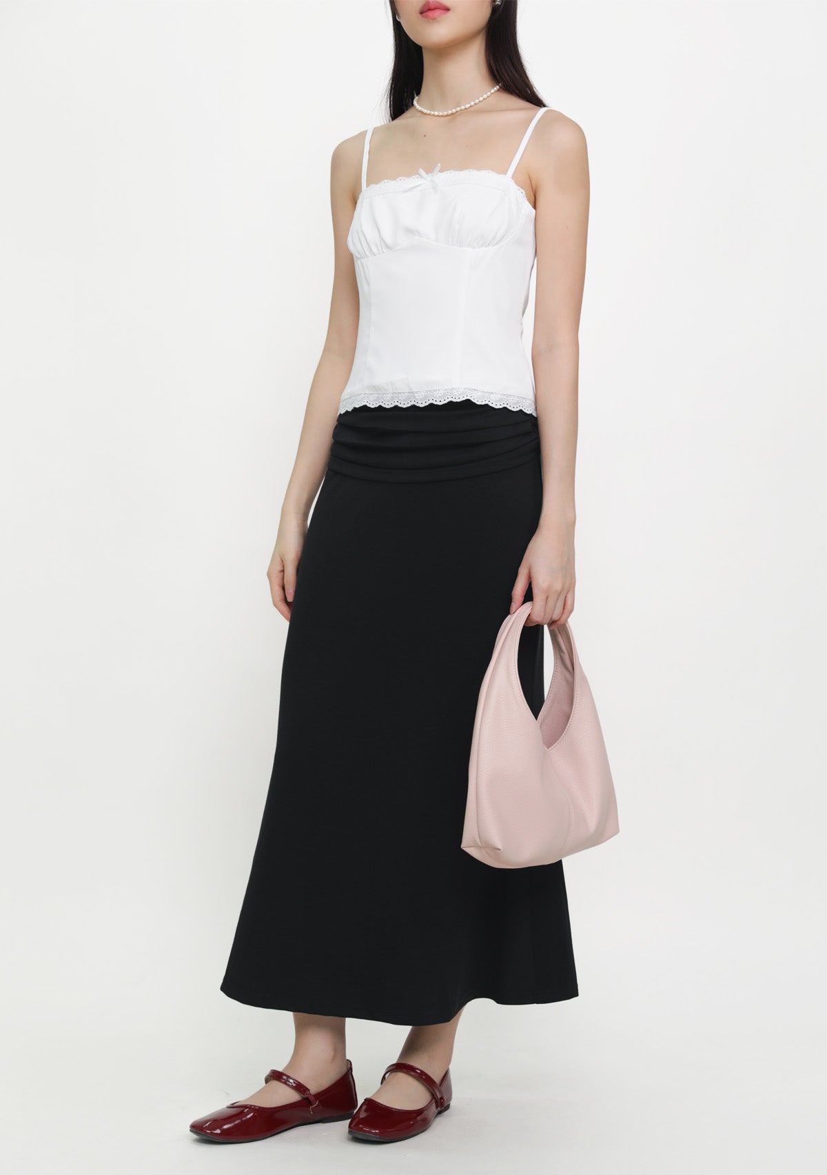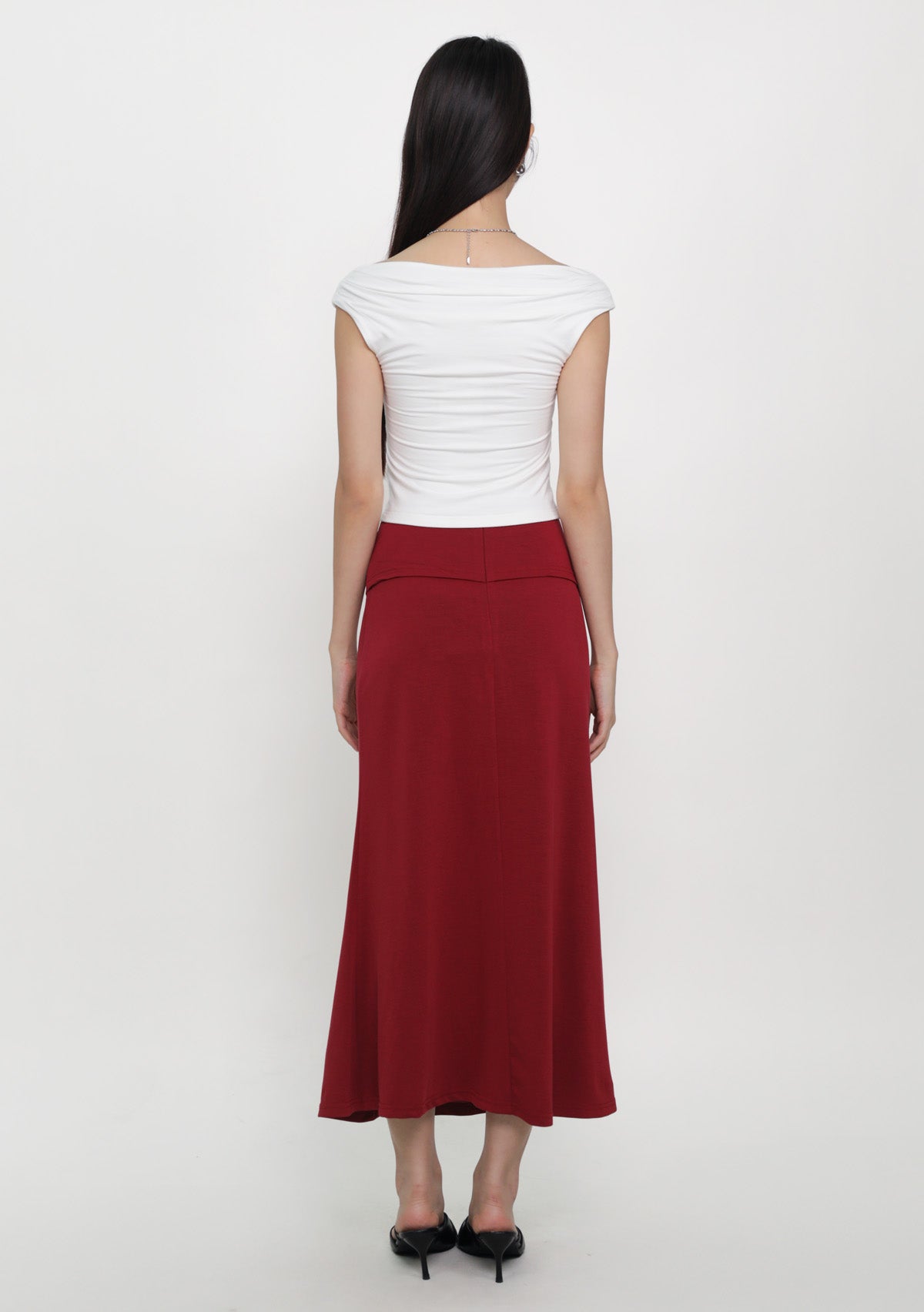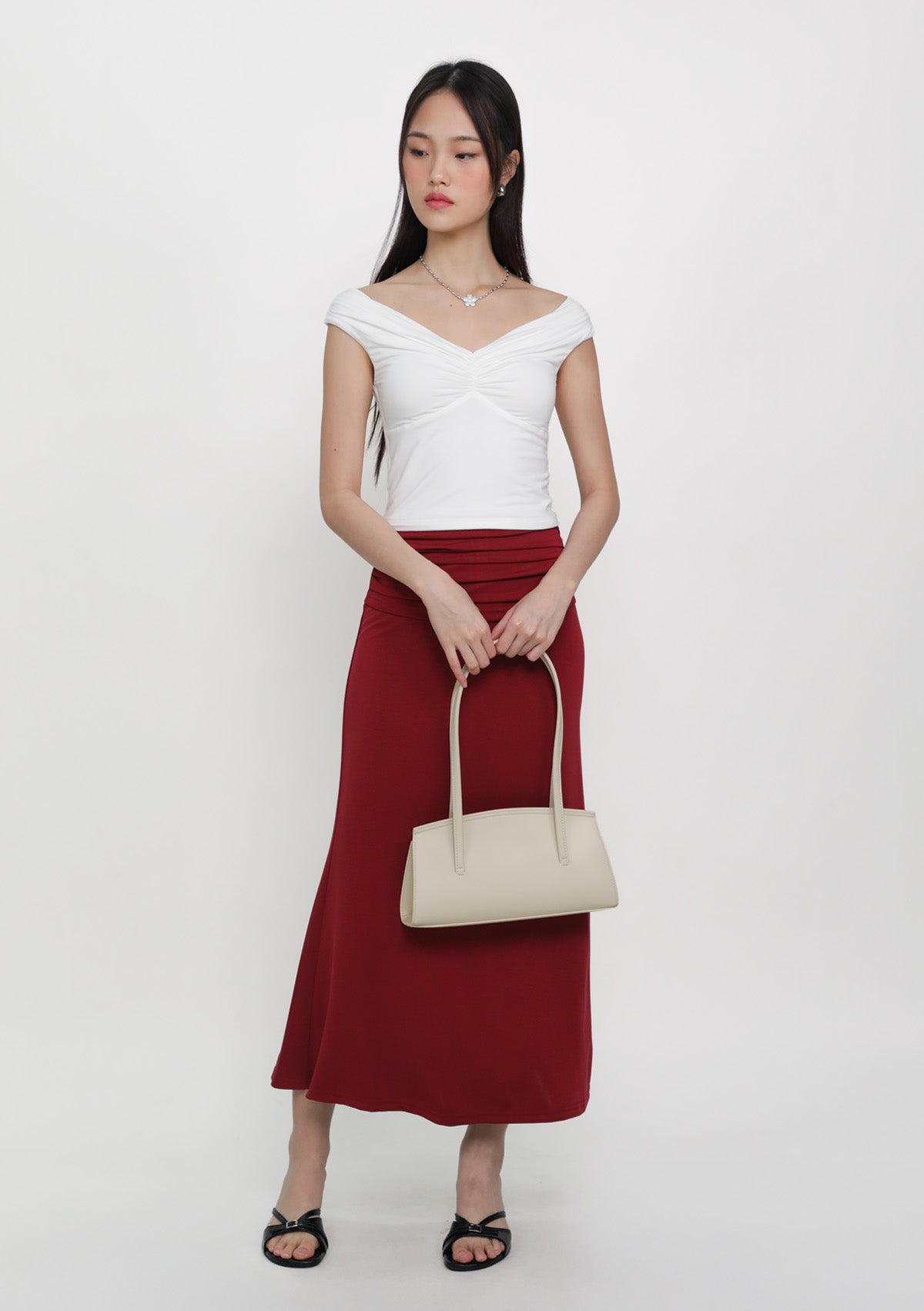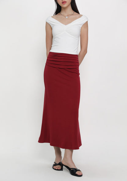 Sevyn Ruched Maxi Skirt is a butter-soft maxi skirt made from a polyester rayon spandex blend, designed with ruching and a concealed back zip.