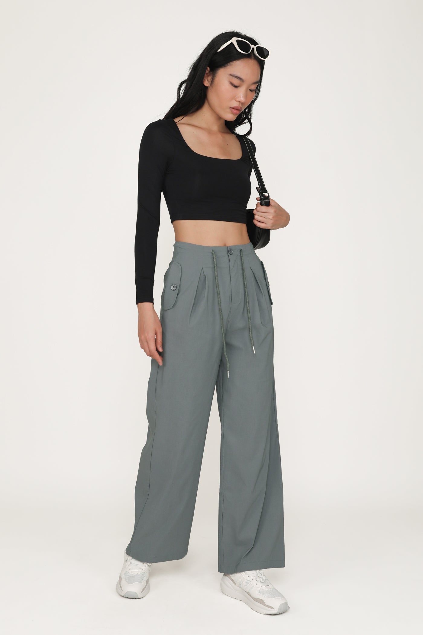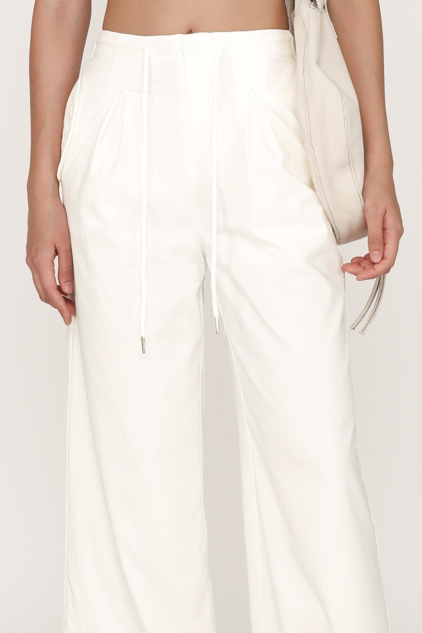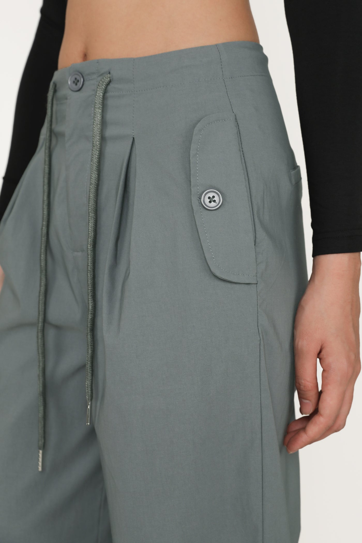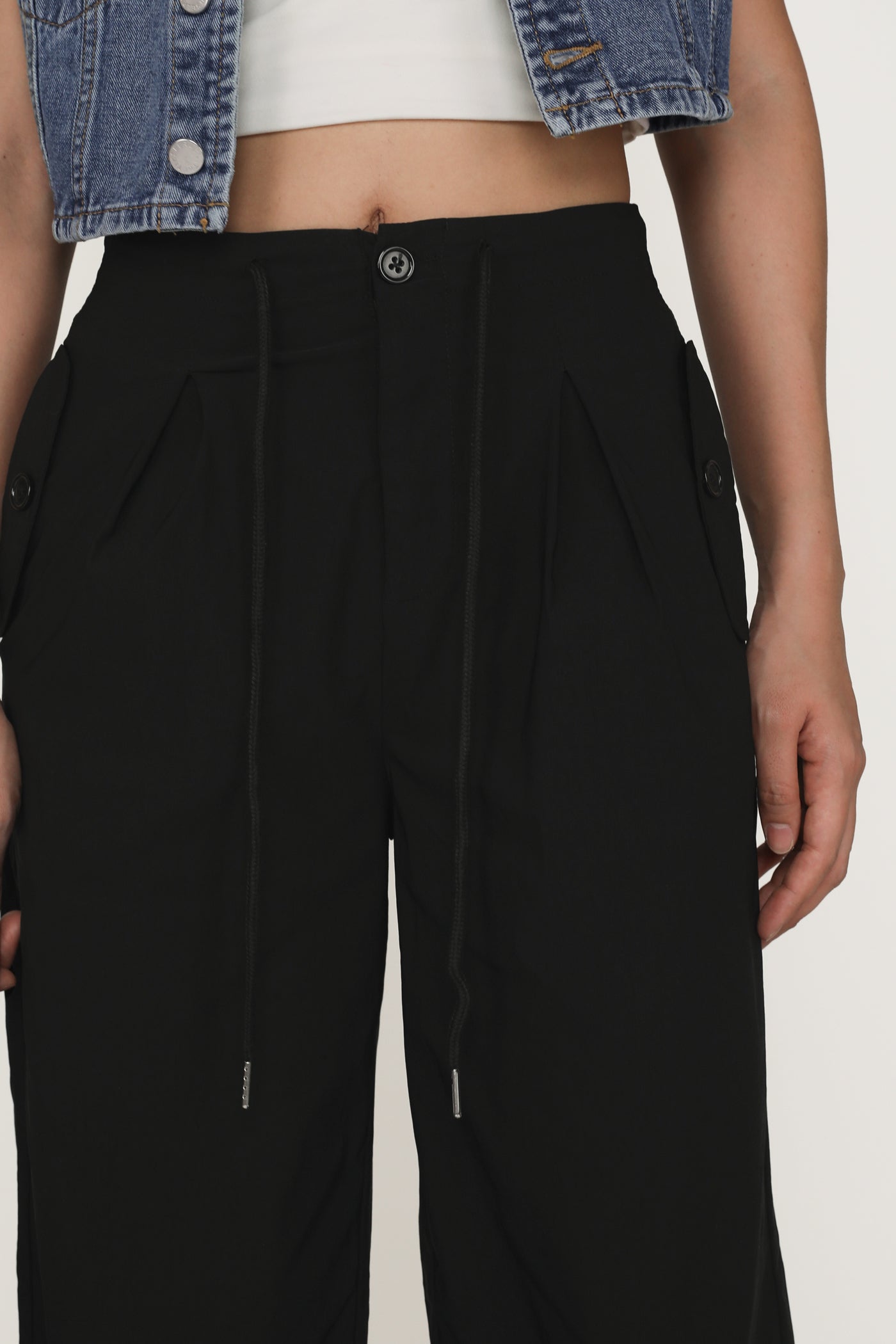 These pants are made of non lined nylon polyester. They are complete with functional side pockets, button and zip closure, and drawstring details at the front.