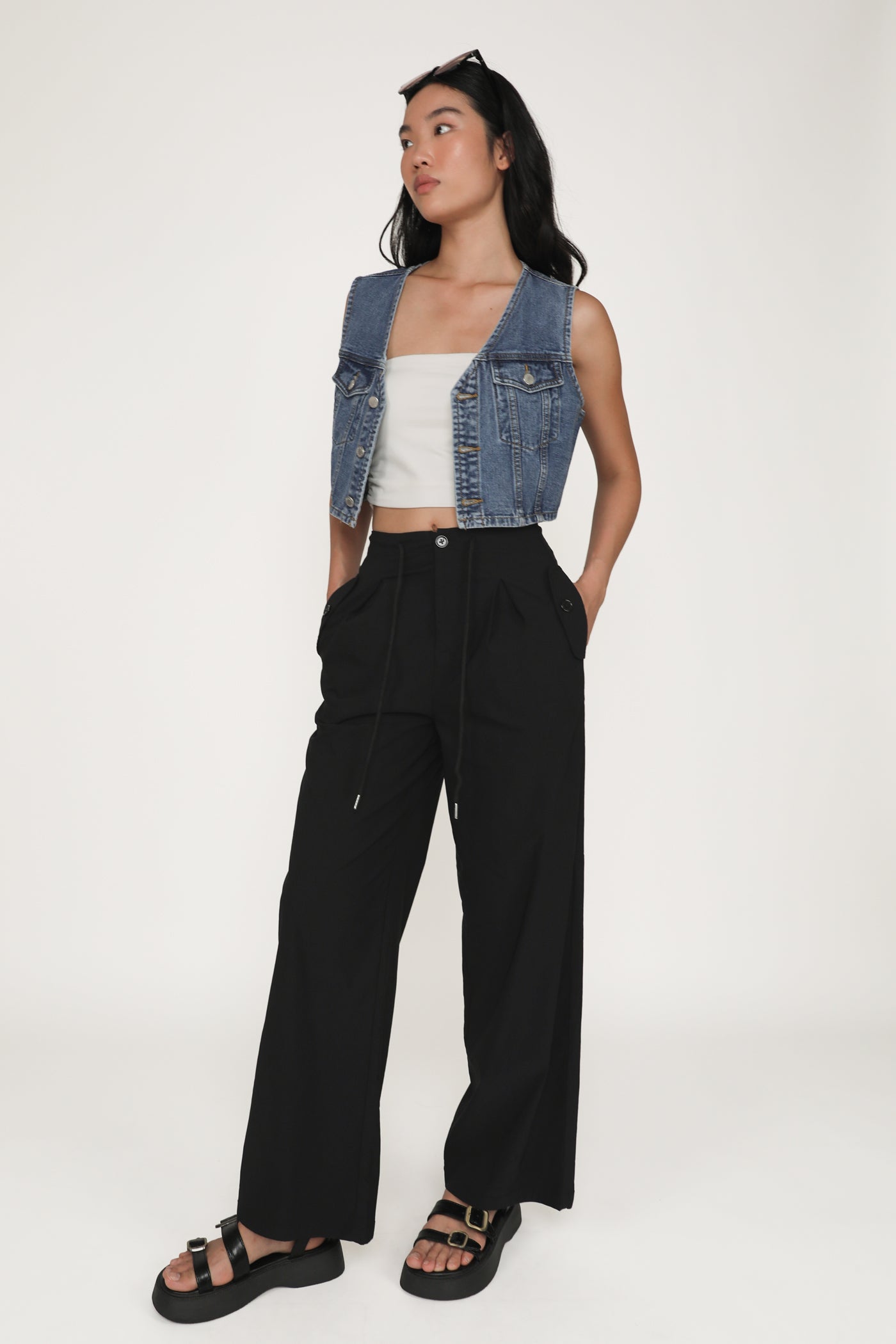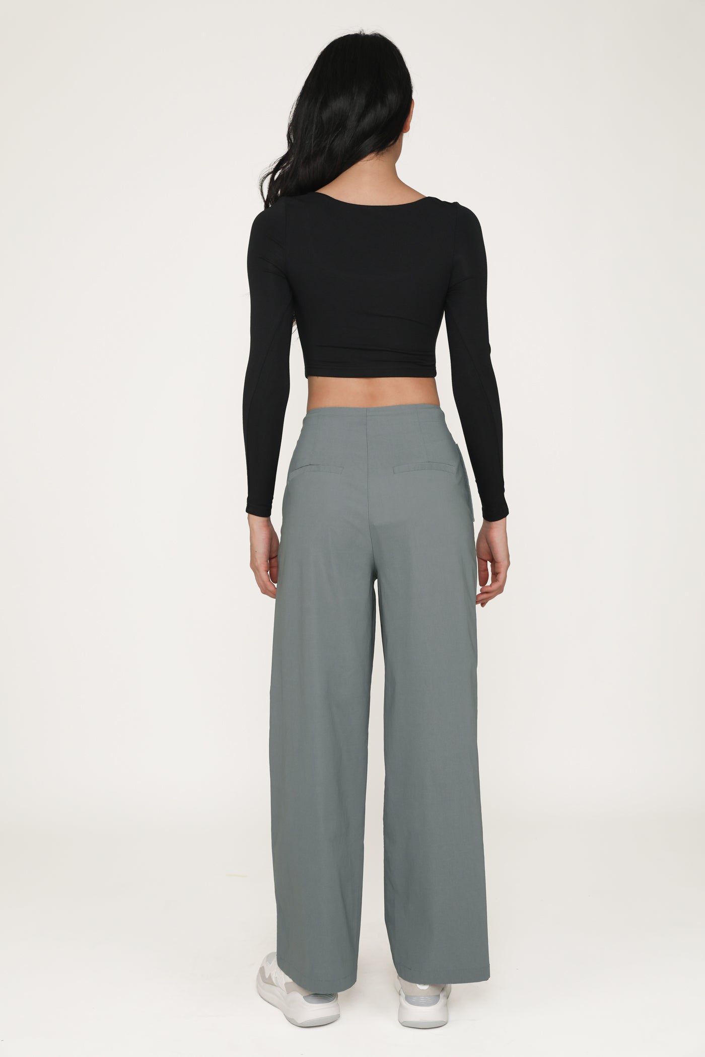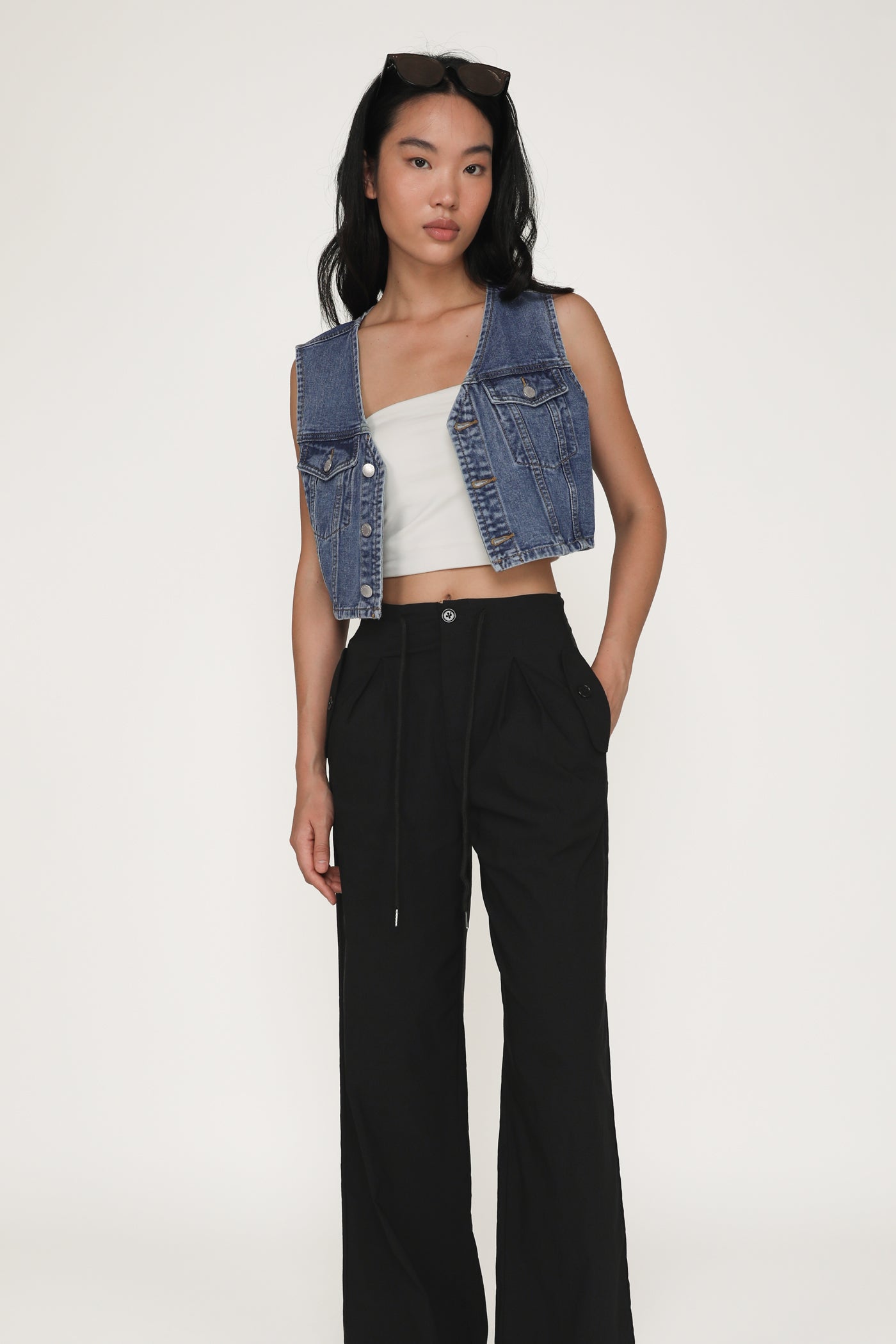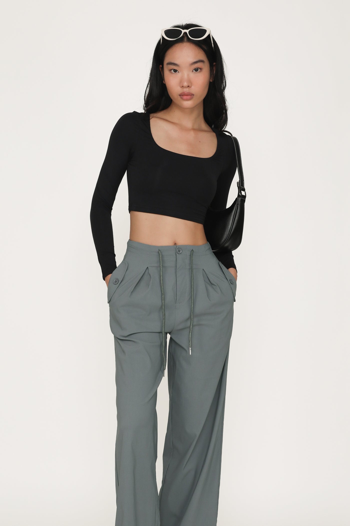 These pants are made of non lined nylon polyester. They are complete with functional side pockets, button and zip closure, and drawstring details at the front.