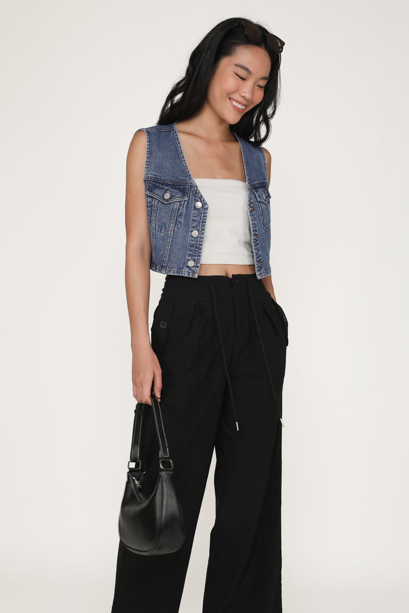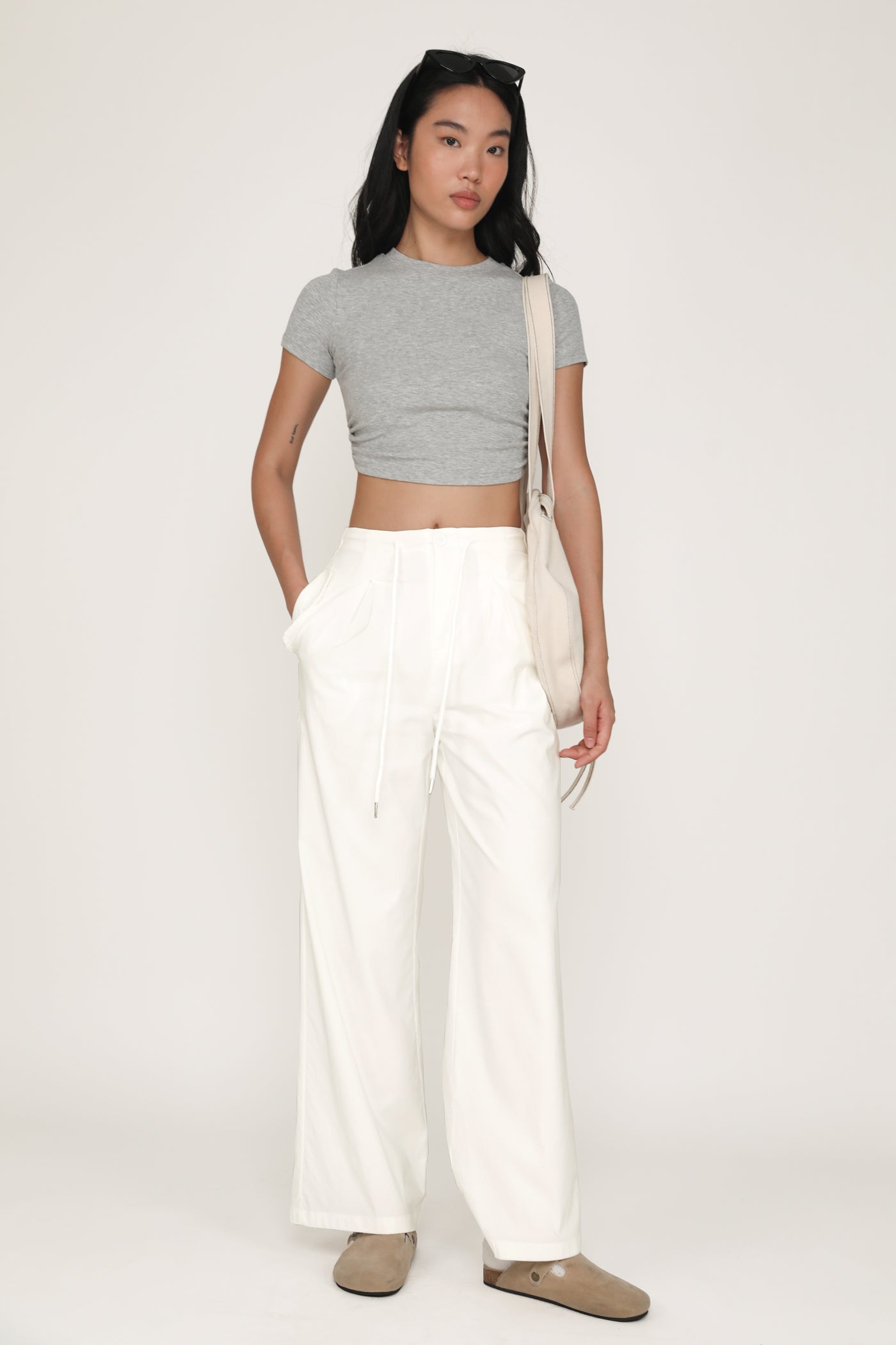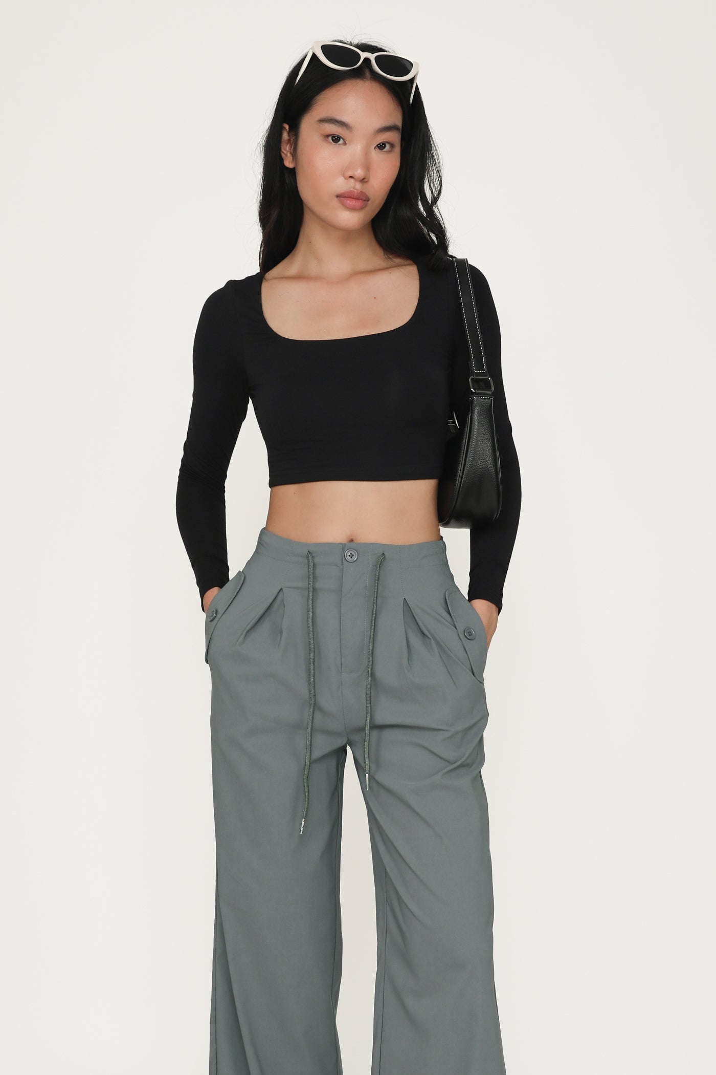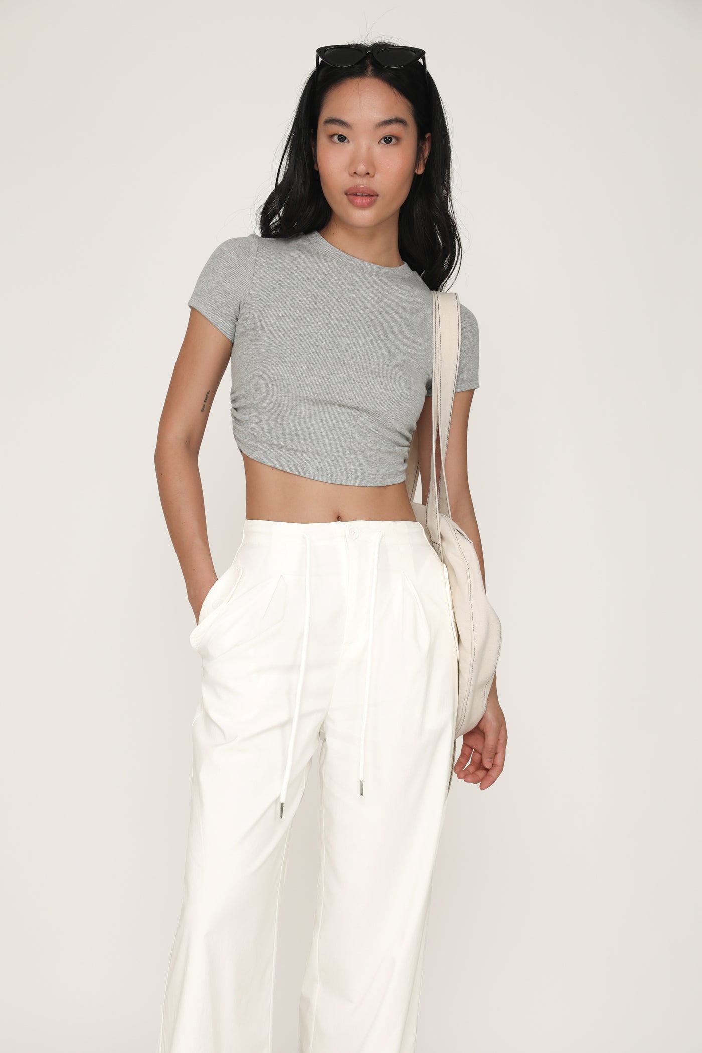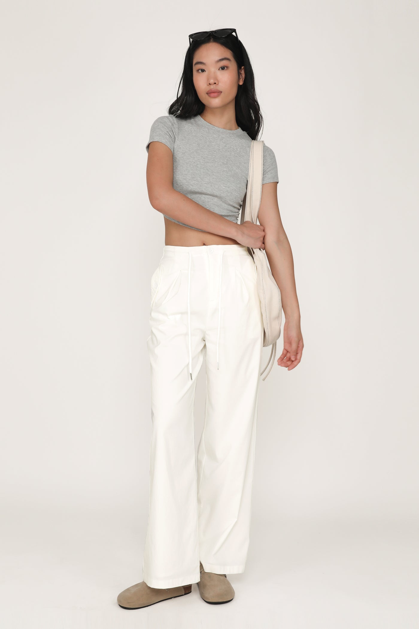 These pants are made of non lined nylon polyester. They are complete with functional side pockets, button and zip closure, and drawstring details at the front.