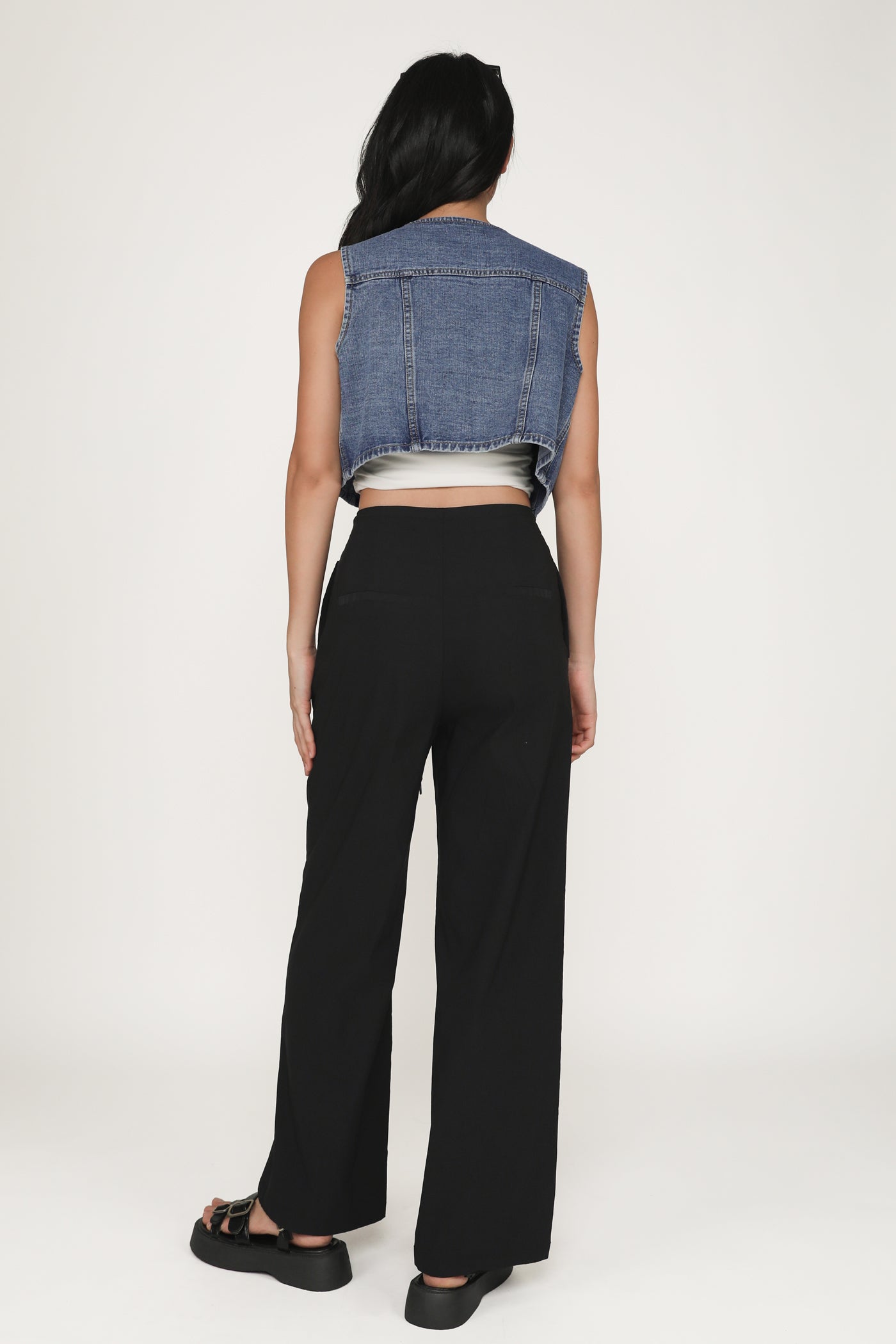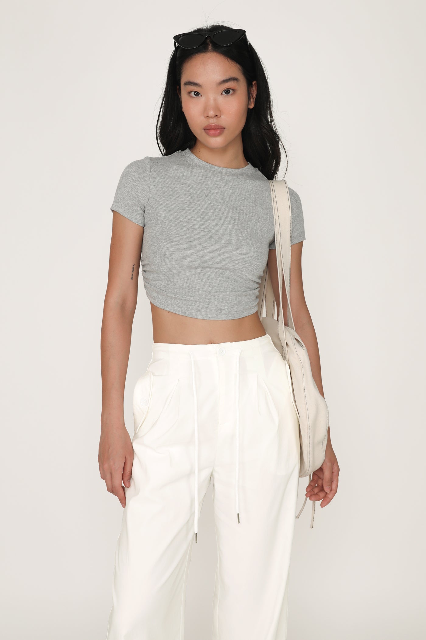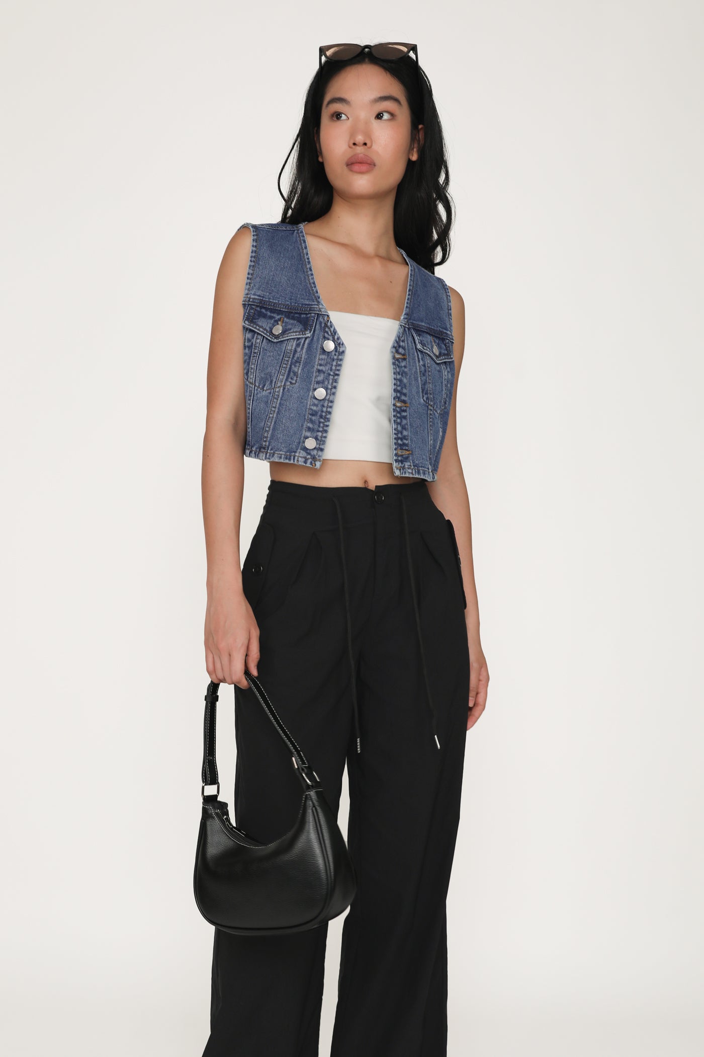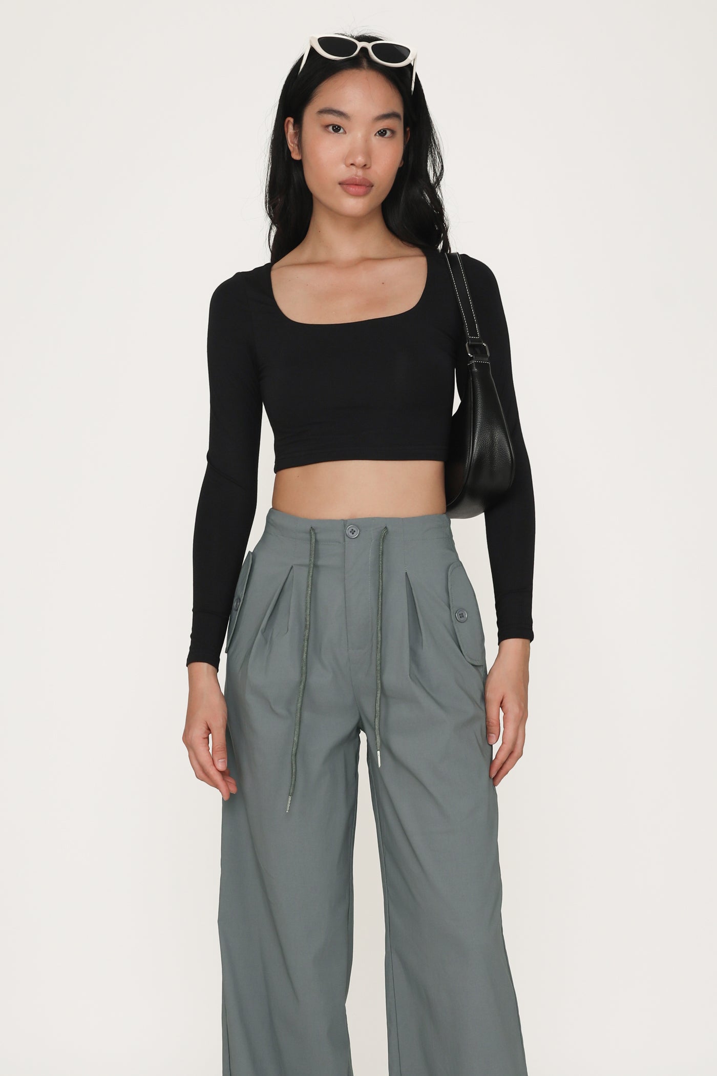 These pants are made of non lined nylon polyester. They are complete with functional side pockets, button and zip closure, and drawstring details at the front.
