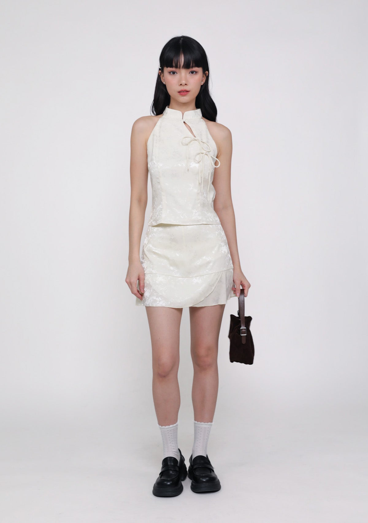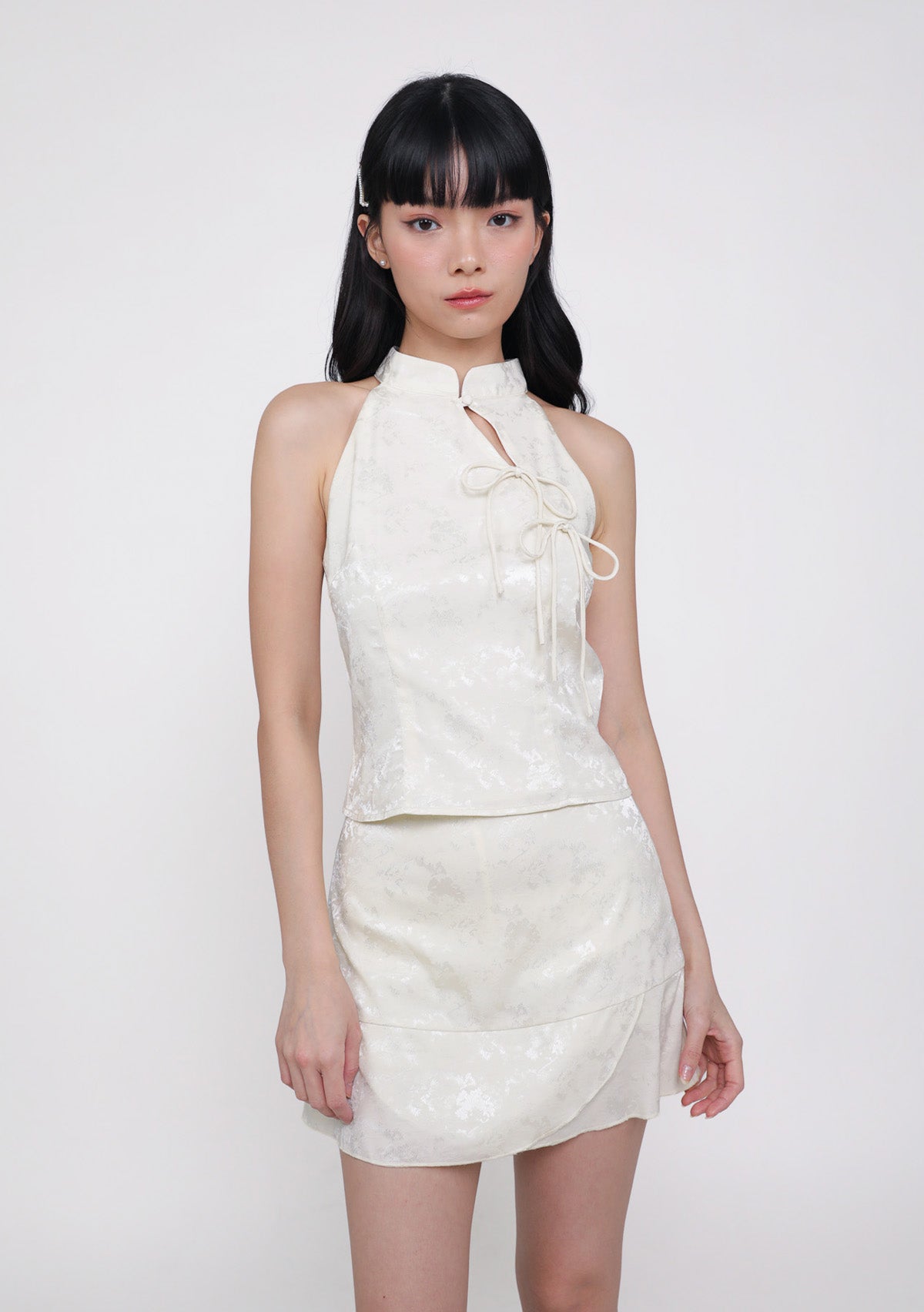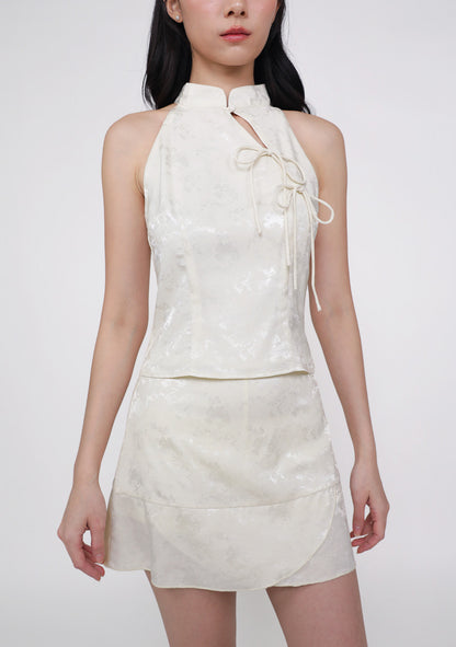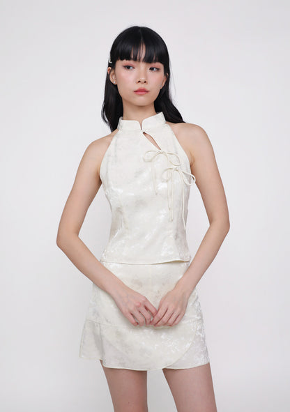 Yun Ribbon Qipao Halter Top in jacquard cream features elegant ribbon details, a halter neckline, and a flattering lined silhouette.